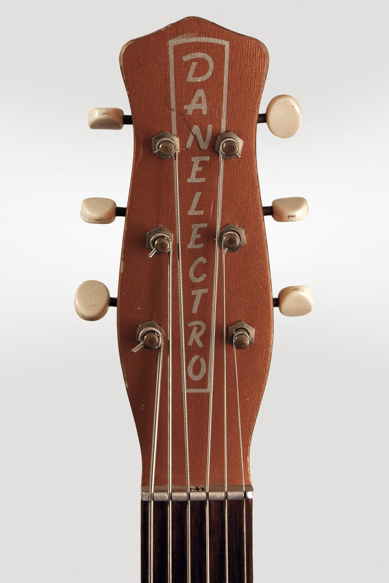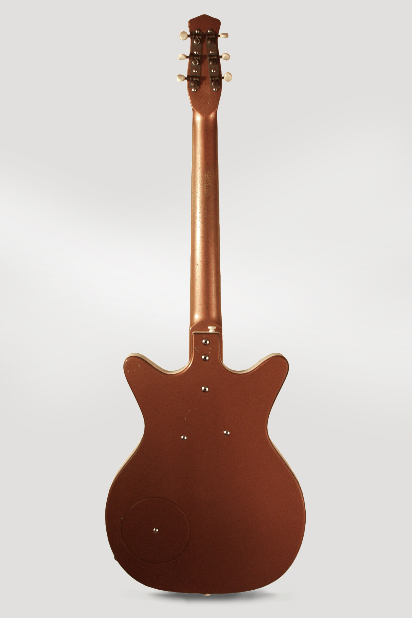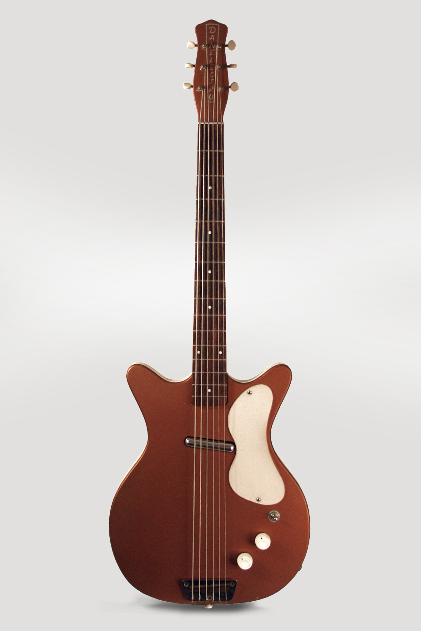 This is a good-playing and all original example of a fairly uncommon Danelectro. While the original Shorthorn guitar and 4-string bass are fairly common as old Dan-o's go, this 6-string bass was made in far smaller numbers than either and is a much more difficult find. This copper-top beauty is a very early example of this model and has all the "classic" 1959 Dan-o features: semi-hollow Masonite and pine body with rear "trap hatch" control access, white pebble vinyl side covering, clear celluloid pickguard with vinyl beneath. The single lipstick tube pickup is controlled with a volume and tone knob, the latter mated to a 3-way tone modifier switch that selects either a bass or treble roll-off. The short 15-fret neck has a Brazilian rosewood fingerboard and is topped with the trademark "coke bottle" headstock with vertical silver Danelectro logo. This is a great sounding 6-string bass/Baritone guitar with the classic Danno twang factor, even with a single pickup.