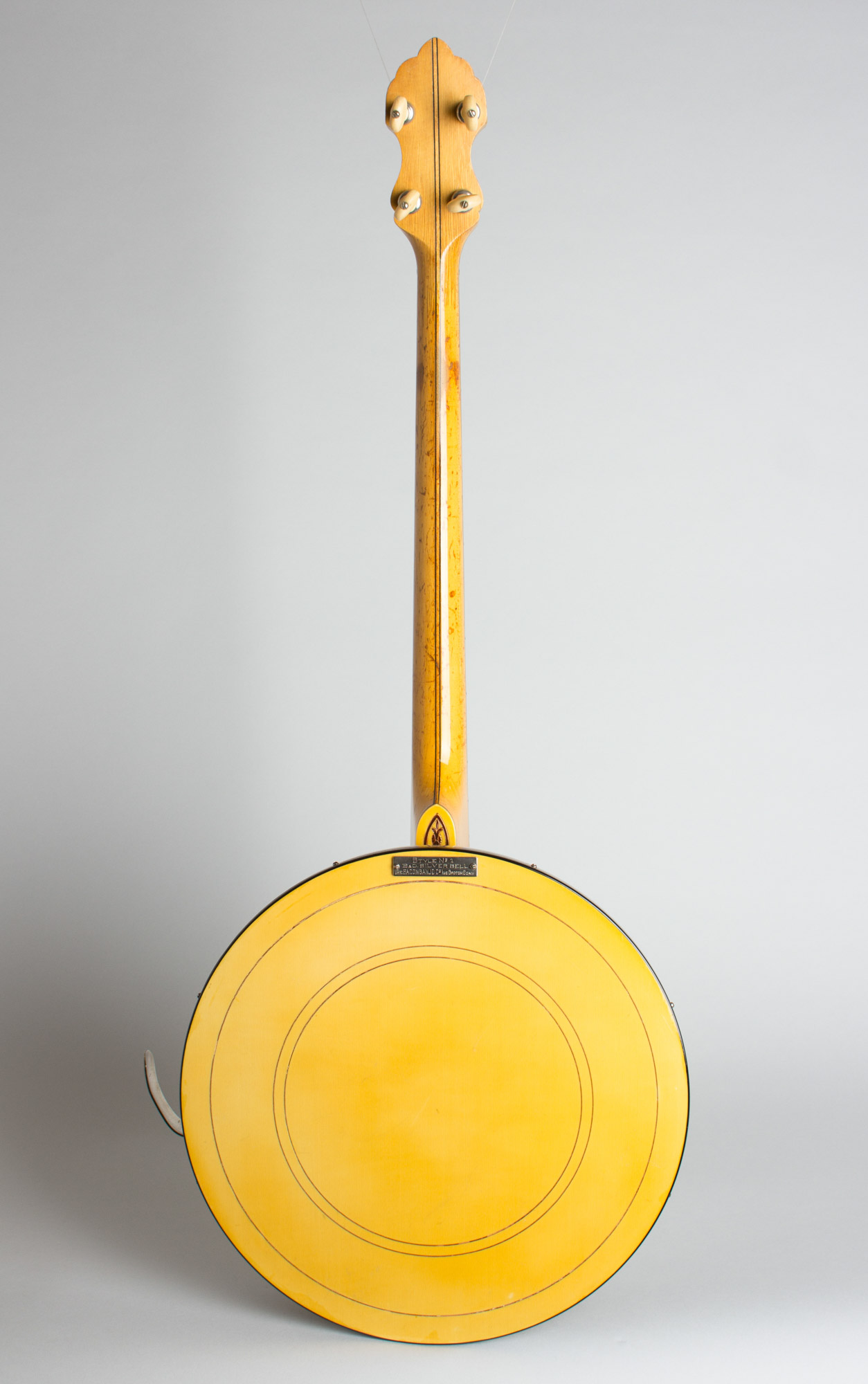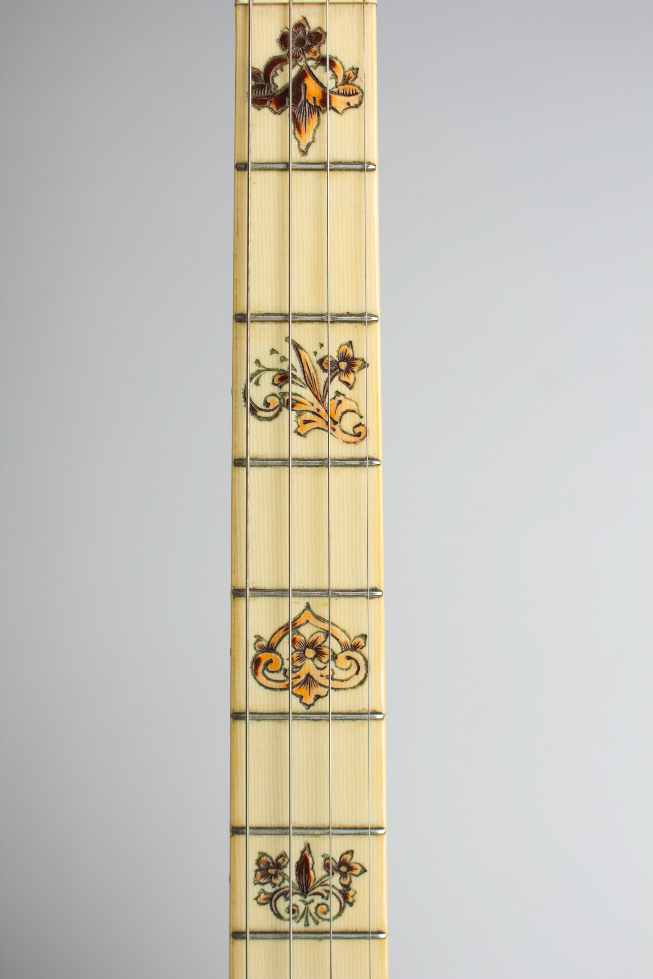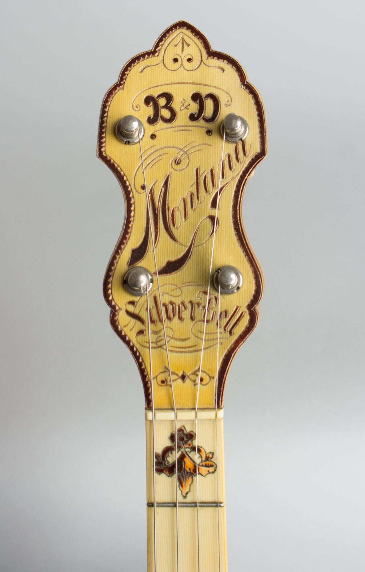 This banjo is the #1 style, the lowest of the Montana line but still an flamboyantly flashy instrument. It carries standard the 1920s B&D features including the distinctive "F-hole" flange mounted on the low set resonator and the smaller peghead characteristic of '20s Bacons. The Montana decorative package includes elaborate engraving in the ivoroid headstock, fingerboard, and heelcap, painted in with a deep red and delicate concentric rings on the resonator back.