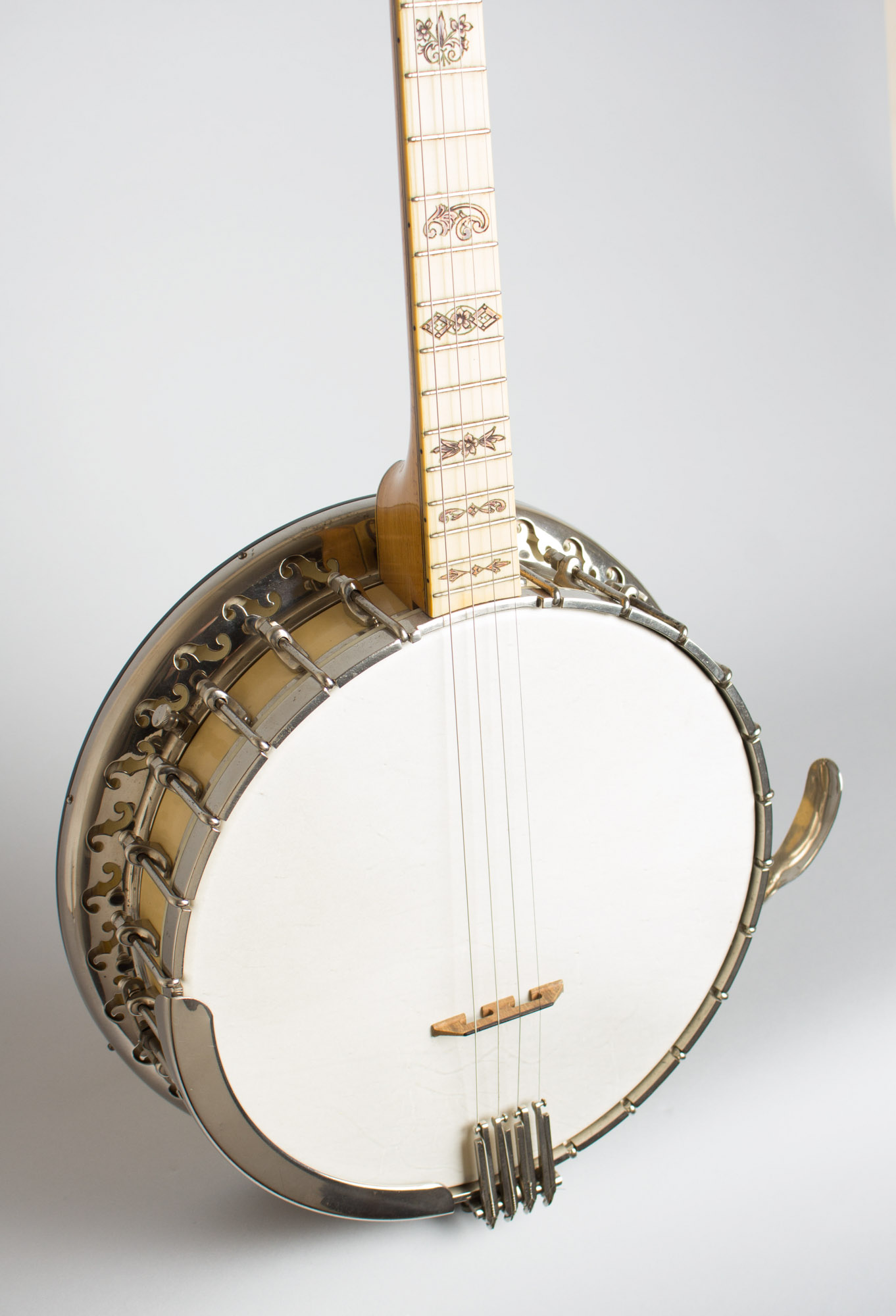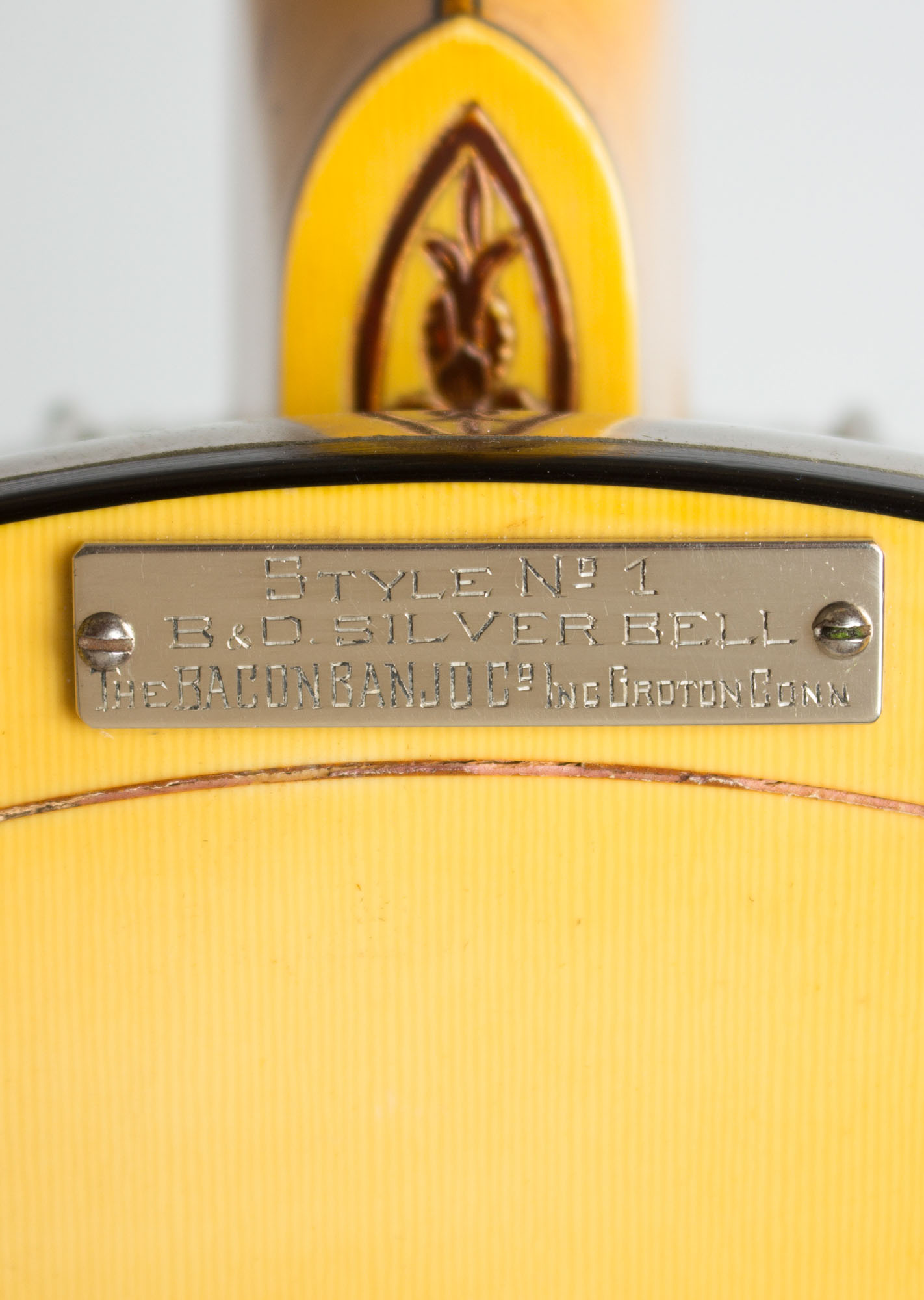 This banjo is a fairly early example of one of Bacon & Day's crowning creations: the Montana Silver Bell. This is the model that introduced the signature design element of engraved and painted celluloid to the Bacon line, which became one of the classic B&D trademarks. The model originated as a unique signature instrument for early 1920s cowboy entertainer "Montana," but by the mid-1920s was expanded into a full line with several distinct models, all in the white holly and ivoroid livery he favored. While all Silver Ball banjos are fancy, the Montana models with their unique white celluloid décor are distinctive even by Bacon standards.