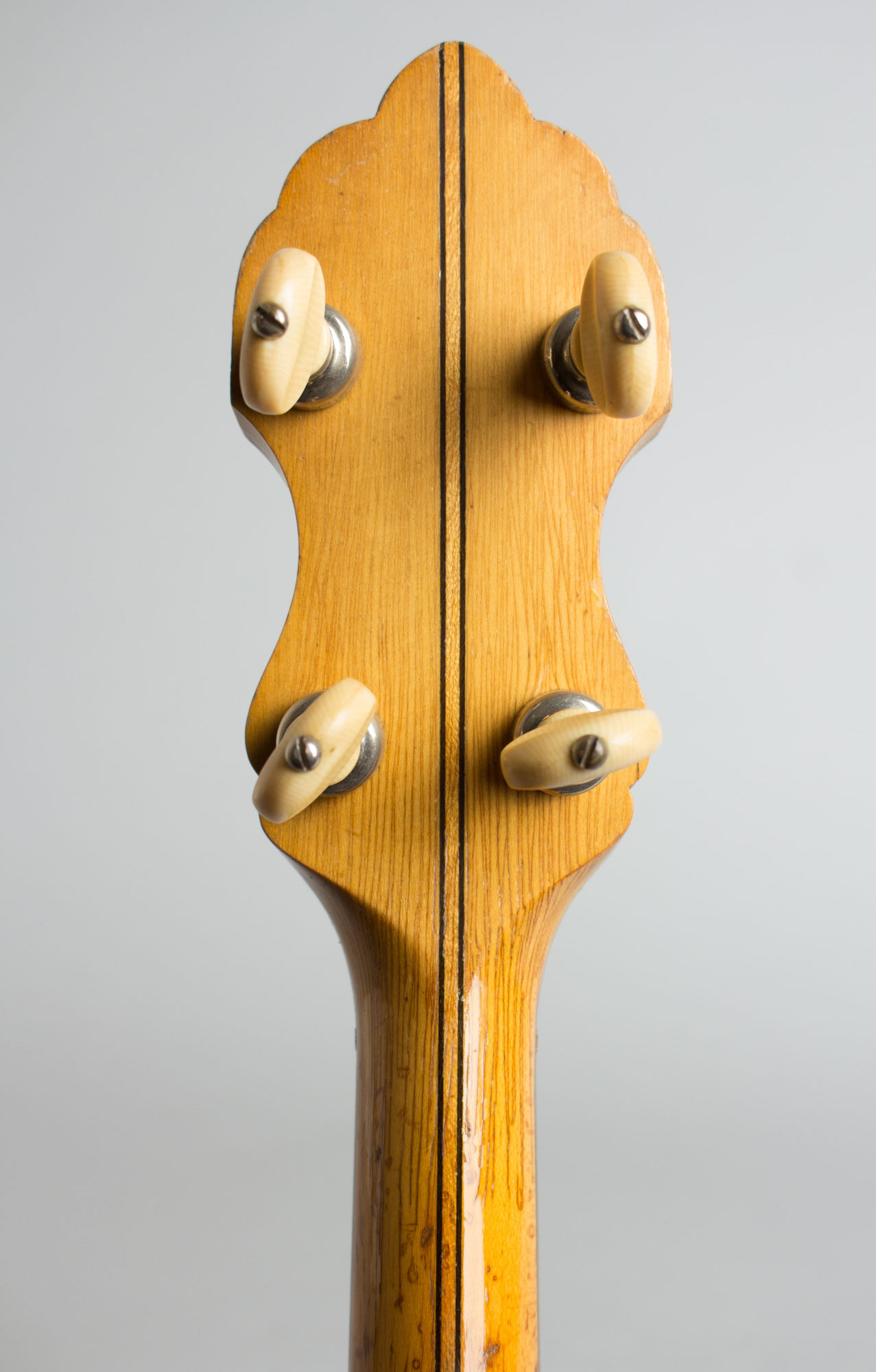 This is a very nicely original banjo; the sole alteration visible is a very old, clear overspray on the back of the neck. There is some finish wear and staining that is visible beneath this clear coat, and a couple of spots are worn through again. Apart from this the banjo does not show a lot of wear. Some of the paintwork on the engraved celluloid fingerboard is worn away as is common with these. All hardware is original, the plating is mostly quite clean, and the instrument is set up with a very good-sounding skin head and an original period Bacon bridge. Includes the original HSC. Excellent Condition.
