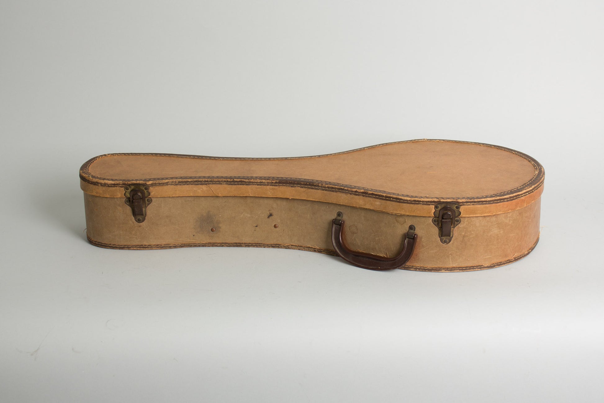 This mandolin retains all original hardware including the strip Waverly tuners, carved ebony bridge and remains complete including the oft-missing tailpiece cover which shows very light corrosion. The original frets have virtually no wear and this Style A plays as well as any we have had, with a bright bouncy tone. Overall this is a nice example and an excellent old time or recording mandolin, complete in a period (possible originally issued) chipboard case designed for another longer mandolin. Overall Very Good + Condition.