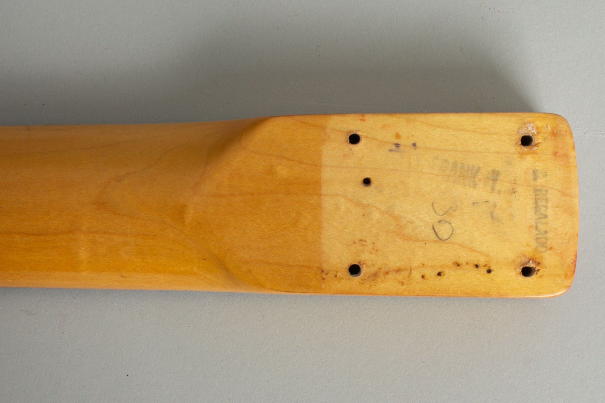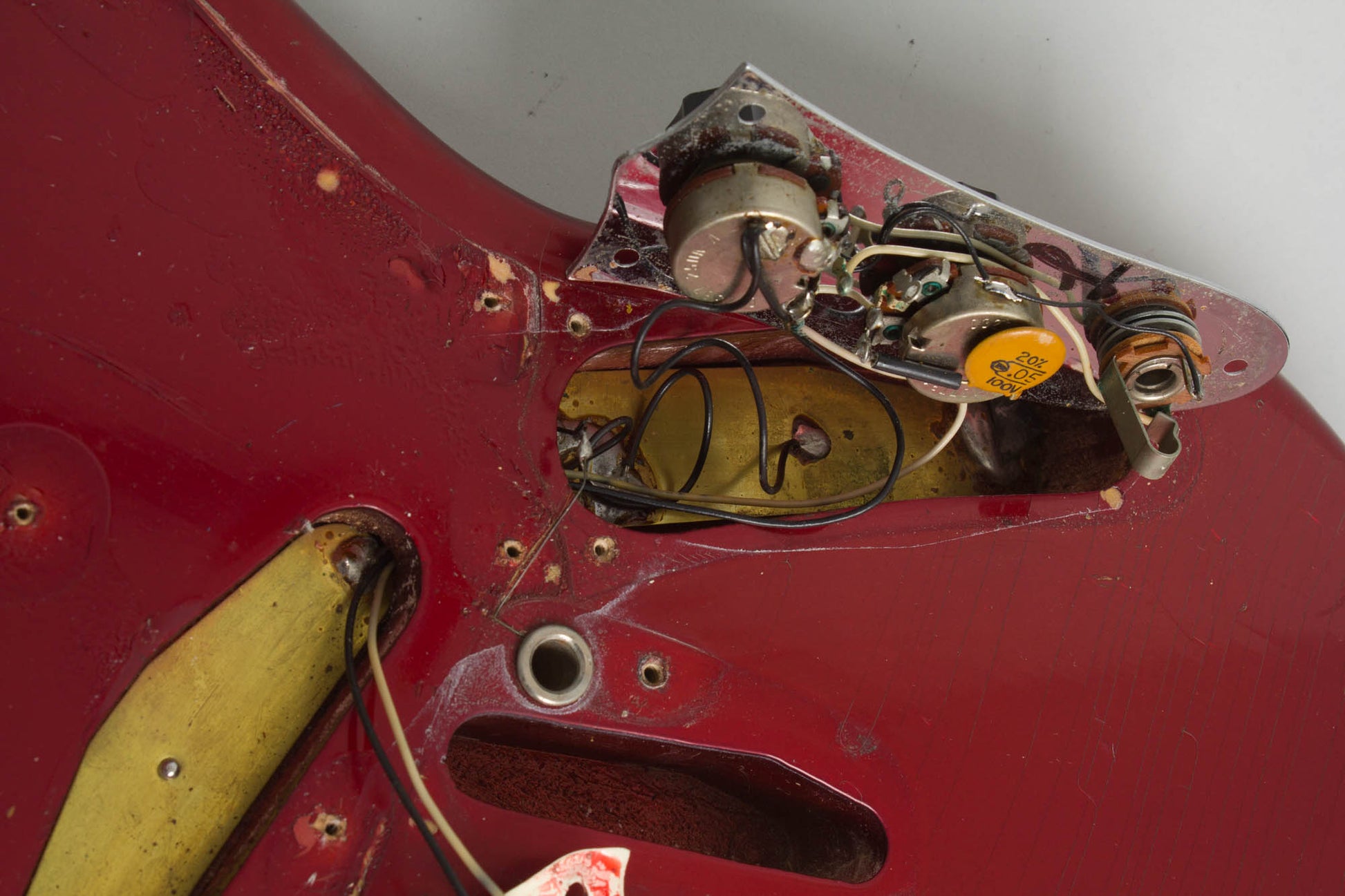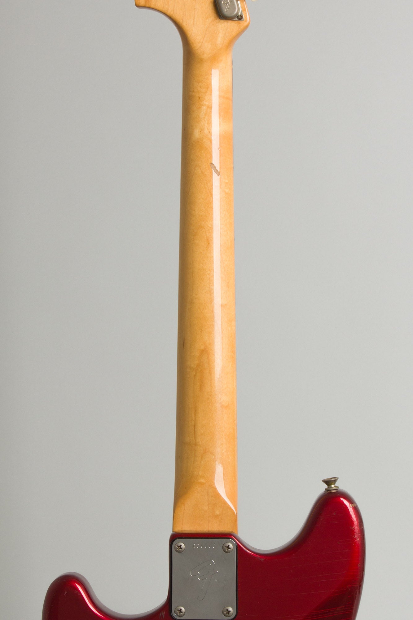 This Mustang remains nicely original except for a repro trem bar and is in solid playing condition overall. There is checking to the body finish with some fairly random finish scuffs, chips and dings, a few fairly deep, but no major belt-buckle wear on the back. The neck finish is relatively clean with one deeper scrape behind the third fret area.
