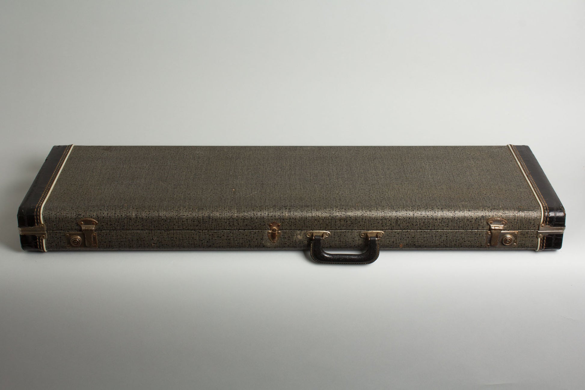 The lower tip of the pickguard on the treble horn has split off with some glue residue visible were it was once tacked down. The pickguard itself has shrunk up a decent amount which in turn has outgassed somewhat bled into the finish underneath in some places, but this is only visible when the guitar is disassembled. Everything works as intended, the trem arm is a correct repro. The original frets have only light wear and this is a good playing and sounding Mustang; still snazzy and sporty these many years on! It rests in the original case. Excellent - Condition.