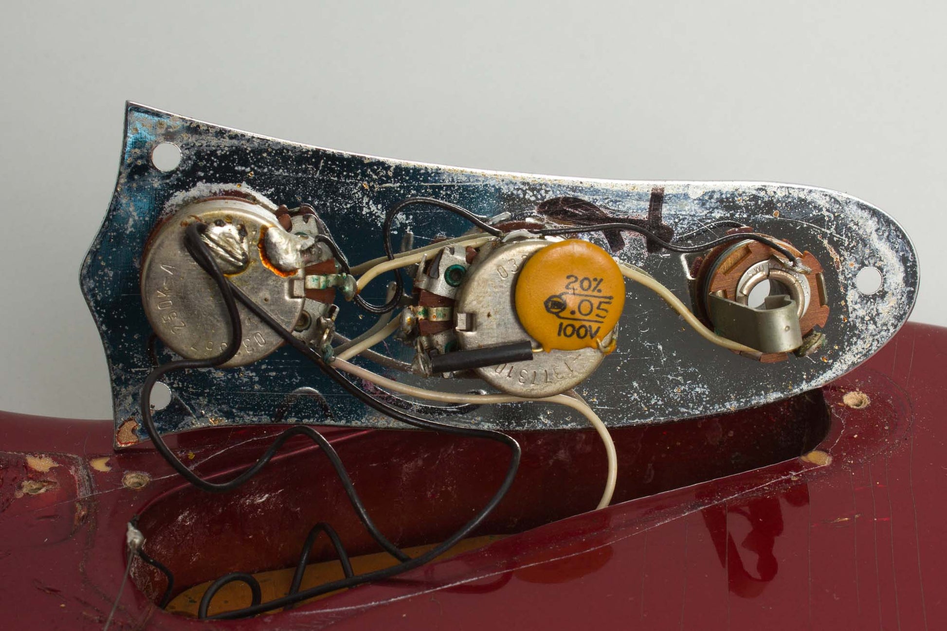 This is a later-day Competition Red Fender Mustang from 1973, built at the end of the run for this rather whimsical "Competition" version of the model. This was the last year for the snazzy Candy Apple Red metallic "car" finish and "racing" stripe on the body; the matching headstock had been discontinued a couple of years earlier. Soon after this one was made the finish options for the model were changed to sunburst, natural, or black and the "Competition Mustang" series was retired under the checkered flag.