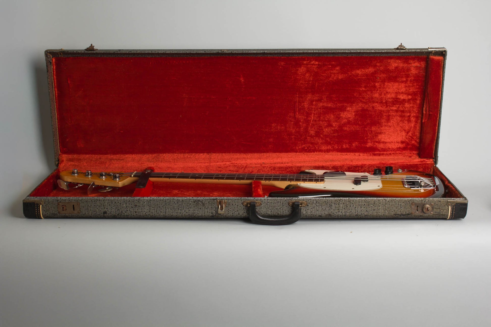 Fender Mustang Model Solid Body Electric Bass Guitar (1973), made in Fullerton, California, serial # 513139, sunburst polyester finish, alder body, maple neck with rosewood fingerboard, original grey hard shell case.
