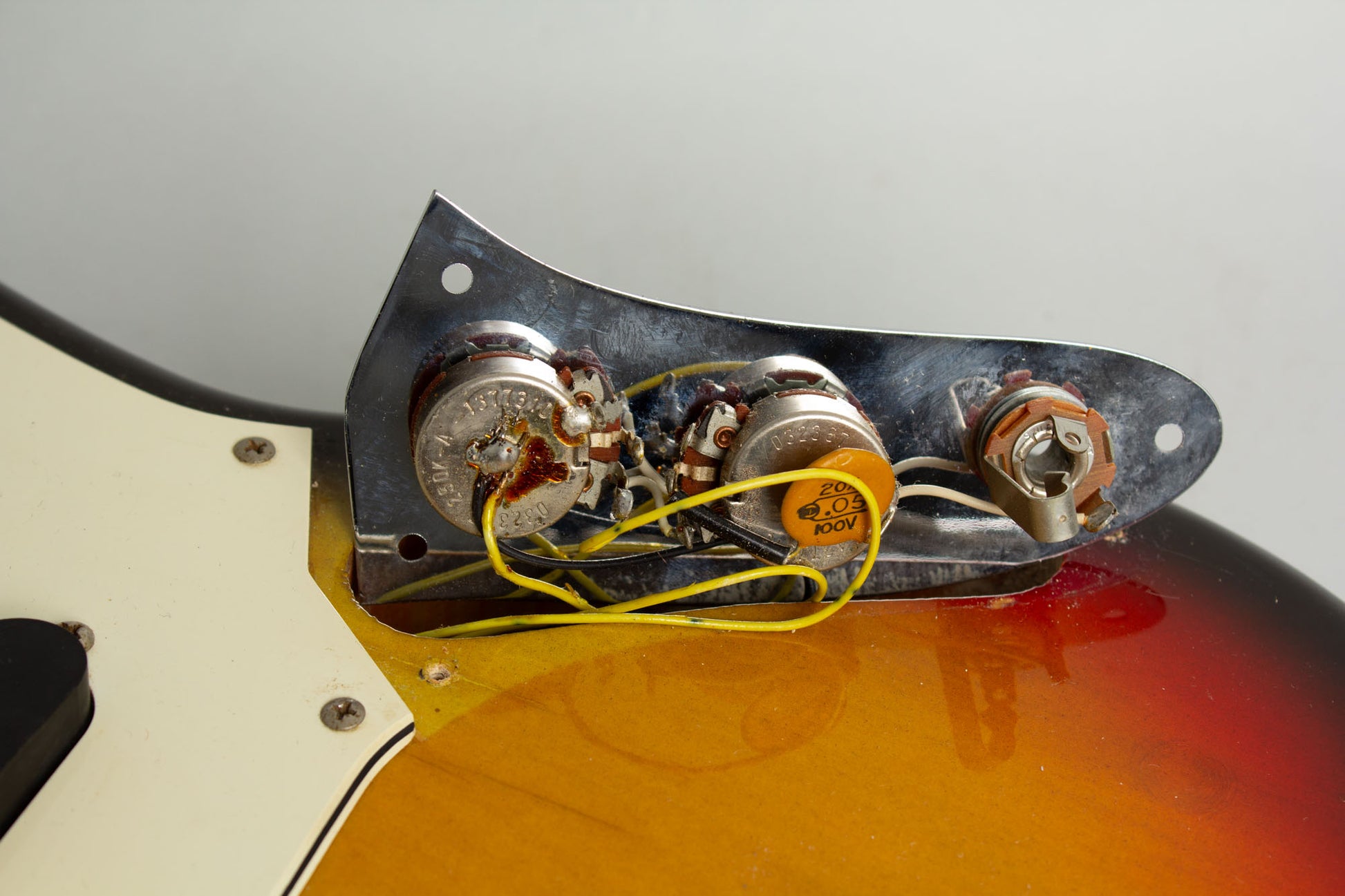 This is a nicely original bass showing some wear overall but no major structural damage or repair. The sunburst finish has very little fade and retains a deep strong color, with the typical 1970s more amber yellow tint to the center section. The tough '70s Fender Polyester finish shows small dings, chips, and dents overall with some concentrated scratching to the back. The back of the neck has feelable dings behind the 3rd, 11th and 12th frets but is mostly relatively clean; the treble edge of the fingerboard has a couple of deep chips in the 10-11th fret area.