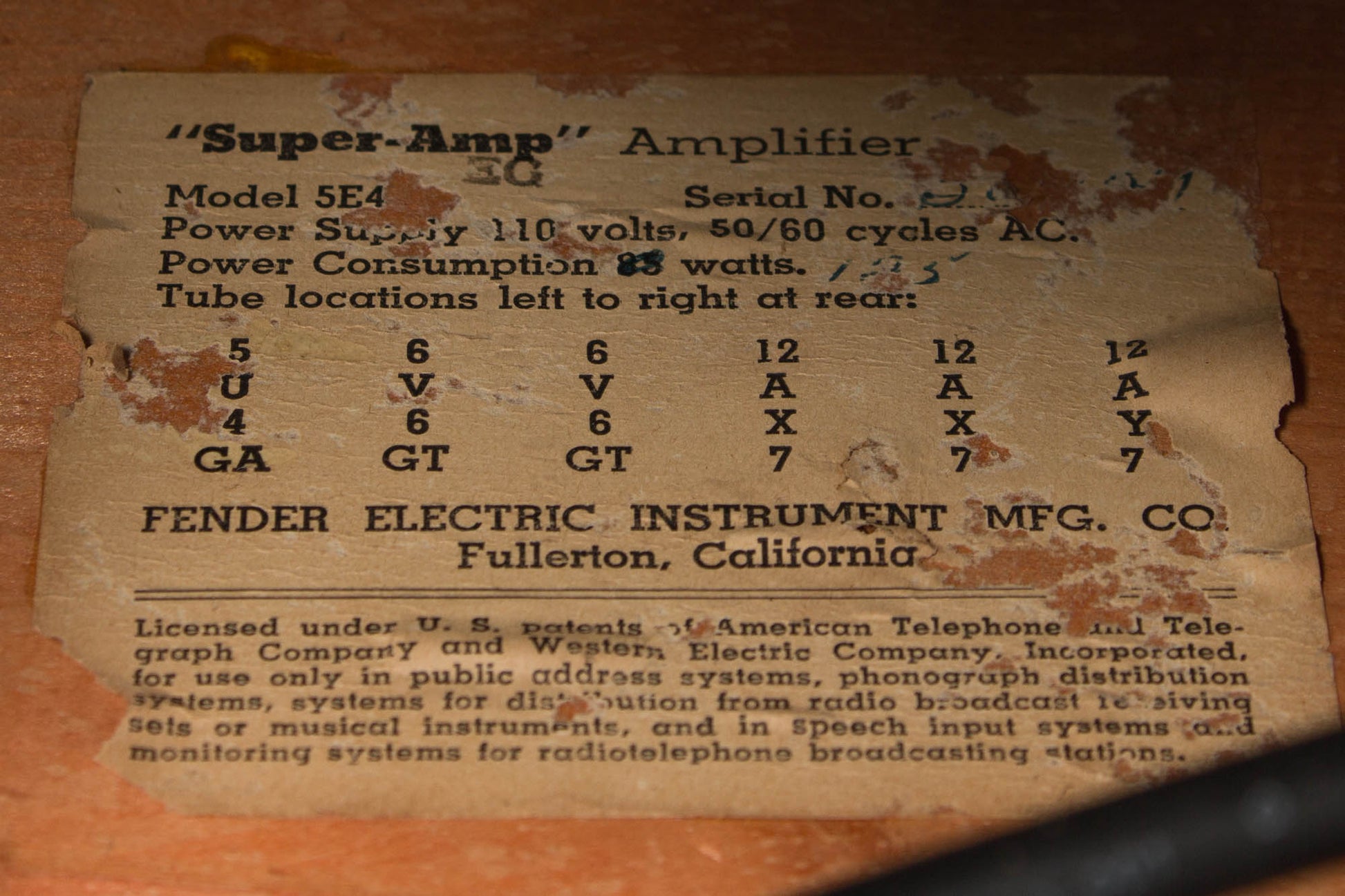 This amp is the fourth major iteration of the Super, known as the "narrow-panel". The new aesthetic changes came with the 5E4 circuit revision, which in and of itself brought several new things; the power section was beefed up with fixed bias and a choke, as well as the employment of 6V6 power tubes, straying from the typical 6L6s used in past (and future) iterations. The former single tone control was upgraded to a Bandaxall-style set of treble and bass controls, as well as a presence control for the negative feedback. Otherwise, the 5E4 features the same four inputs in a different arrangement; two labeled "microphone" and two labeled "instrument" and a volume control for each pair. The 2x10" speaker format remains but now diagonally offset in the cabinet.