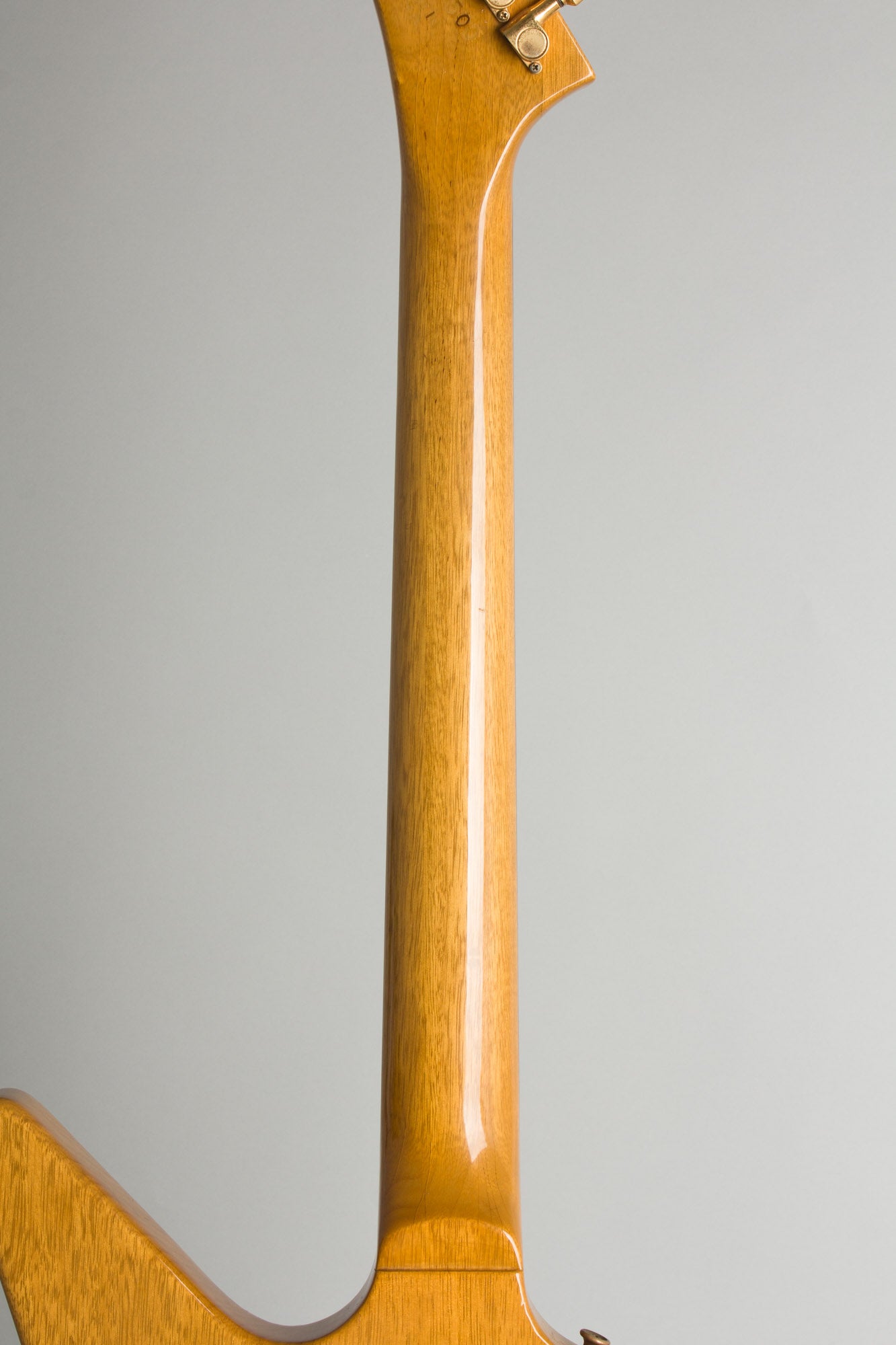Apart from this major modification the guitar is original in its antique natural Korina finish. The old Gibson Custom Shop logo sits on the back of the headstock with a standard impressed 1983-coded Serial Number. The fairly chunky rounded 1950s inspired neck profile is very comfortable All hardware is gold plated, including the Gibson branded Schaller tuners (There were no Kluson machines available in 1983) and tastefully, the added Kahler hardware.