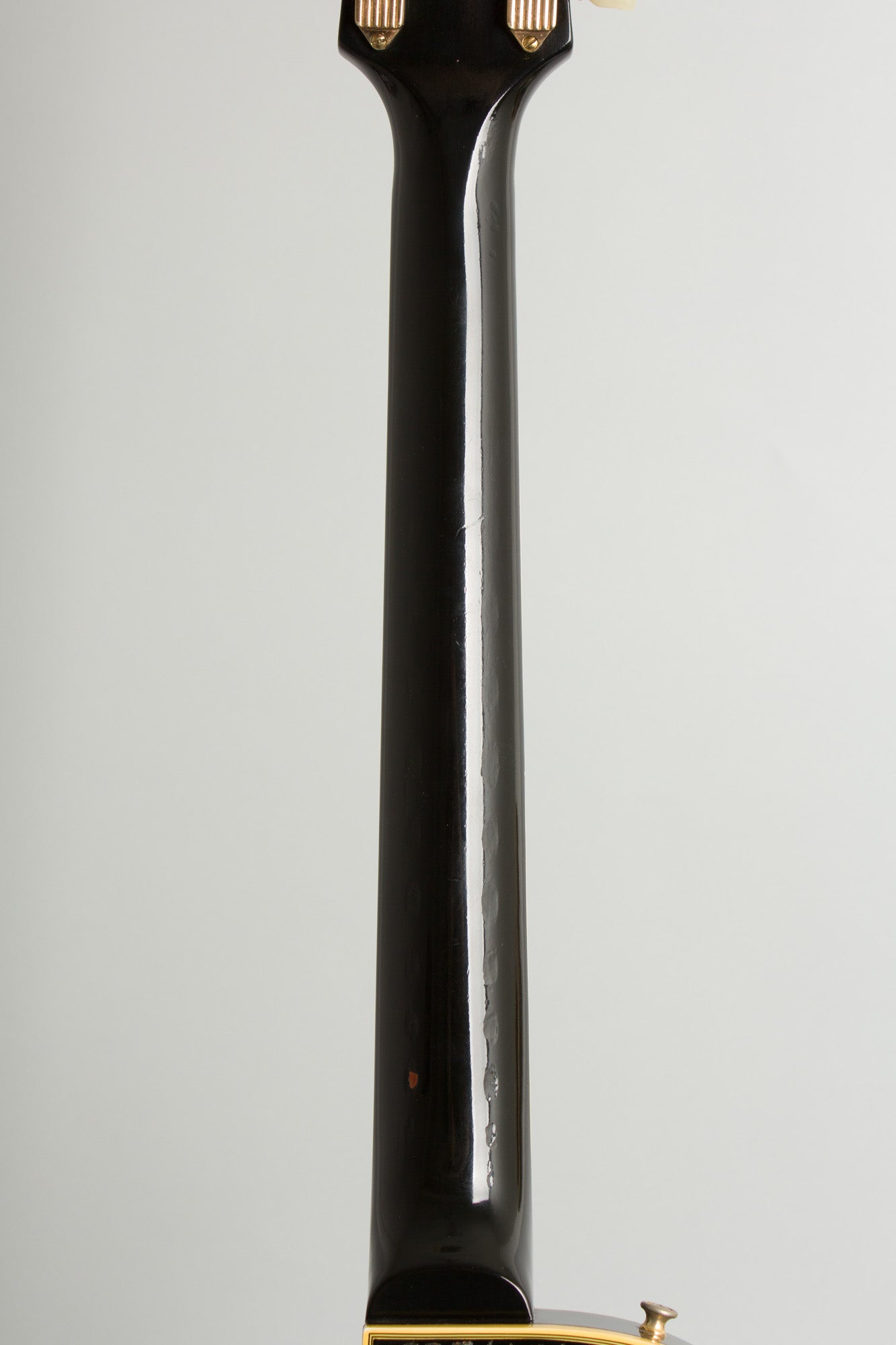 This is a beautifully original guitar overall, showing some light wear but nothing tragic for 70+ years on the planet, really looking not much played in over many years. The only alteration is a driver's license number etched into the upper back just below the heel; this could be filled in and finished over but is part of the guitars history now. The all-original ebony finish is thinner than later examples, still shiny with hardly any checking and some fairly minor scratches, dents and dings scattered around. The back of the body has a small areas of belt-buckle worming into but not through the lacquer. The face has only a few tiny dinks and dents.