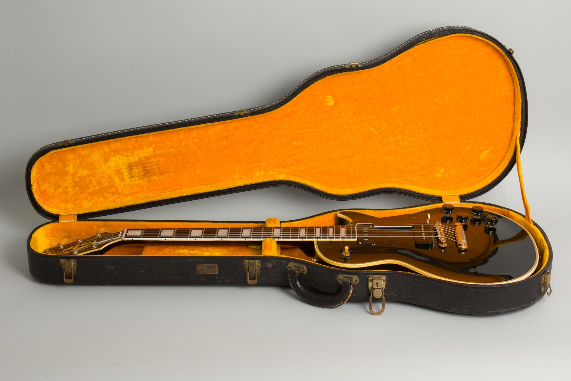 This is a seriously cool 1955 Les Paul Custom, showing really not much wear for 70 years on Earth with some nice case candy to boot. The Custom was Gibson's top-of-the-line solid-body throughout the 1950s, a shining "Black Beauty" with gold-plated hardware and deluxe appointments drawn from the company's flagship archtops. This model was introduced in 1954 with direct input from Les Paul himself as to what he wanted for his personal instruments. Gibson delivered, and Les and Mary Ford performed for the rest of the 1950s on (modified) Customs. This example was made in 1955, the first full production year and appears not too much used since.