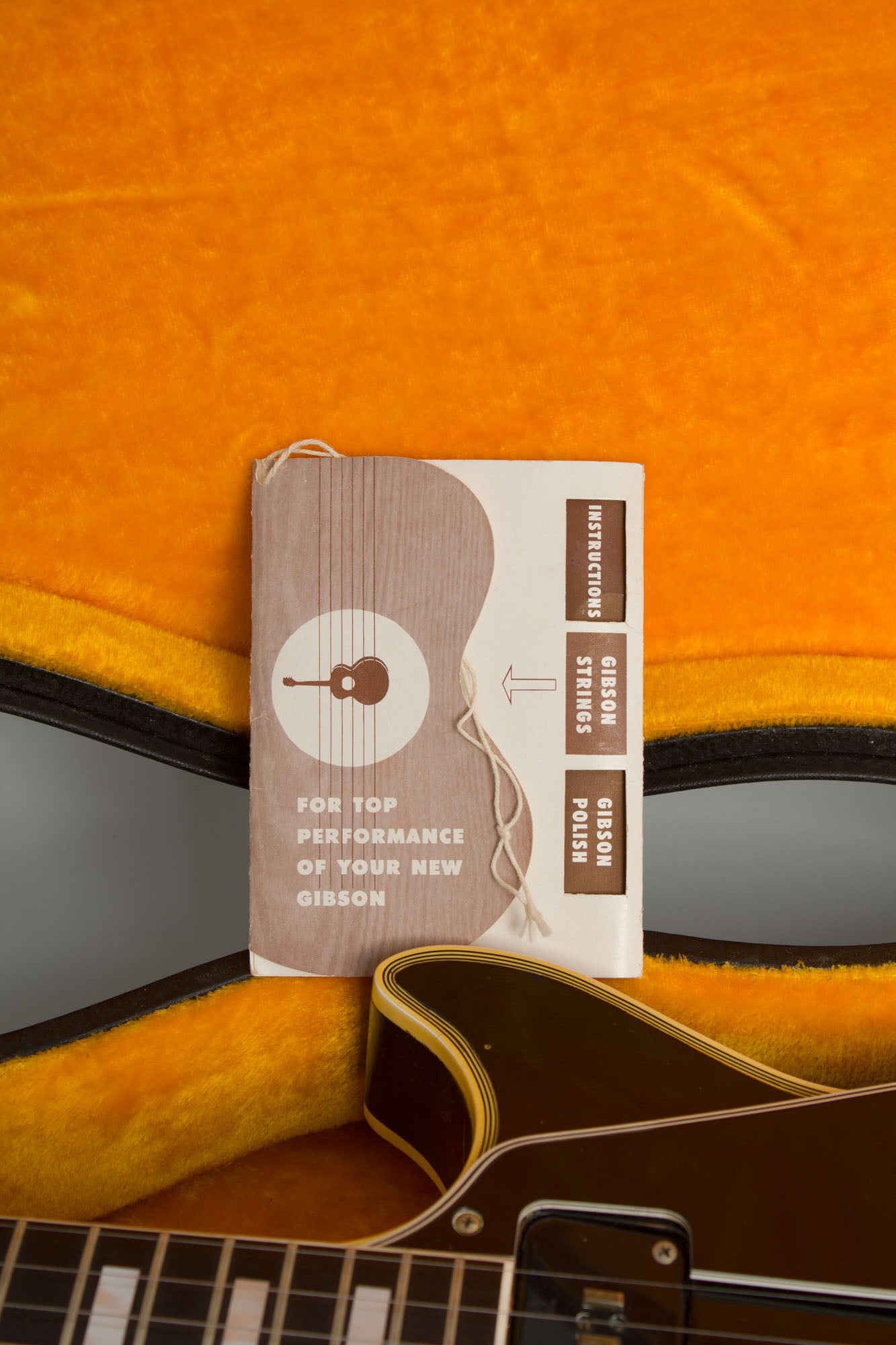 The original frets are intact; these are Gibson's 1950s standard "Fretless Wonder" style and very low and flat; they show some light wear but play as well as they ever did. The ebony fingerboard has some very divots between the G and B strings, the bone nut remains original. This is simply a lovely example of a 1950s Les Paul Custom, lightly used but not abused with only minor scars to show for it. Both pickups have plenty of sing and the instrument offers a very powerful sound both clean and cranked. It comes in the original yellow lined pebble-grained black case, lightly worn with the fabulous original hang tag reading "Les Paul Custom Fretless Wonder" and the envelope with the small screwdriver provided for Tune-O-Matic adjustment. This is a simply stellar Black Beauty, super clean to look at but just worn enough to play without fear. Overall Excellent Condition.