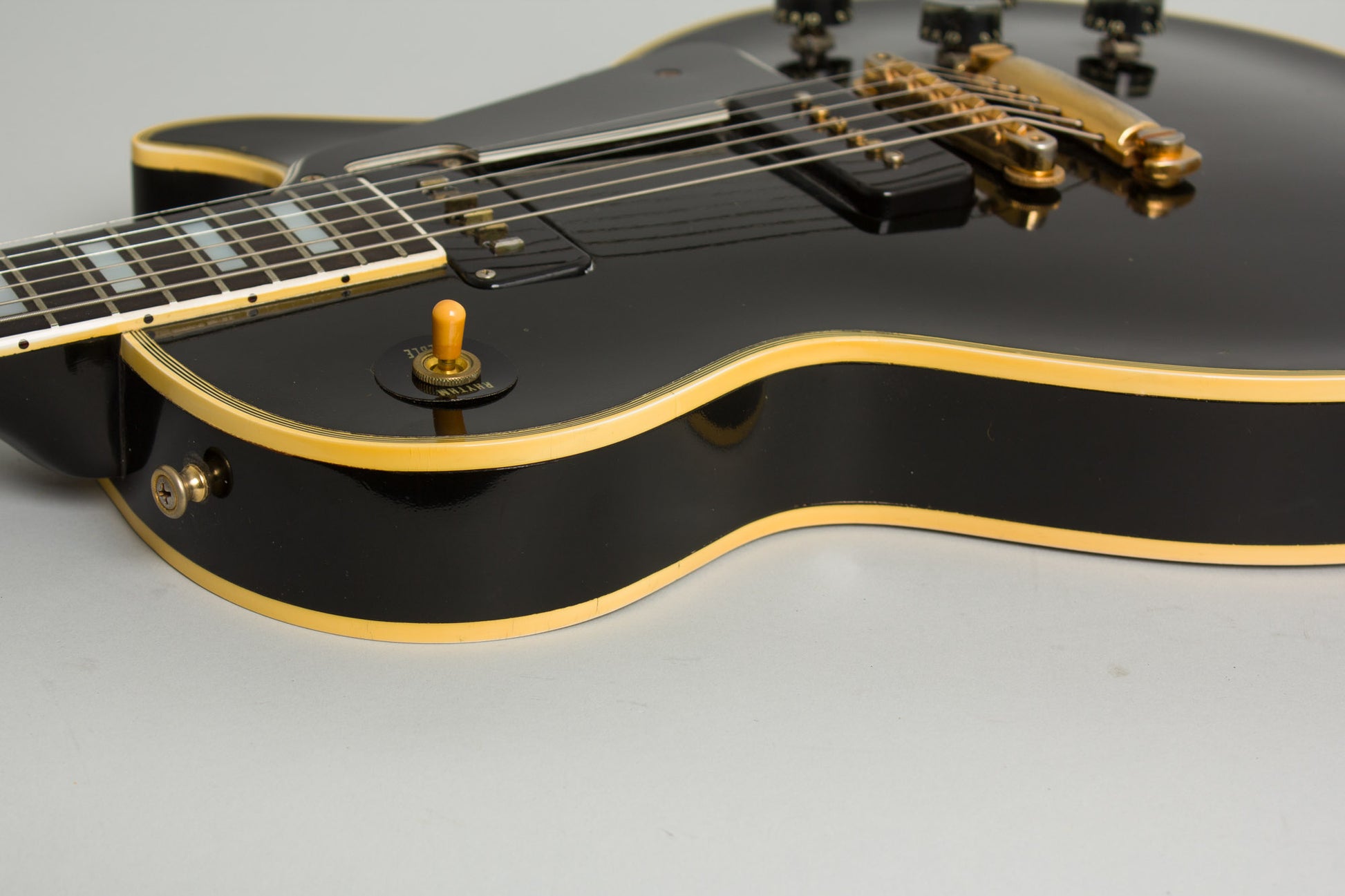 The Custom featured Gibson's then-new adjustable Tune-O-Matic bridge, mated to the stud-mounted stop tailpiece unit that had previously served as the bridge on the Standard and Junior. It was the only solidbody to carry the new high-end "Alnico V" staple-magnet pickup, again likely with input from Les himself. This is essentially Gibson's take on a DeArmond DynaSonic, which is what Les mounted in the neck position of in his personal Standard in 1953-4. Combined with the more typical P-90 in the bridge position, this crisp and powerful pickup gives the Custom a wide tonal range unique among Gibson solid-bodies.