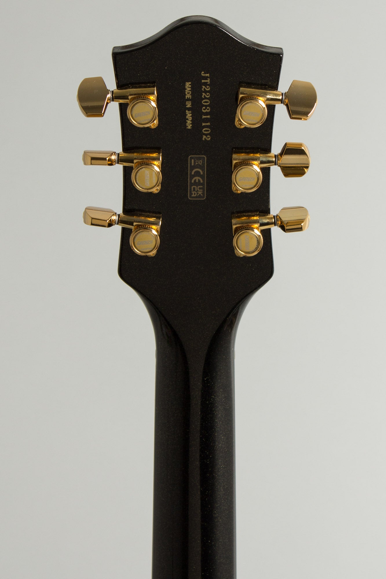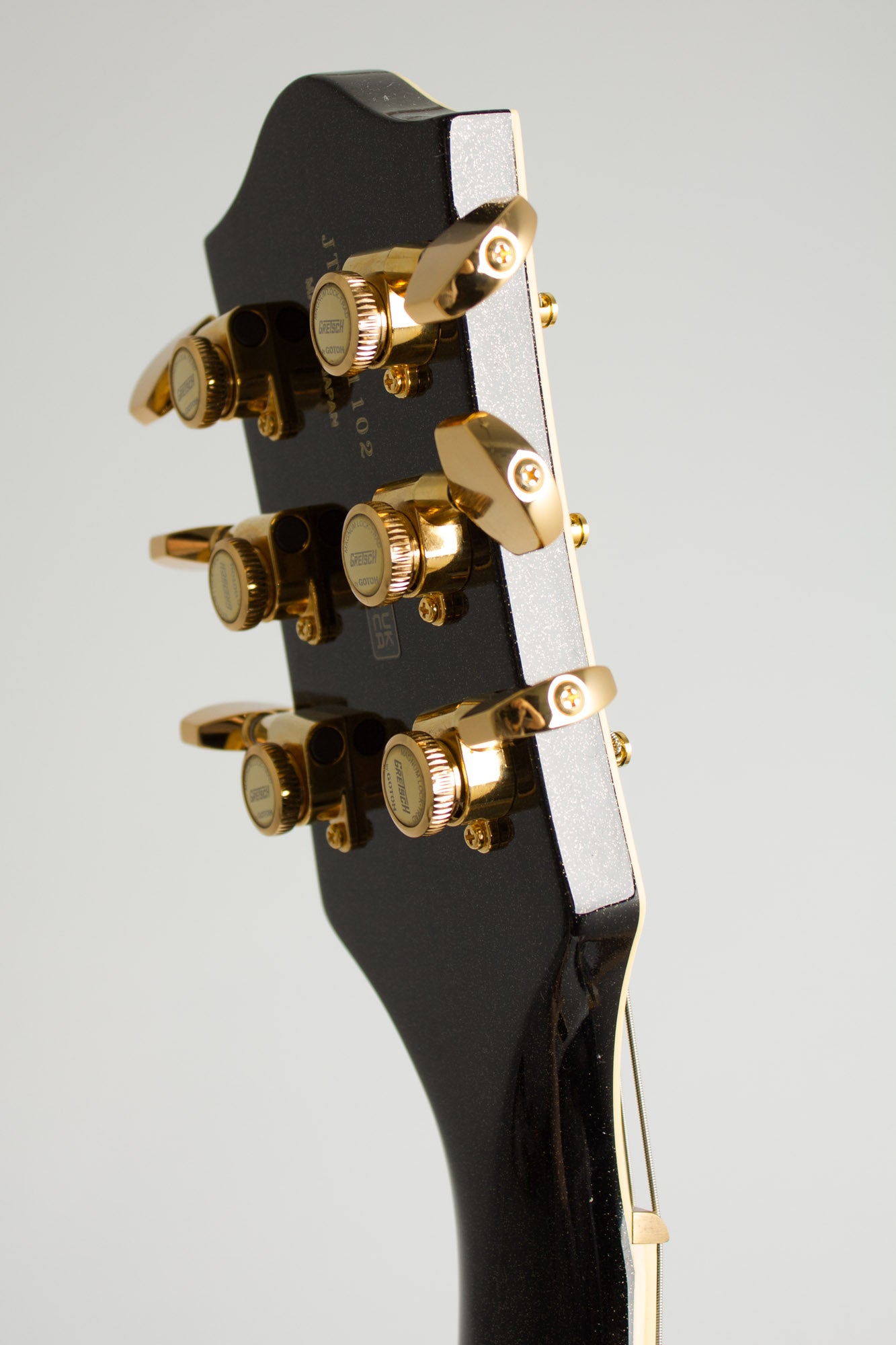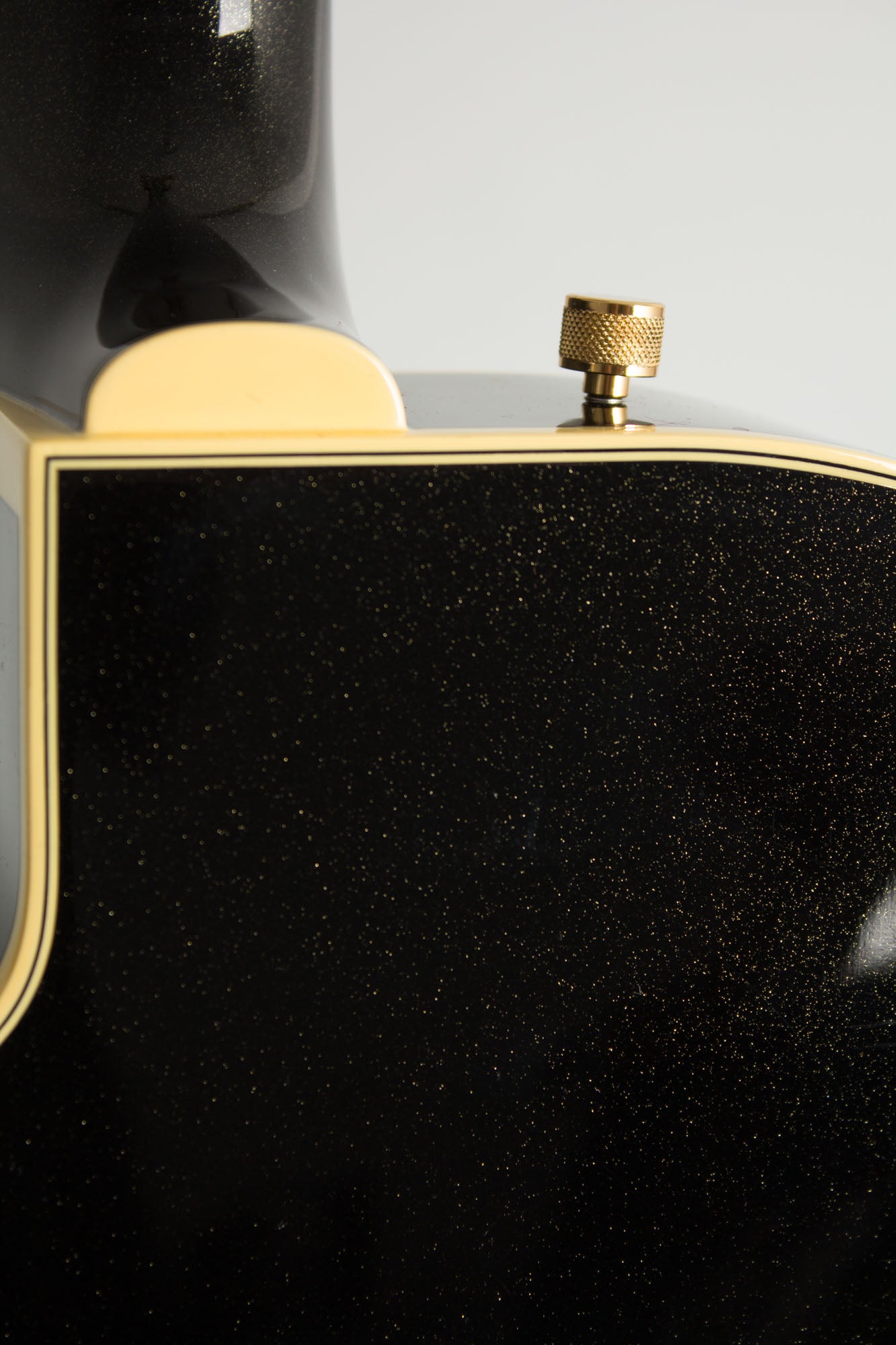 This Gretsch "Nashville Gentleman" Steve Wariner Signature model is effectively a modern update on the classic Chet Atkins 6120 models with some interesting variations. The 15 3/4" wide, 2 5/8" a single-cutaway deep hollow body has a solid top with simulated F-holes, a combination of elements not used on any vintage 6120 version. The jet-black-with-sparkles finish (Magic Black" in Gretsch parlance) almost seems like a nod to 1960's sparkly Silvertone guitars; it offers a new look with a subtle flash factor. This is set off by gleaming gold hardware, aged white binding with black and white purfling, and a gold Plexi pickguard with black Gretsch logo and signpost graphic featuring Steve Wariner's signature where Chet's used to be. A gold nameplate adorns the multi-bound headstock as well.
