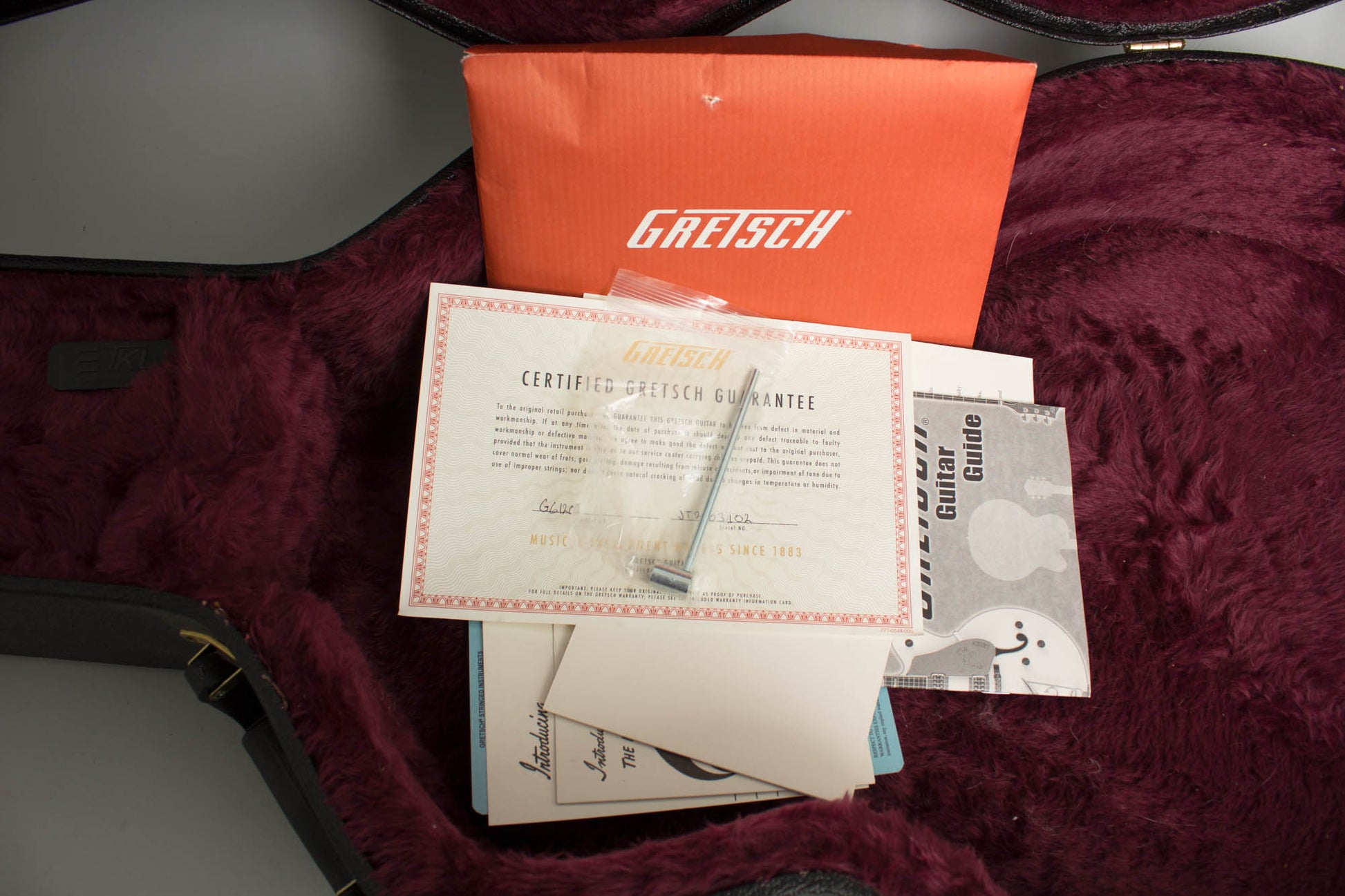 This guitar looks only very lightly played, with a few scuffs and handling marks overall but no really notable wear except minor scuffing on the headstock from a clip-on tuner being mounted there. The bridge top and Bigsby have light wear from hand contact. This is a very cool looking and fine sounding modern Gretsch, a nice extension of the company's long association with Chet Atkins through this endorsement by one of his premier acolytes. It is an excellent sounding and playing instrument, complete in the original hard case with a passel of Gretsch paperwork. Overall Excellent + Condition.