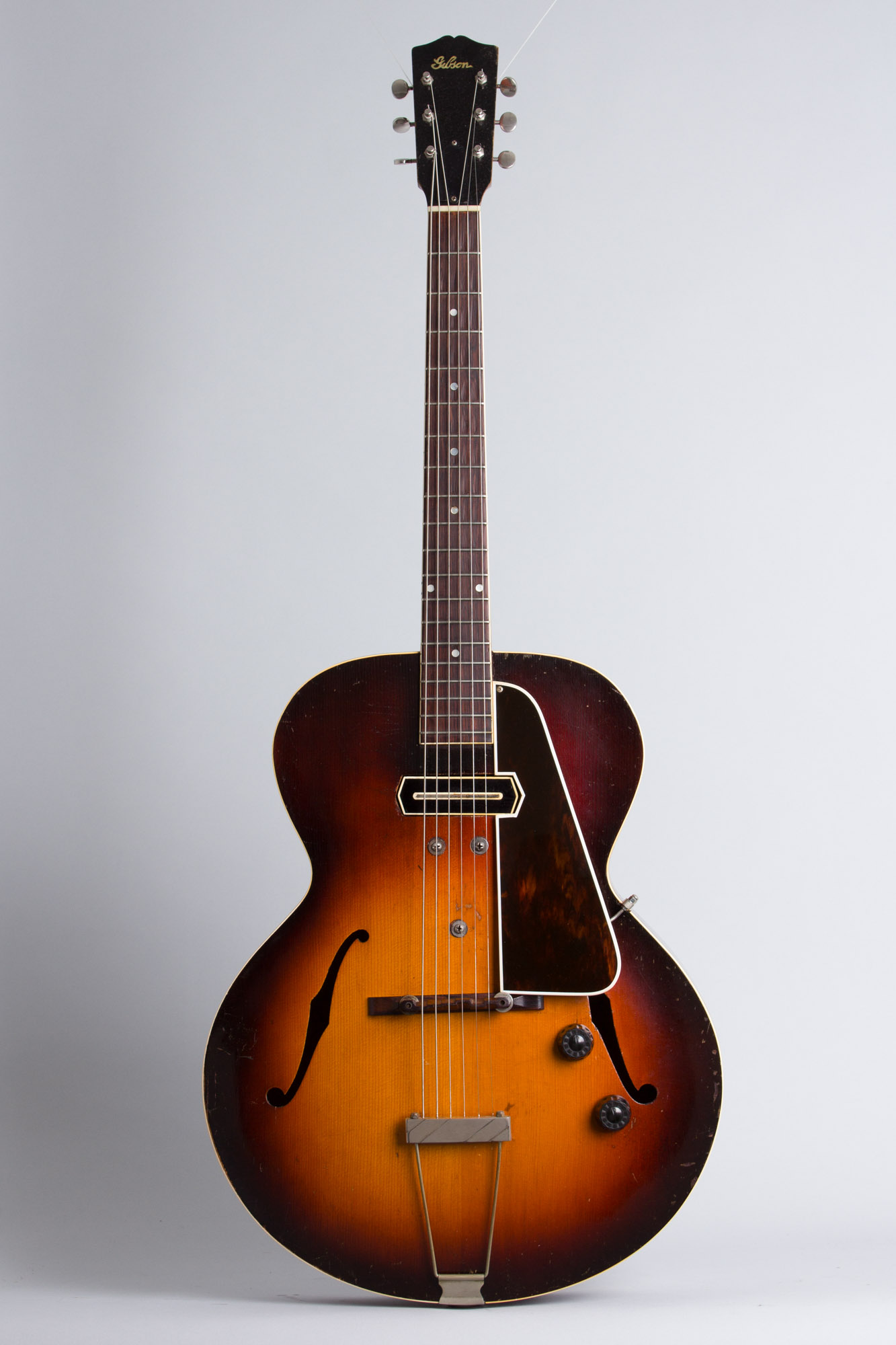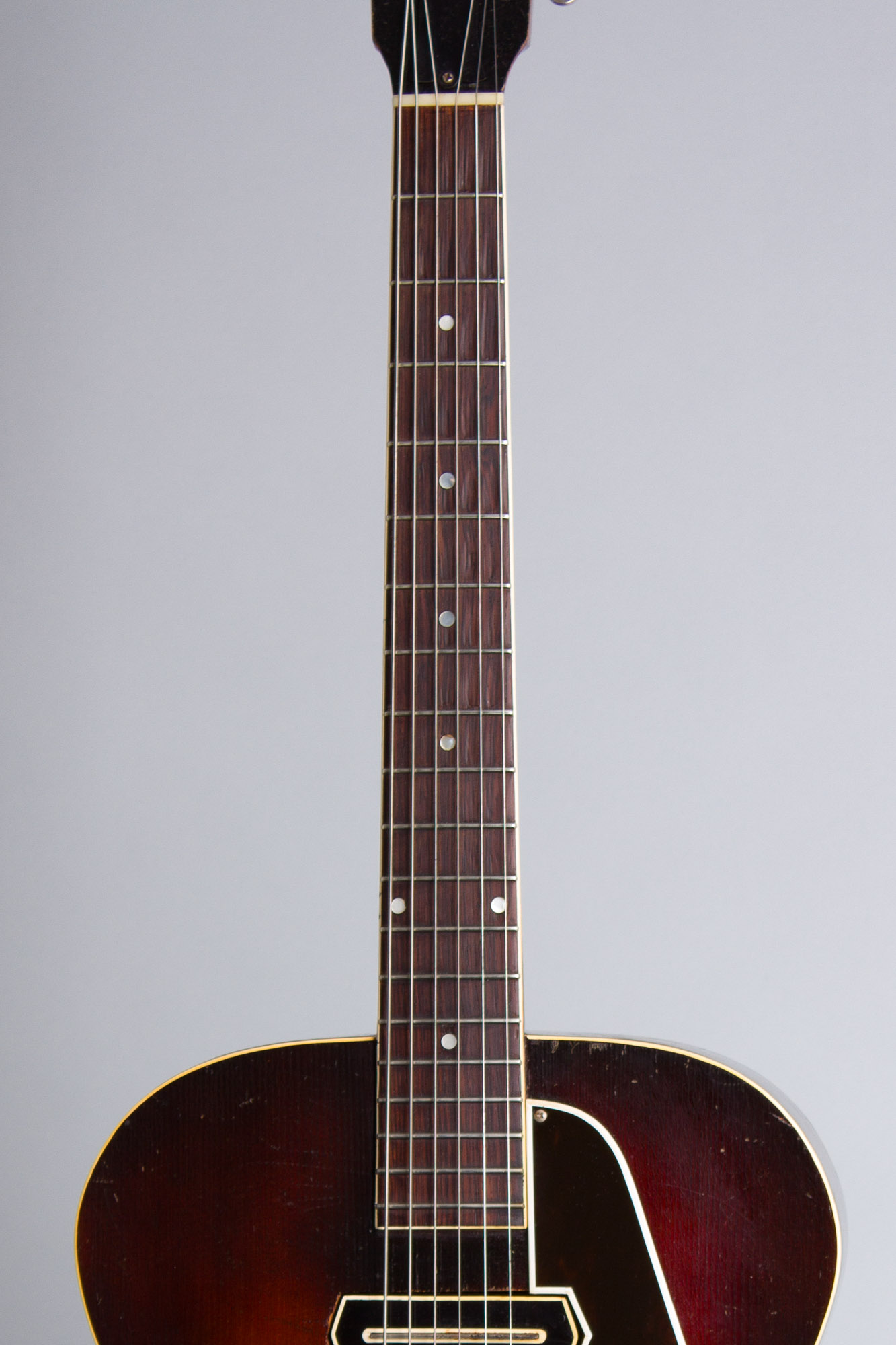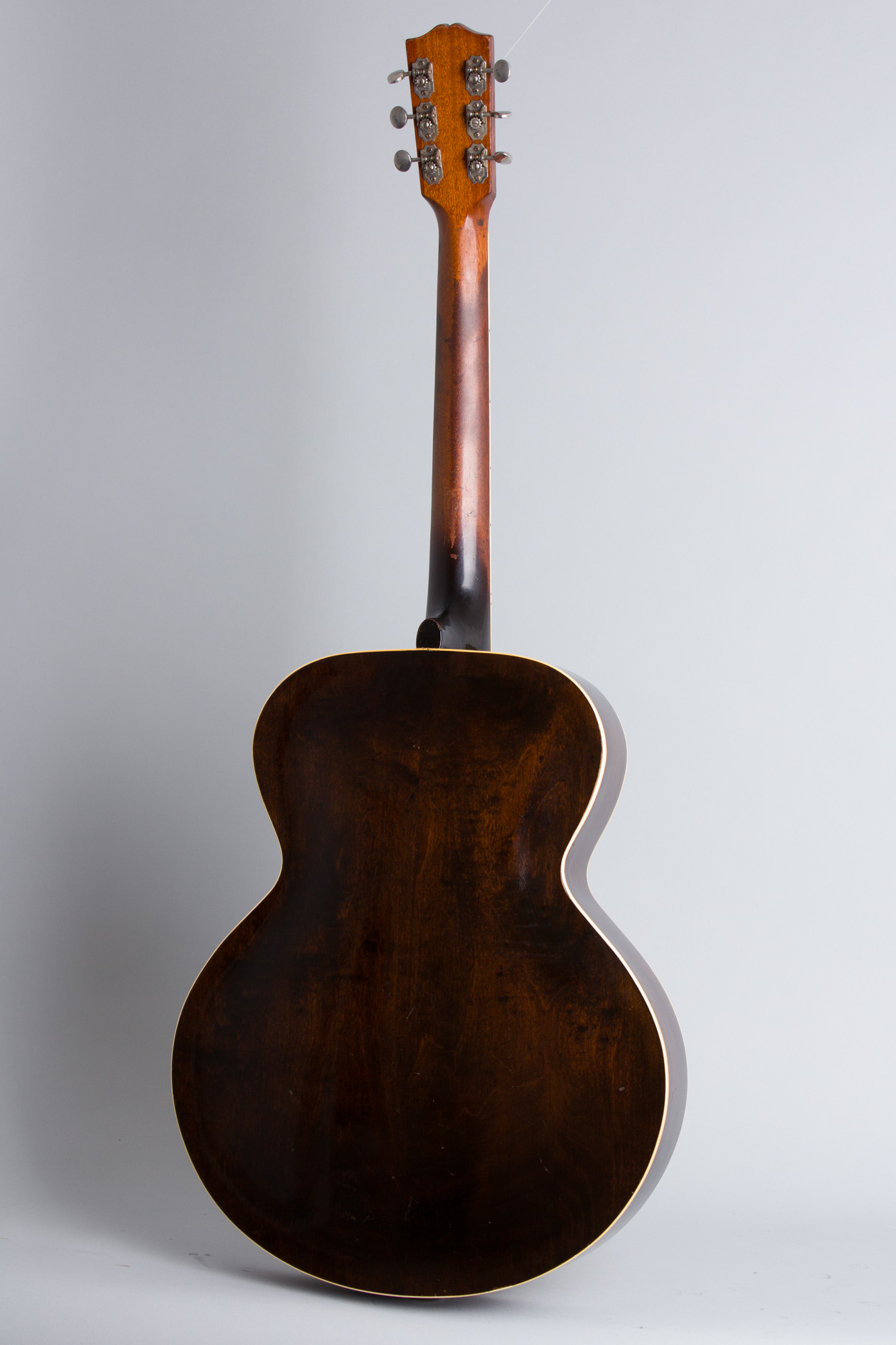 The top is carved spruce finished in a dark shaded sunburst, single-bound with slim unbound F-holes. The back is arched, a design improvement from the earlier flat back which proved prone to cracking. The finish on the back, sides and neck is an overall dark mahogany. The neck retains a "V" contour but with a slimmer, softer and somewhat more playable feel than the typical earlier 150's. A pearl Gibson logo adorns the unbound headstock, oddly sitting somewhat lower than on earlier models. The tuners are early Kluson #105N openback machines with oval metal buttons specific to the 1939-40 period.