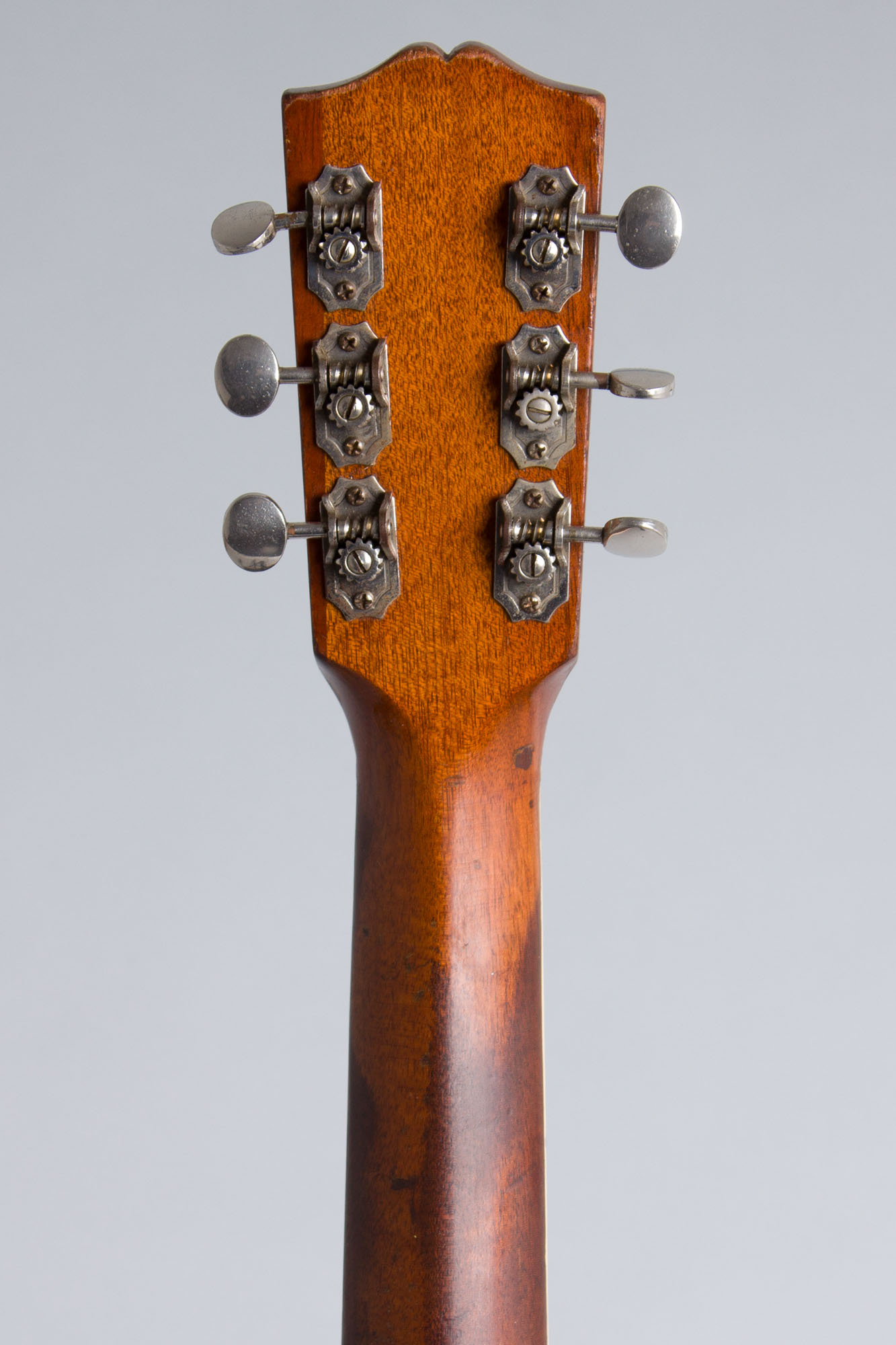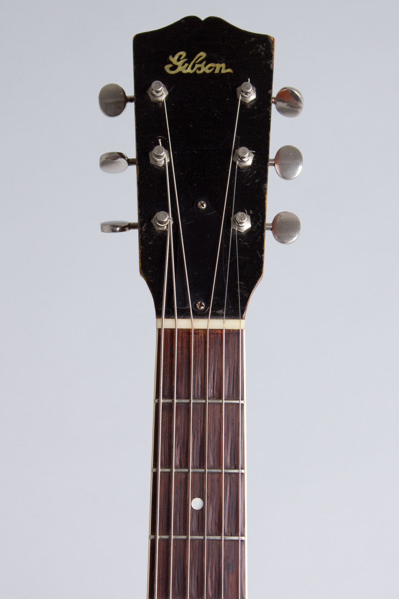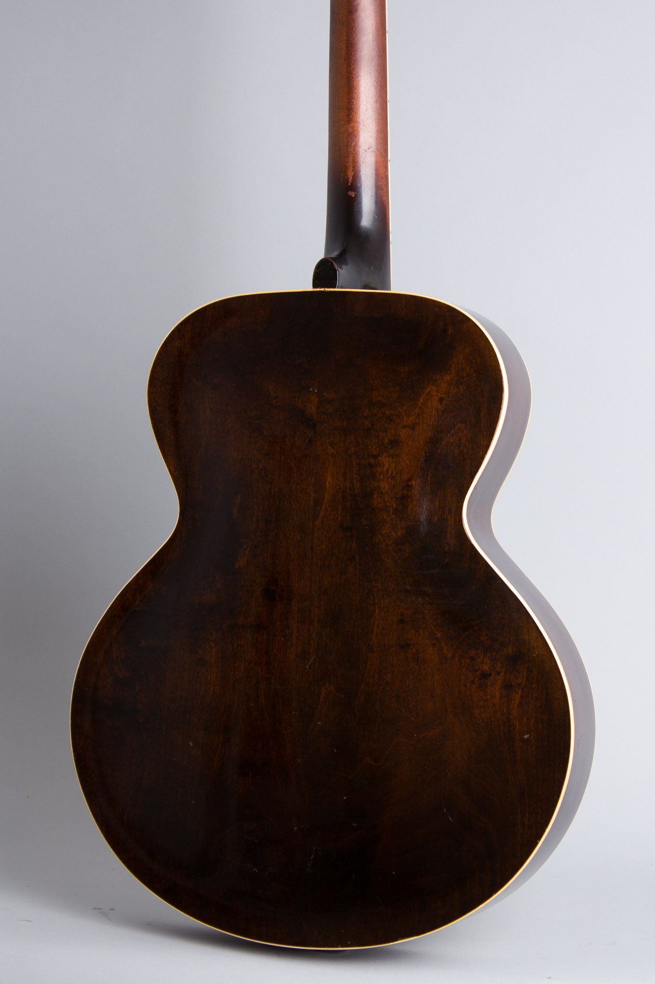 The top is carved spruce finished in a dark shaded sunburst, single-bound with slim unbound F-holes. The back is arched, a design improvement from the earlier flat back which proved prone to cracking. The finish on the back, sides and neck is an overall dark mahogany. The neck retains a "V" contour but with a slimmer, softer and somewhat more playable feel than the typical earlier 150's. A pearl Gibson logo adorns the unbound headstock, oddly sitting somewhat lower than on earlier models. The tuners are early Kluson #105N openback machines with oval metal buttons specific to the 1939-40 period.