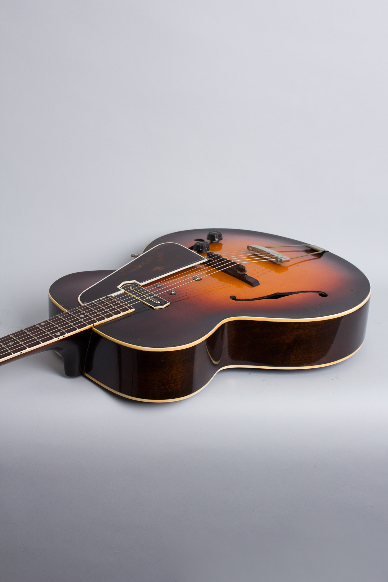 This particular guitar is a rare variation, one of the last of the original styled models introduced in 1937. It was made in early-mid 1940 and shows some transitional features. The first "Spanish" version of the famous bar magnet pickup is retained, featuring a single-bound top edge and a straight un-notched blade under the strings. By the middle of the year this model was radically redesigned with a new metal-covered pickup close to the bridge which altered the instrument's original character forever.