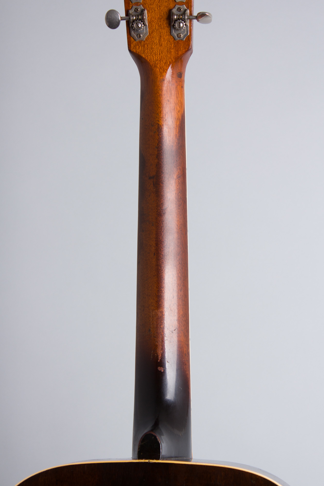 This guitar shows some wear and tear for its 83 years on earth but remains a very attractive and great-sounding, fine-playing example of this rare and much sought-after instrument. There is less finish wear than many examples of this model; the typical pick wear above the fingerboard is confined to light scratches into but not through lacquer. The top overall has dings, dents and scratches overall with a few deeper marks near the lower pickup screw and dings and chips scattered along the edge. The back and sides have small dings and scratches while the back of the neck has a decent amount of finish worn down to the wood.