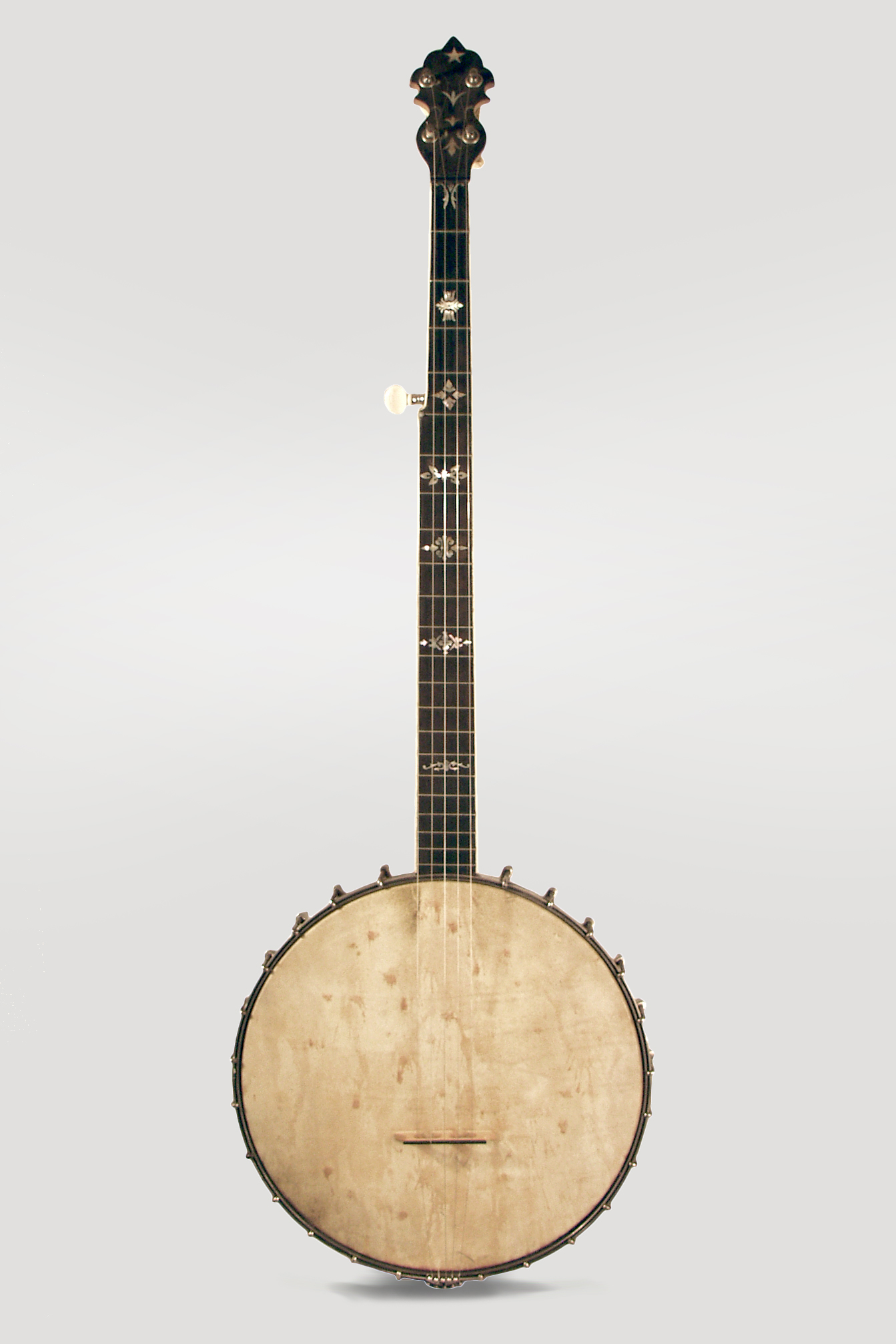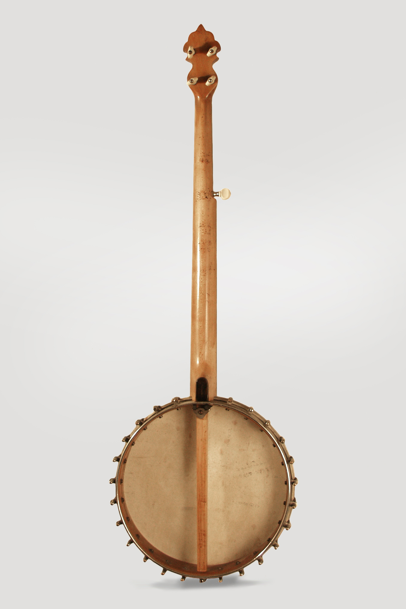 This interesting large-rim 1910's banjo was sold by Sears, Roebuck & Co. and is most likely the produce of New York's Rettberg & Lange organization, famous for the Orpheum and Paramount brands. It is built well, if certainly to a price (like all Sears product!) with a fairly thin 19th century style spunover rim and a maple neck with medium-fancy pearl inlay. This is a rather large banjo even for the time, with an oversize 12" rim and extra-long 28 1/2" scale neck-a relative of Rettberg & Lange's similarly grand Orpheum Brass band models from the same period. With its large rim but simple spunover (metal sheathing over wood) construction this banjo has an unusually deep and sweet tone and at least from a pleyer's perspective is one of the more unique early 20th century banjos we have recently had.