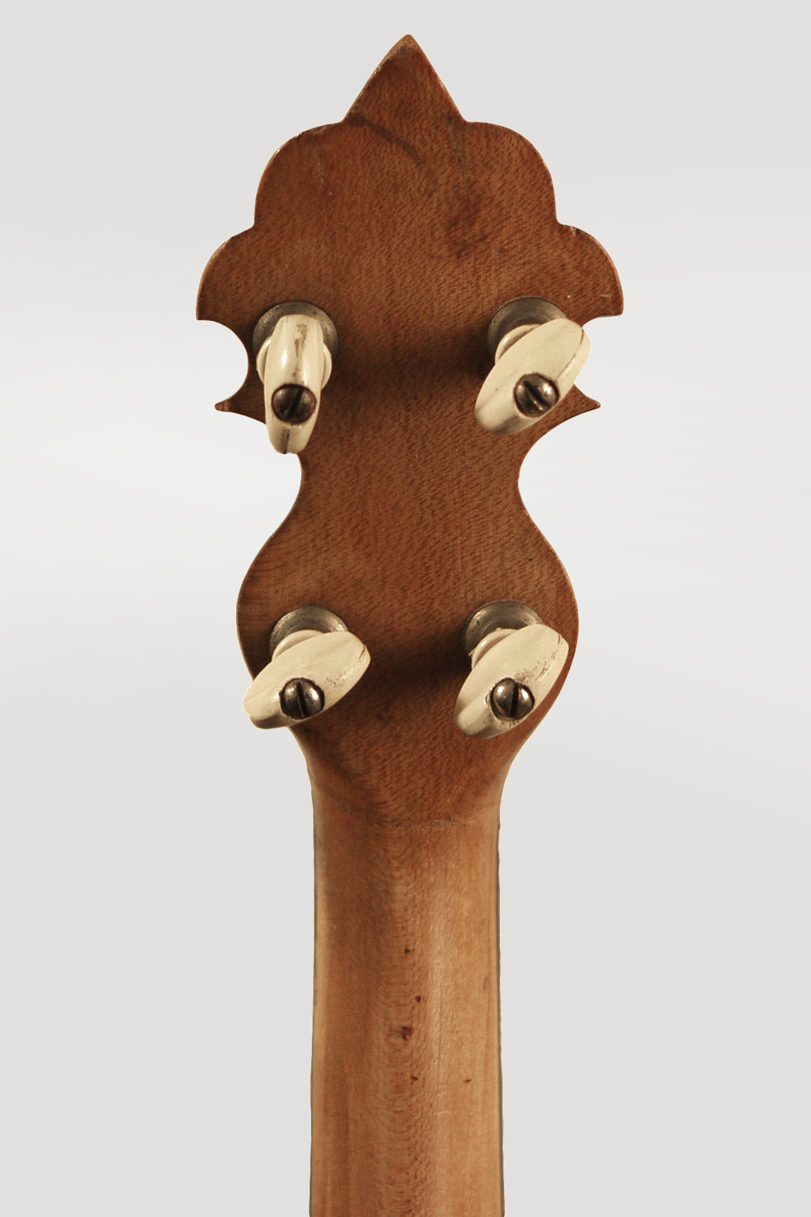 Overall length is 38 1/2 in. (97.8 cm.), 12 1/8 in. (30.8 cm.) diameter head, and 2 1/2 in. (6.4 cm.) in depth, measured at side of rim. Scale length is 28 1/2 in. (724 mm.). Width of nut is 1 1/4 in. (32 mm.). This banjo has wear general overall, most notably small nicks and dings to the back of the neck- it looks like a vintage capo was used at several positions but the wear is not too heavy and the original finish mostly intact. The dowel stick is the correct style (and unmarked) but we believe it to be an older replacement. The rim plating is moderately worn with some corroded spots to the sides and some of the hooks show rust spots but much of it is substantially intact. All hardware appears original except the fifth string peg is newer; the friction tuners are original and the tailpiece is a nice original No-Knot. The elegant original hooks and nuts are original except for one nut . Despite its Sears & Roebuck origins this is a fairly classy old banjo, with pearl inlay and good quality woods. This is set up with an old skin head that has some substantial staining and a newer bridge and plays and sounds very good. With its extra-long scale this banjo would be very suited to vairious drop-tuned frailing applications. Overall Very Good + Condition.