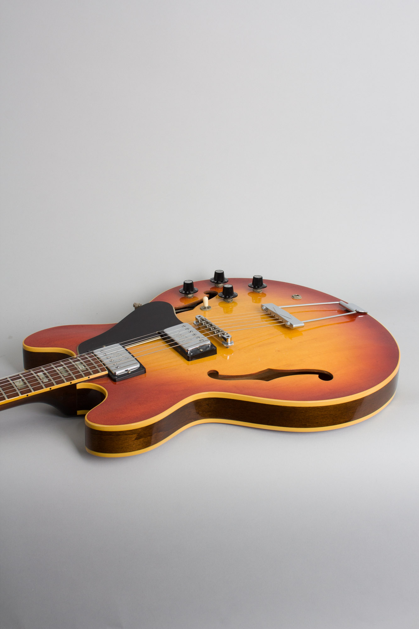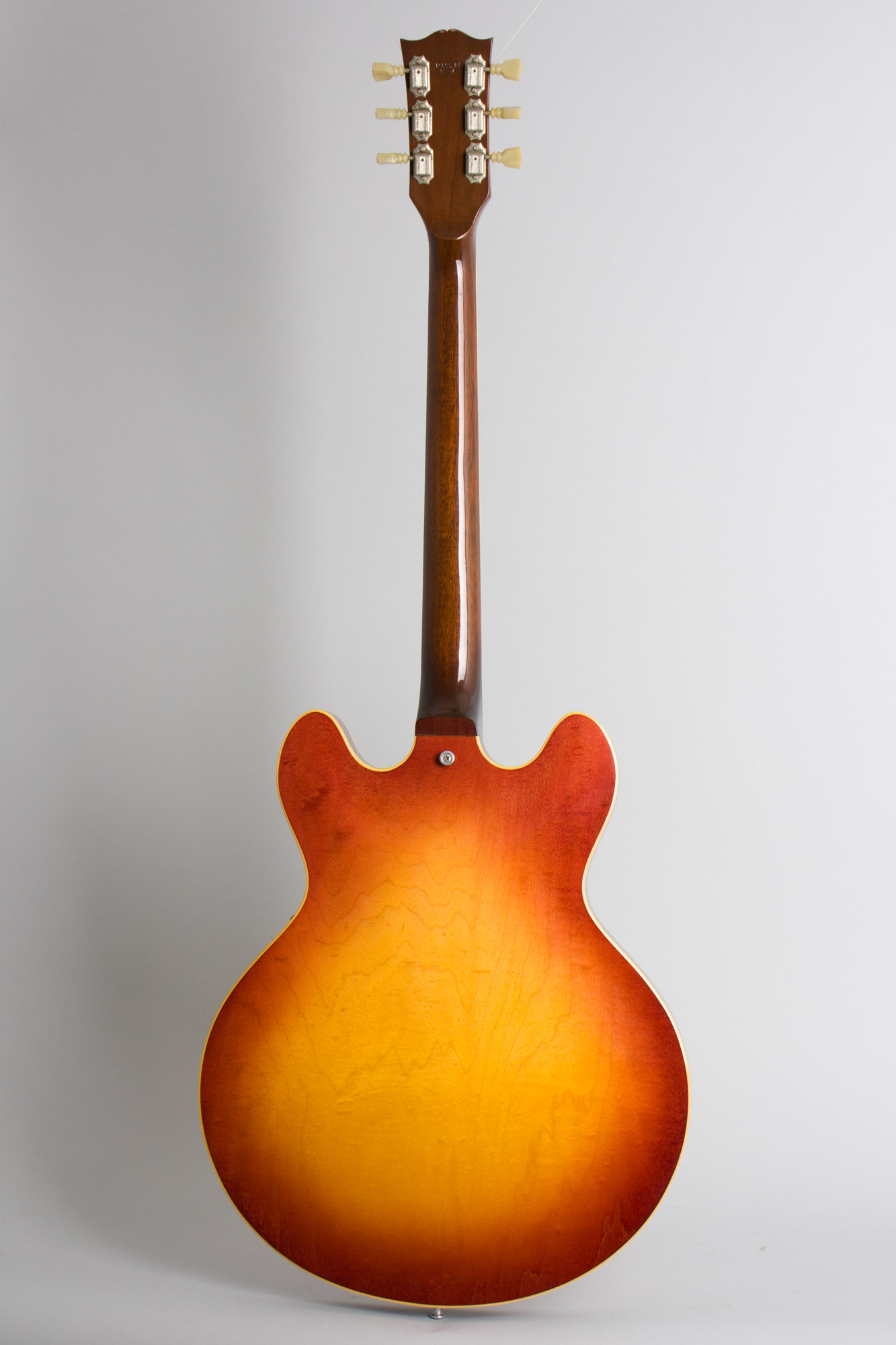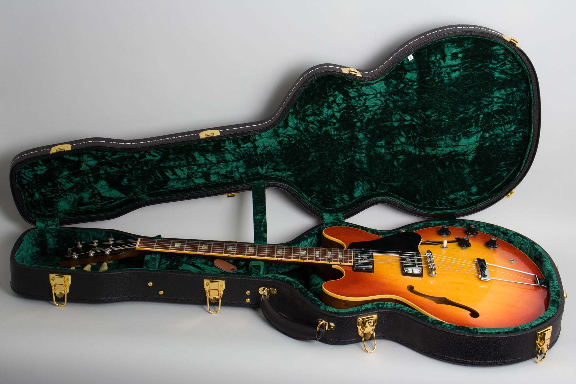 This is a clean and original guitar showing just some very light wear overall. The knobs are correct style repro pieces, all else appears original. The finish is very well preserved with some minor scuffing overall and a few small dings and dents. The only really noticeable wear is some scuffing on the pickguard and bridge pickup ring. The chrome plating is very nice as well, with the most notable wear being to the top of the bridge. The frets and fingerboard show some very little wear and this is an excellent player, with the caveat that the neck is the very slim profile of this period. This 335 is a nice piece from Gibson's early 1970's arsenal, a fine feeling and sounding guitar housed in a nice modern HSC. Excellent + Condition.