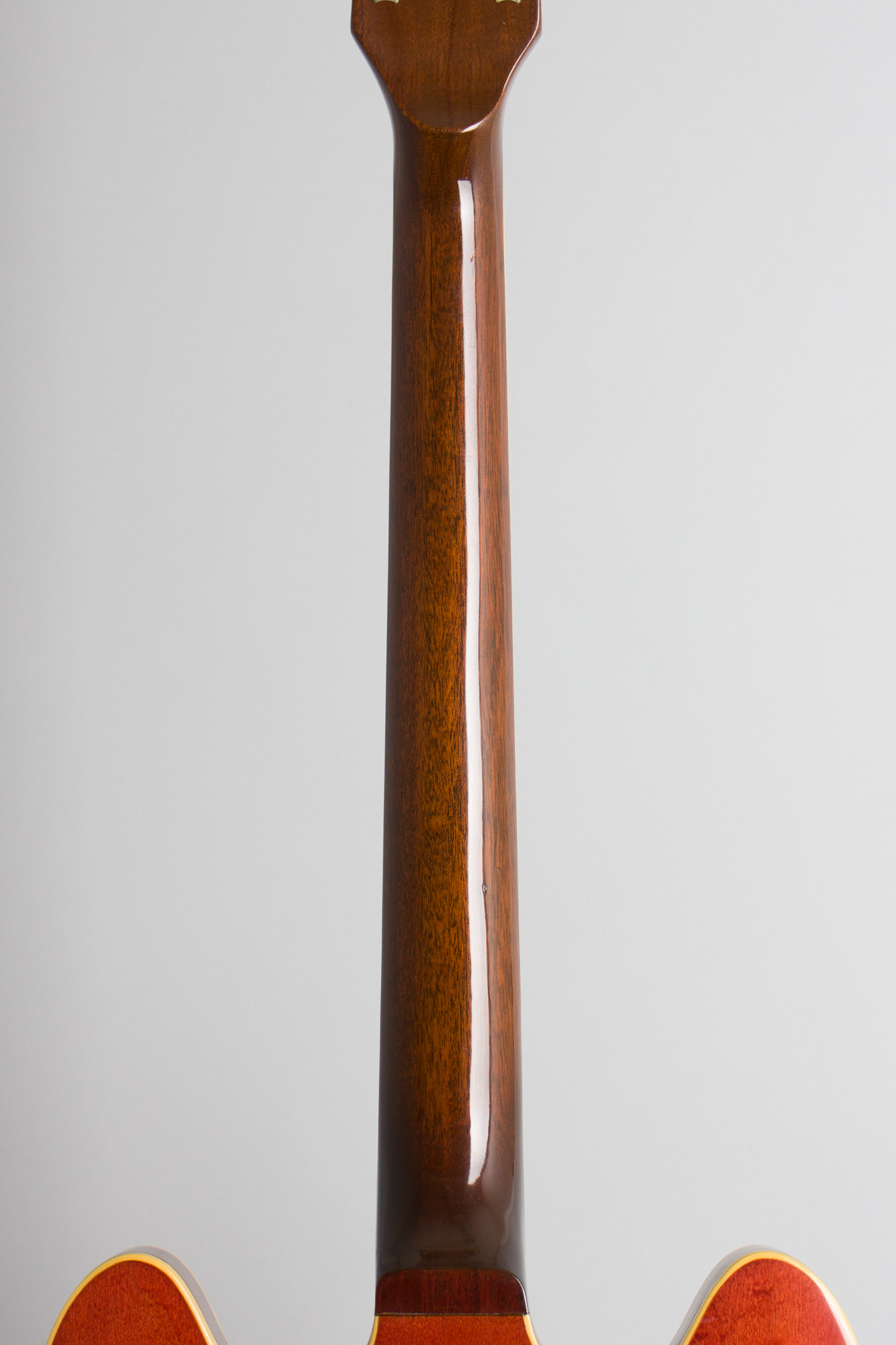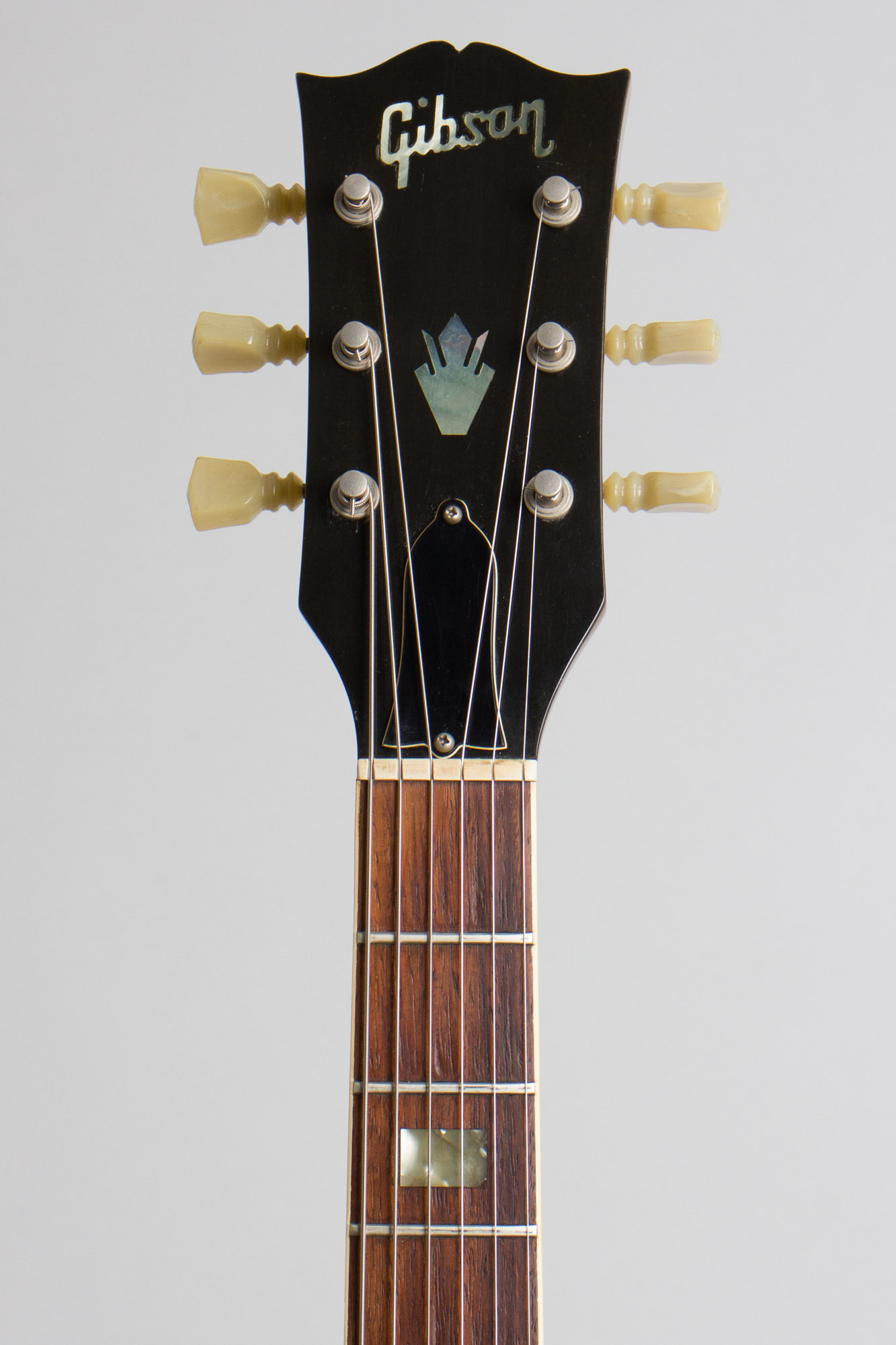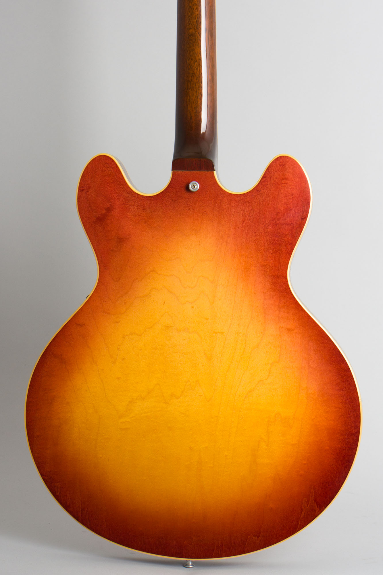 This is a clean and original guitar showing just some very light wear overall. The knobs are correct style repro pieces, all else appears original. The finish is very well preserved with some minor scuffing overall and a few small dings and dents. The only really noticeable wear is some scuffing on the pickguard and bridge pickup ring. The chrome plating is very nice as well, with the most notable wear being to the top of the bridge. The frets and fingerboard show some very little wear and this is an excellent player, with the caveat that the neck is the very slim profile of this period. This 335 is a nice piece from Gibson's early 1970's arsenal, a fine feeling and sounding guitar housed in a nice modern HSC. Excellent + Condition.