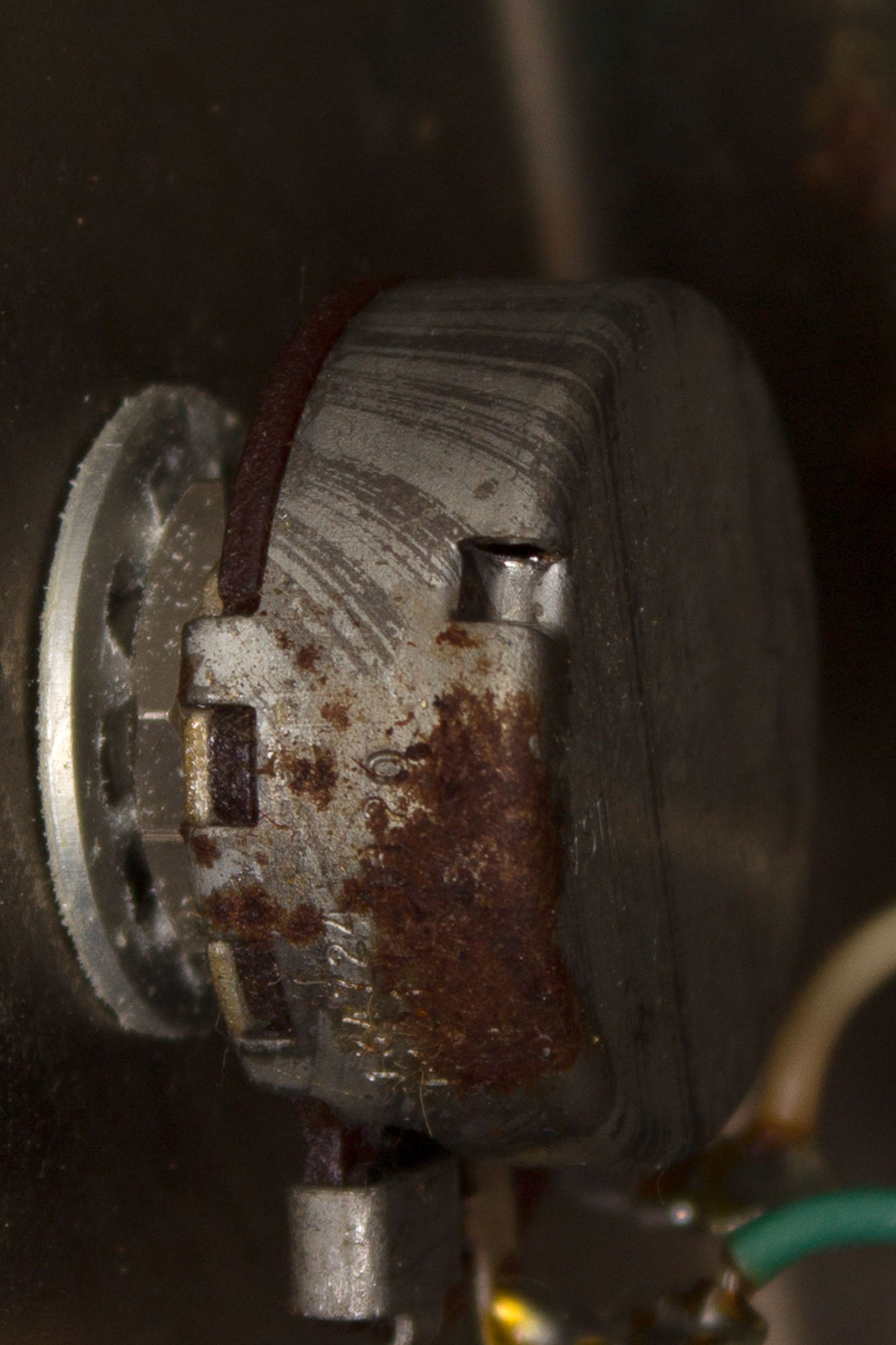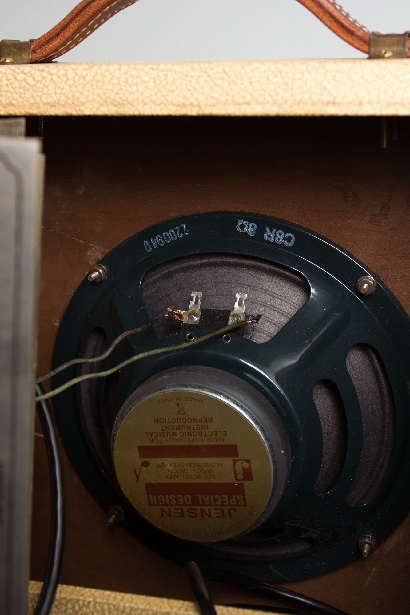Electrically, the amp is nicely original, retaining both the original power and output transformers, marked GA-5 and 549-732, respectively, dating the latter to the 32nd week of 1957. The volume pot is original and dates to the 24th week of 1957. The speaker is a newer 8" Jensen C8R ceramic speaker which compliments the amp wonderfully, allowing it to be cranked convincingly without endangering a fragile original cone. The amp has received our standard servicing, including replacement of all electrolytic capacitors, a 3-prong power cord as well as all jacks, sockets and pots cleaned and output tubes biased to spec.