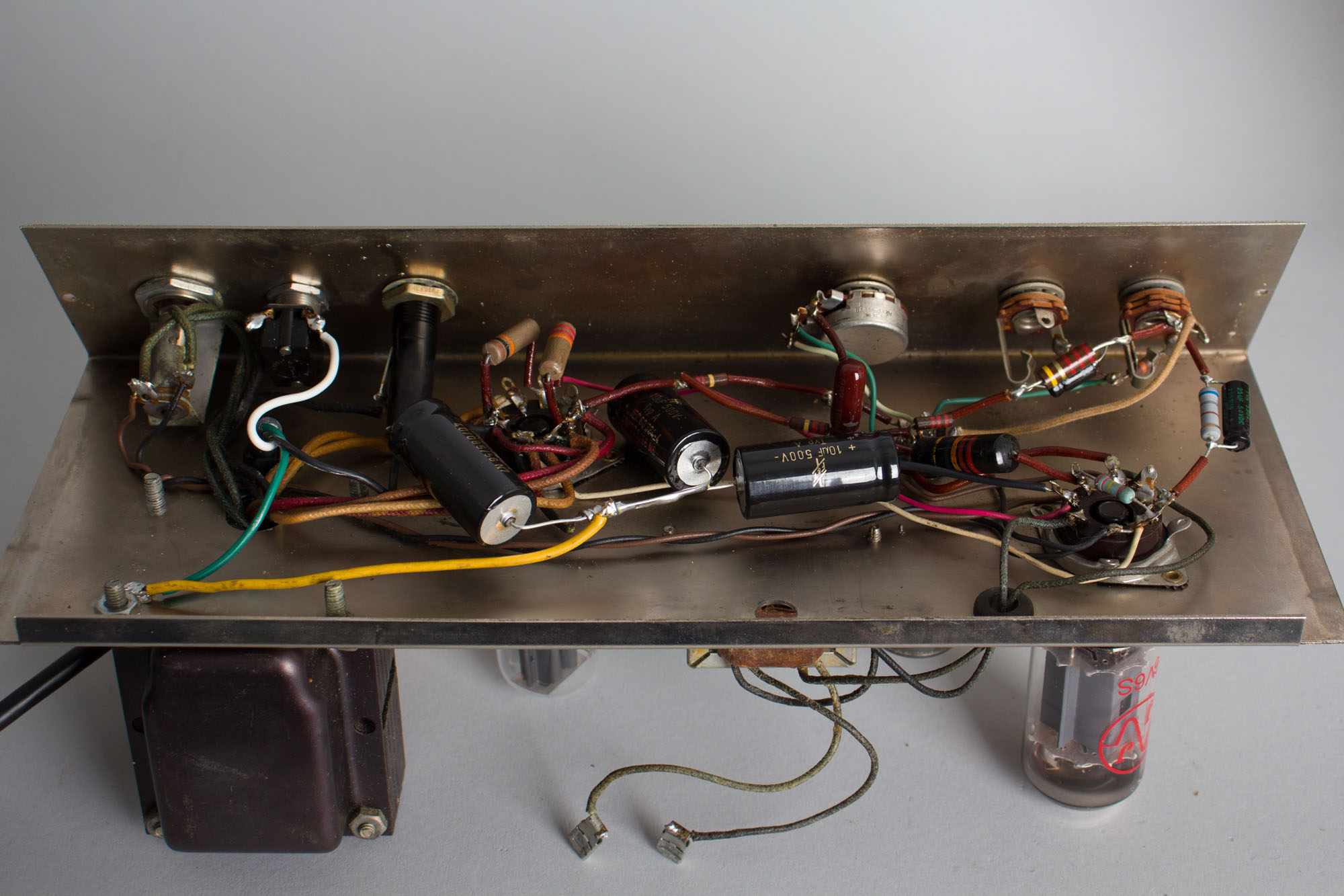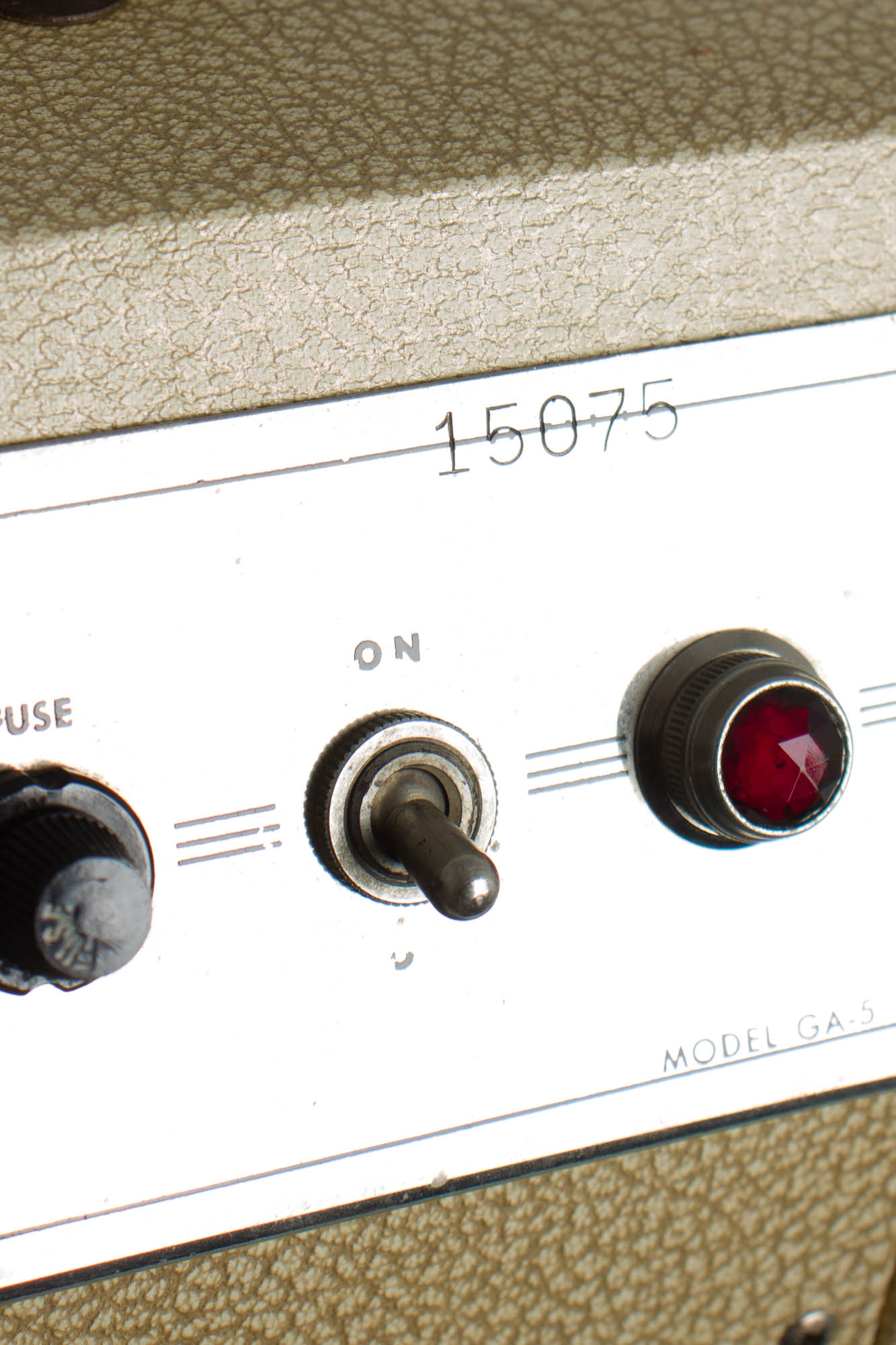 Electrically, the amp is nicely original, retaining both the original power and output transformers, marked GA-5 and 549-732, respectively. The original Jensen speaker, marked 220-043, dating it to the 43rd week of 1960, retains its original cone with a small patch on the lower side of the surround. The pot is marked 134-6005, dating it to the 5th week of 1960. The amp has received our standard servicing, including replacement of all electrolytic capacitors, a 3-prong power cord as well as all jacks, sockets and pots cleaned and output tubes biased to spec.