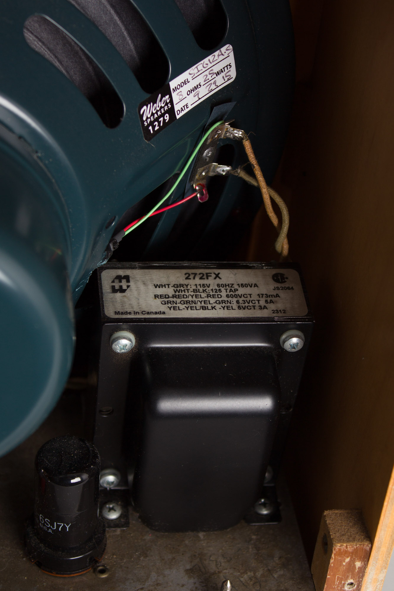 Electrically, the amp has seen some restoration work. At one point, the power transformer was replaced, presumably to make the amp safe to use with modern standards in mind, as some Electar amplifiers were offered to run on DC input power. The speaker was also replaced with a newer Weber 12A125 AlNiCo speaker, which suits the amp very well and sounds great, allowing its natural overdrive capacity full reign. The circuit has otherwise been restored as true as possible to original early Electar schematics and includes our typical maintenance and servicing; replacement of electrolytic caps, cleaned sockets, pots and jacks, grounded 3-prong power cord and power section biased to spec.