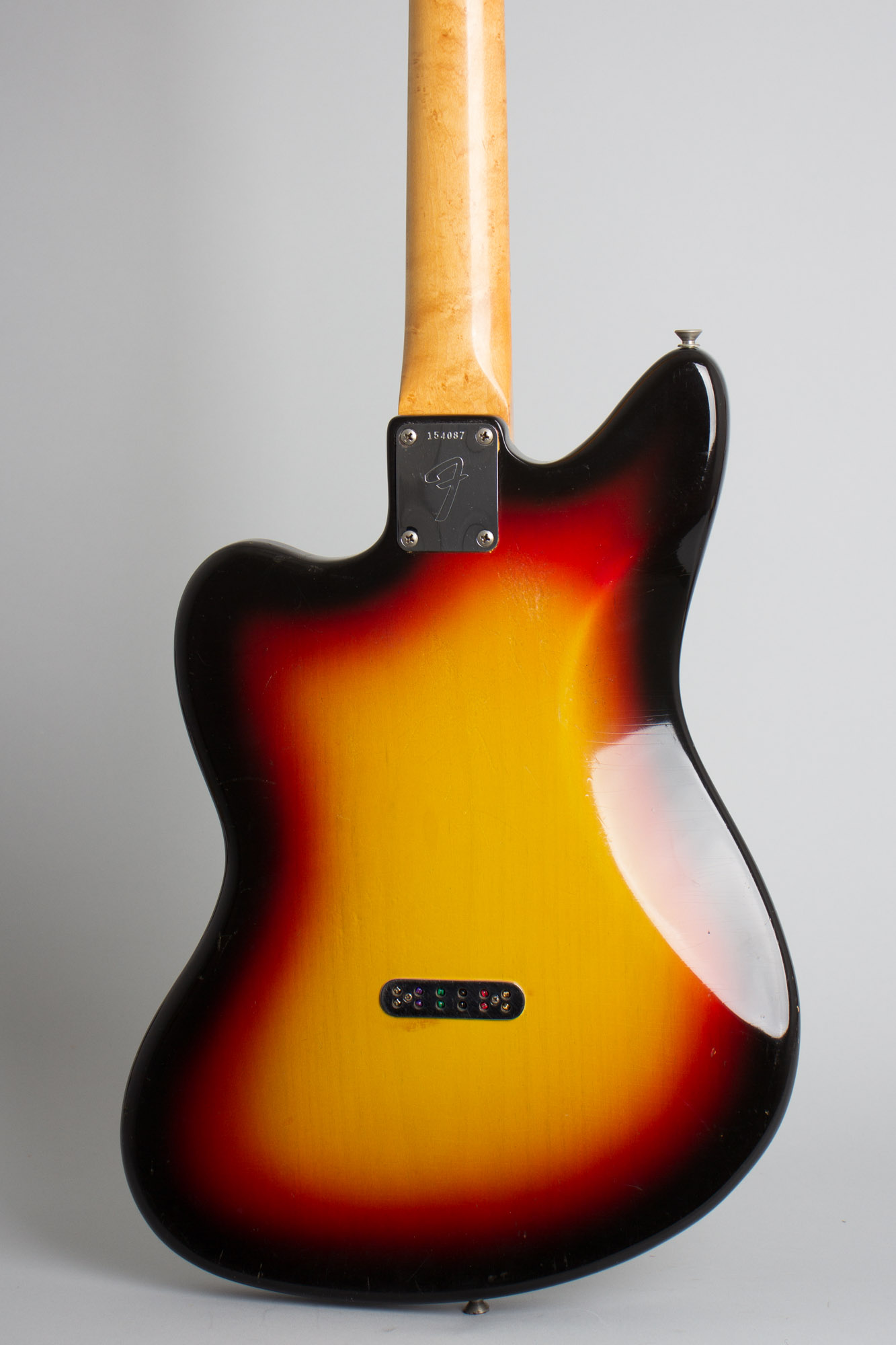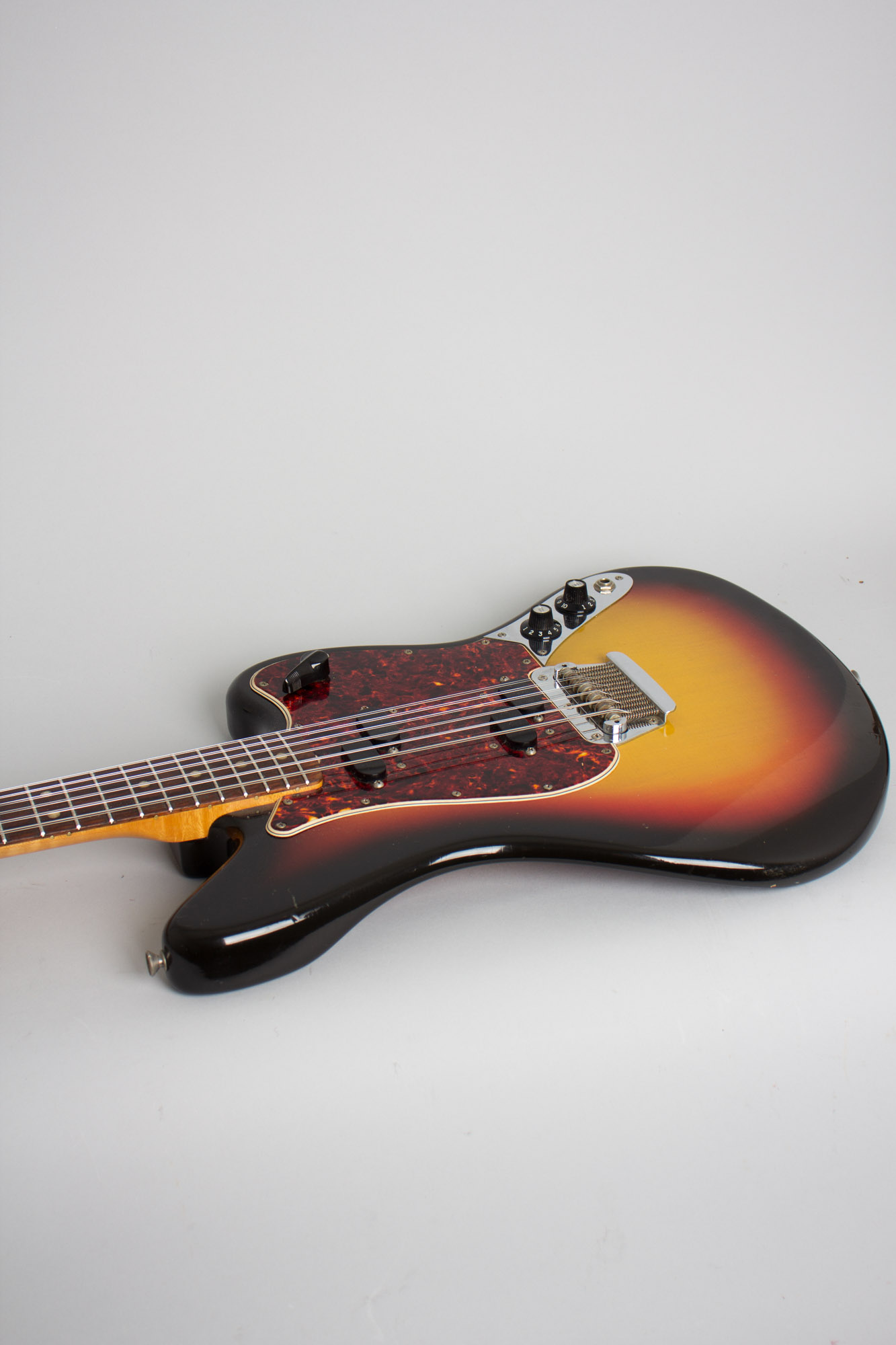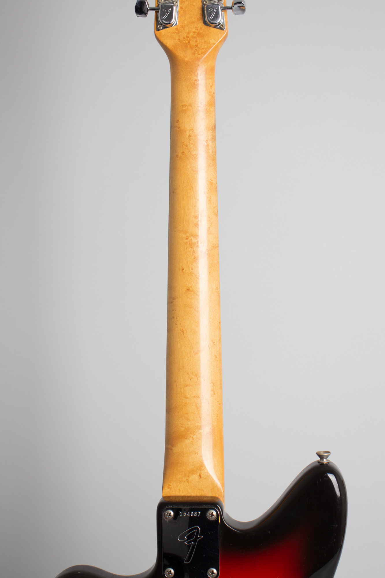 This is a fine example of this relatively unsung Fender gem overall, remaining nicely original and showing just some fairly minor wear overall with typical checking and smaller dings, dents and handling wear. There is some noticeable belt buckle wear into but mostly not through the finish on the back some finish worn off the back of the neck; the lacquer checking is heaviest on the headstock. The "target" sunburst finish is still bright with virtually no fade to the color. This guitar has been refretted with appropriate wire, it is otherwise unaltered and looks to have not really been played that much since it shipped out of Fullerton in 1966. Overall this is a lovely package of 1960s timeless jangle from Fullerton, housed in a recent HSC. Overall Excellent Condition.
