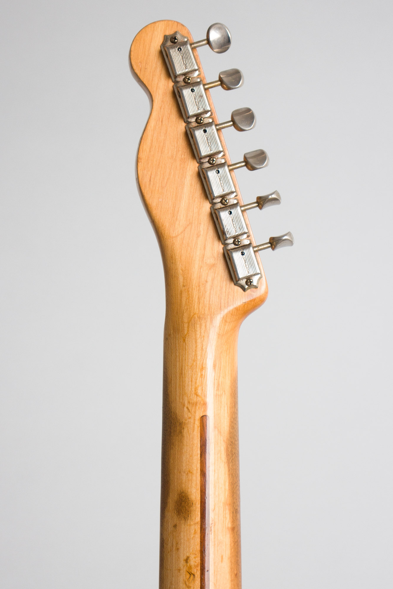 The one-piece maple neck is dated 3-57 on the heel. It has a fairly soft "V" profile with a rounder spine than some '57's and fills the hand nicely. On the headstock the script Fender "Telecaster" logo decal still sits above the newer style "butterfly" string tree. The tuners are the typical clipped Kluson Deluxes used on all Fenders in the 1950s.