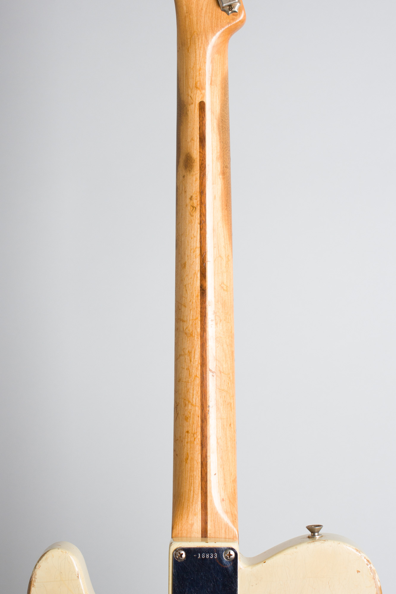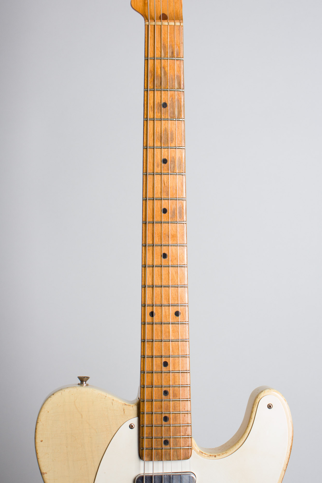 The most noticeable difference from earlier Teles is the single-ply white plastic pickguard, which started to replace the earlier black phenolic on Telecasters and Precision Basses in 1954-5. The grained ash body is finished in naturally aged white-blonde lacquer, showing just a slight yellowish cast but not amber-colored as the earlier '50s style ages into. This look would be the norm right into the '60s. Despite seeing some gigging use the body appears not much "smoked" and retains the lighter blonde look.