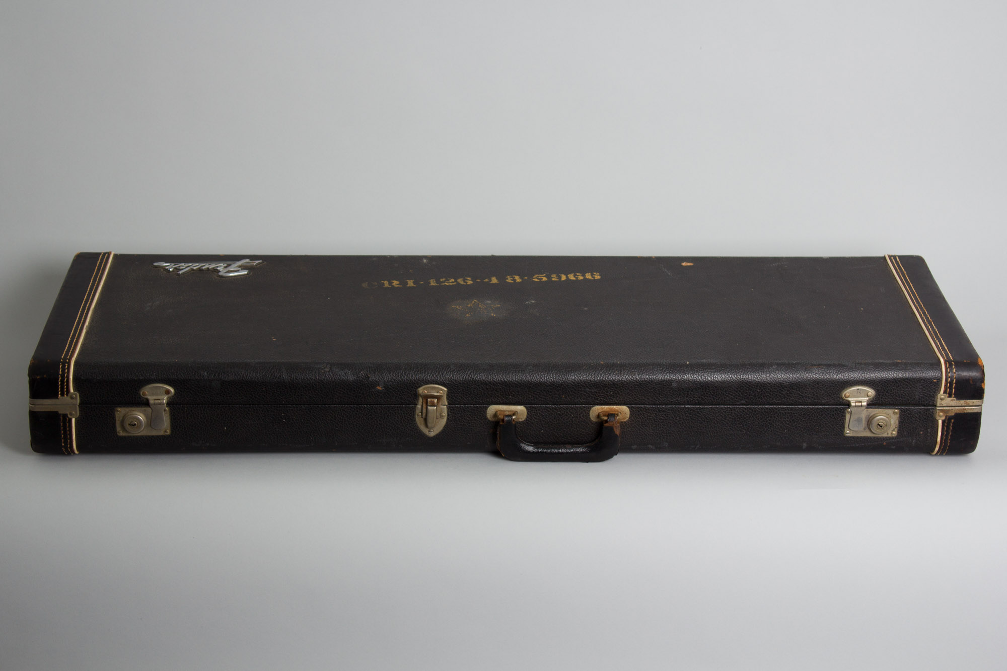 Internally there are a few typical minor alterations. The neck pickup is a black-bobbin unit with the old "Seymourized" sticker on the bottom marked with a hand-notated number in marker, which indicates it is an early Seymour Duncan rewind. The bridge pickup remains the original '60s styled grey bobbin unit with a copper grounding plate. The pots are original with a new 3-way switch and some attendant re-wiring visible; the original switch is in the case pocket with a damaged frame leaving it non-functional. The knobs appear recent but the correct style. All other hardware is original, even the snap-on bridge cover is still intact.