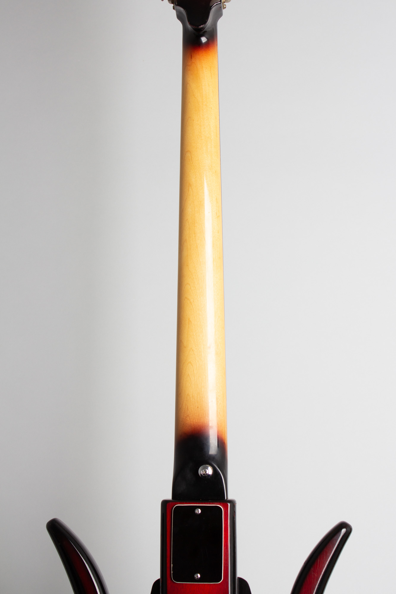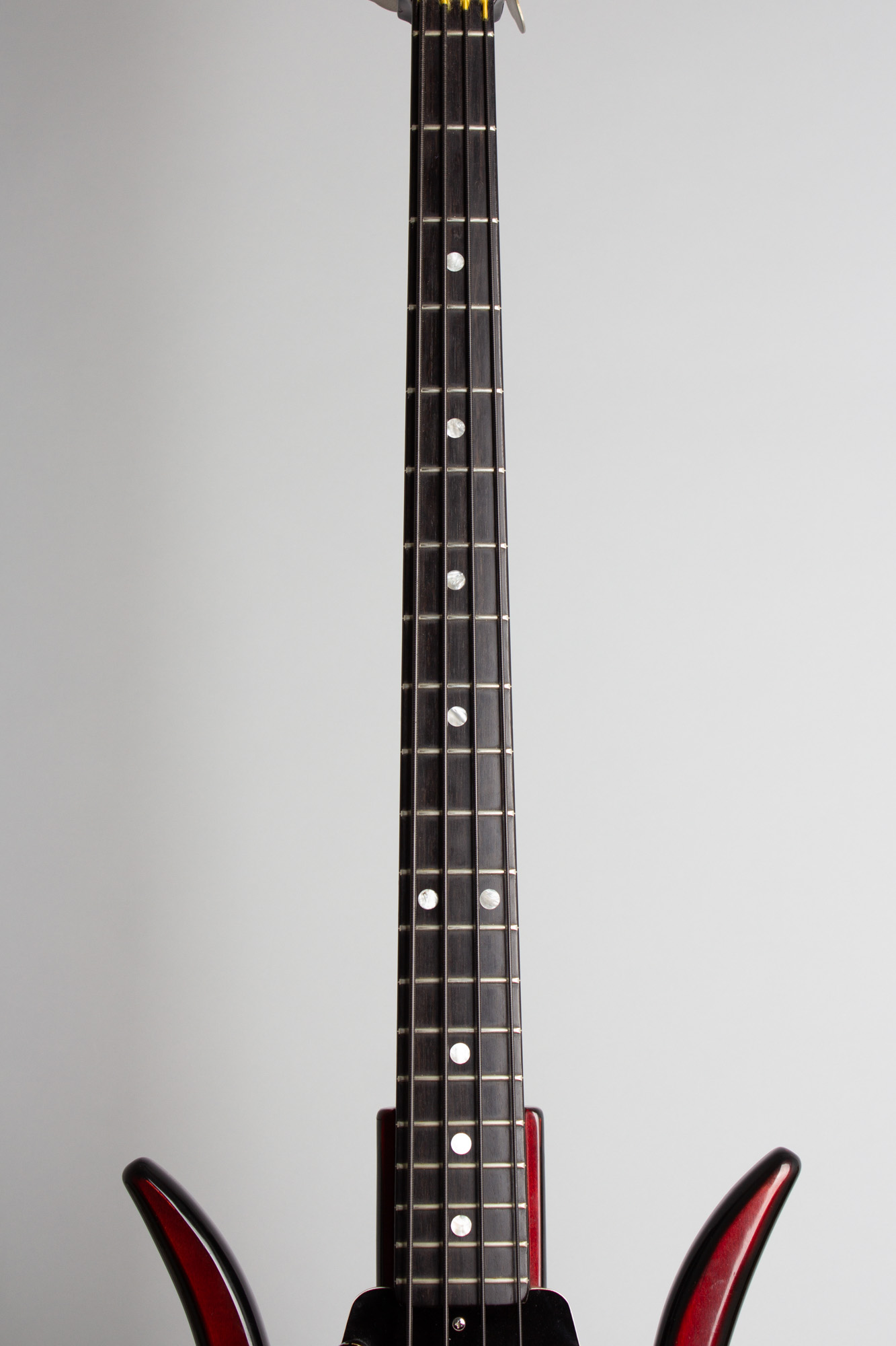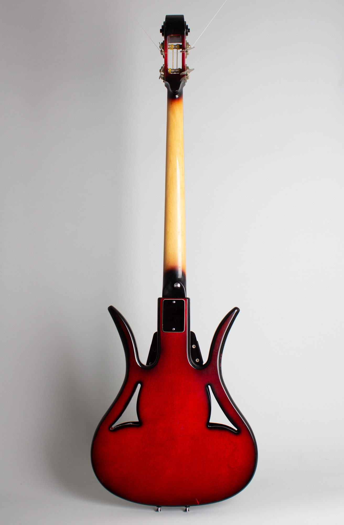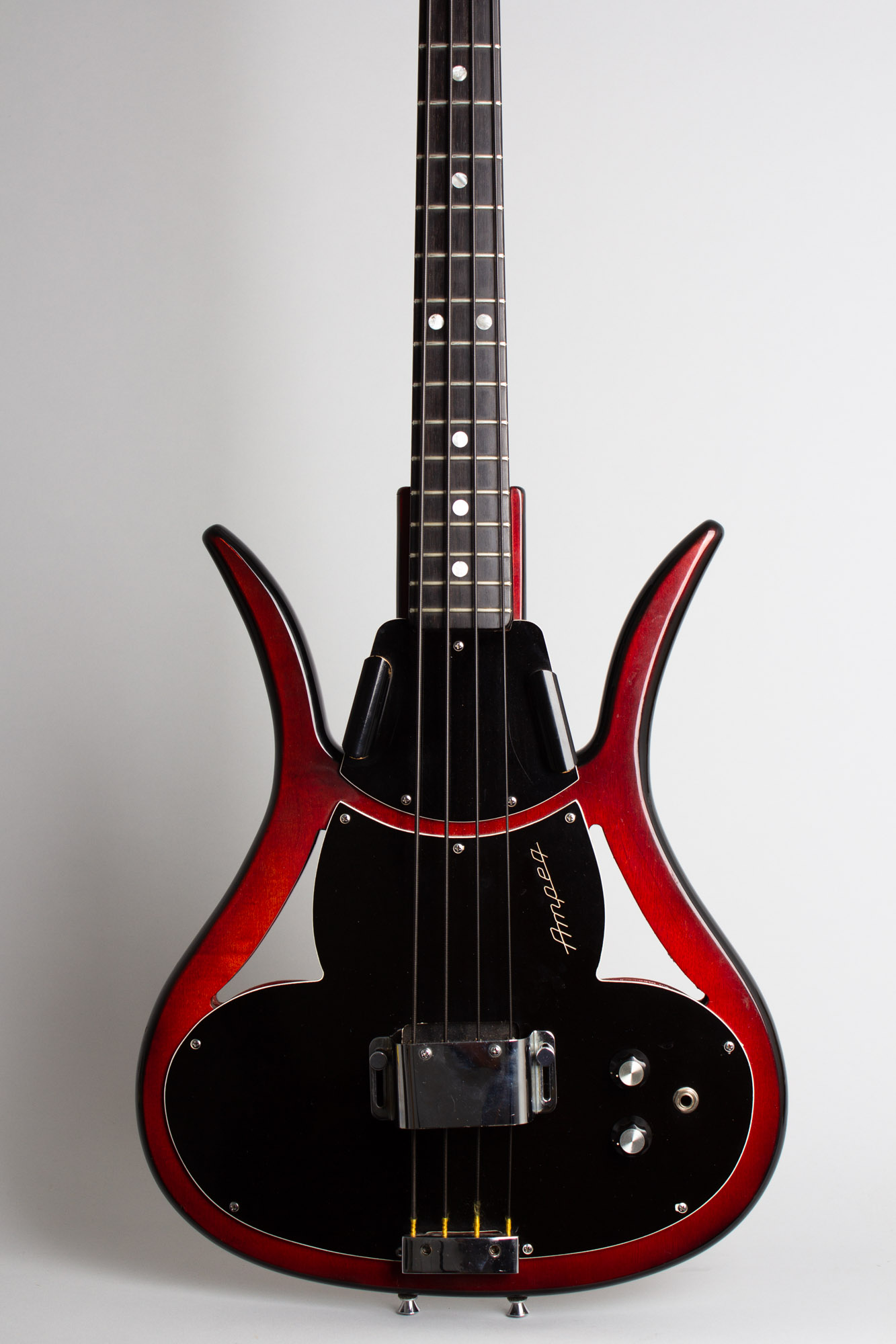Ampeg had these in production by late 1966, offering fretted and fretless models of the more conventional AEB-1 and AUB-1, with these alternate "Devil" models designated ASB-1 and AUSB-1. This bass is a wonderful example of the fretted ASB-1, almost certainly the rarest of the lot. They were considered an 'alternate design' to the offset, F-hole body models and only produced in tiny numbers compared, most estimates are a couple of dozen at best.