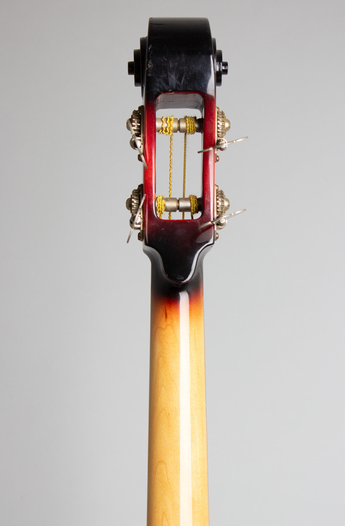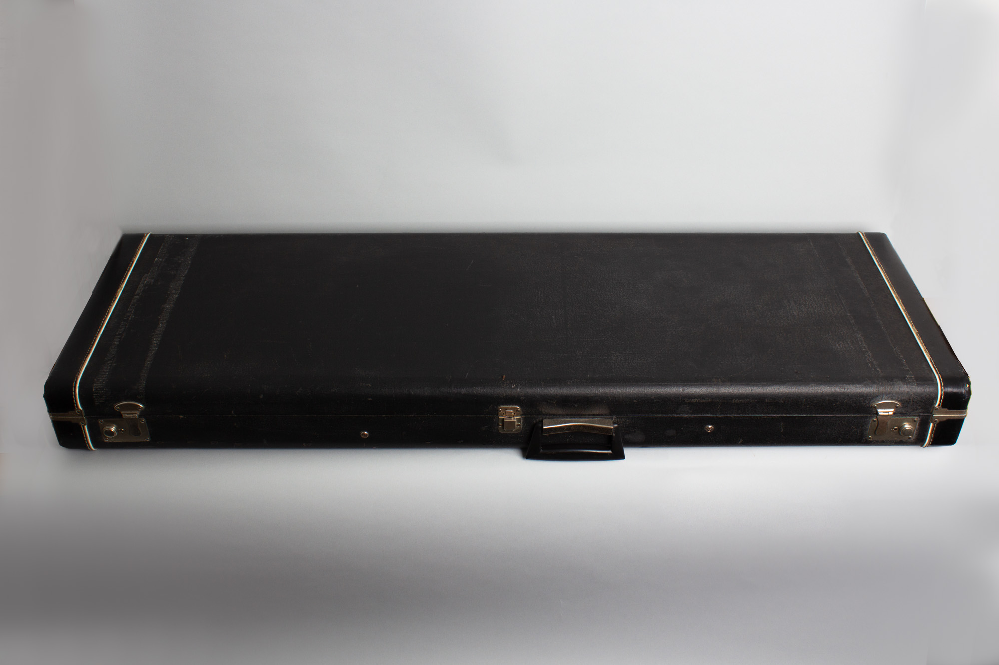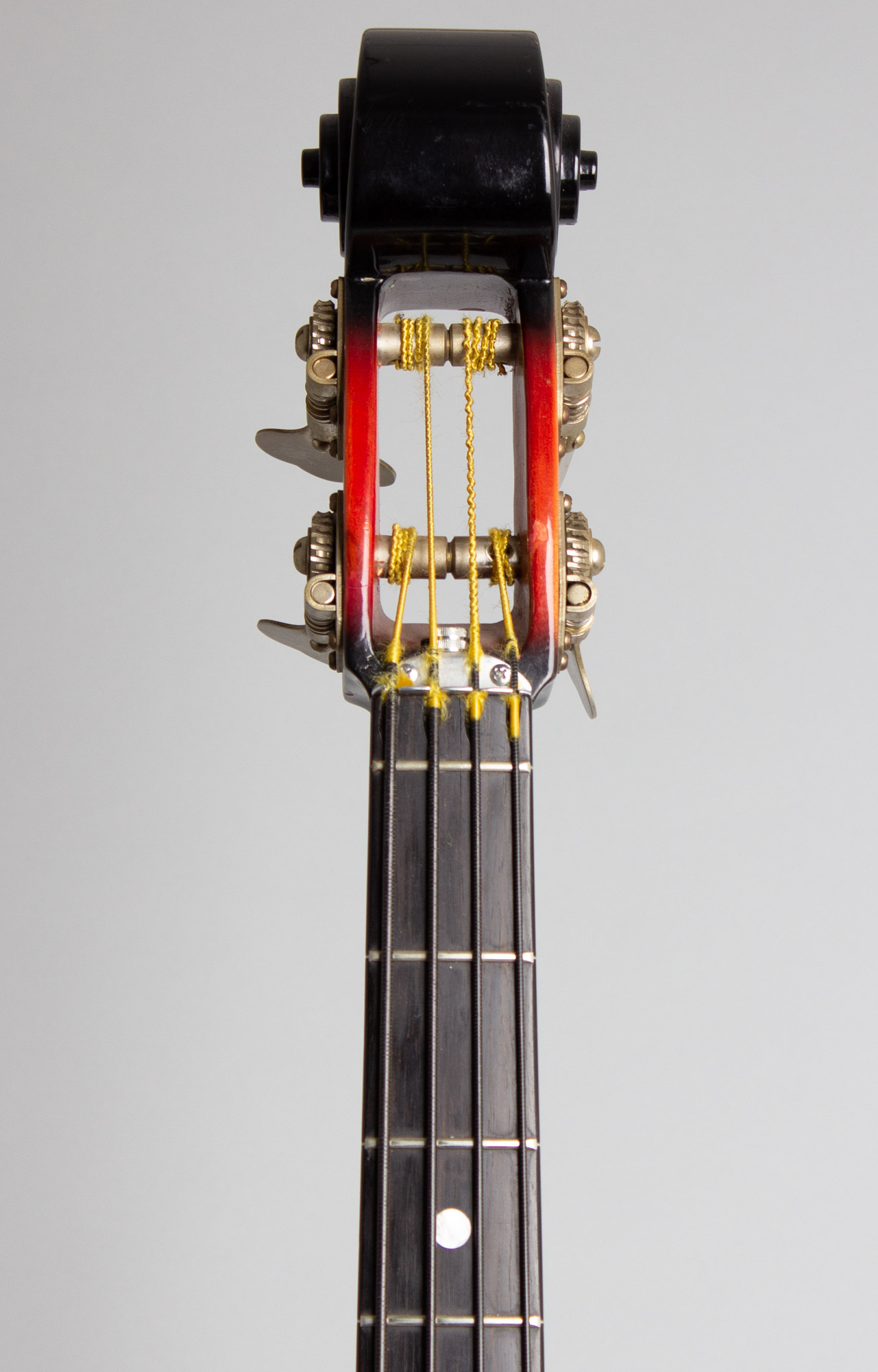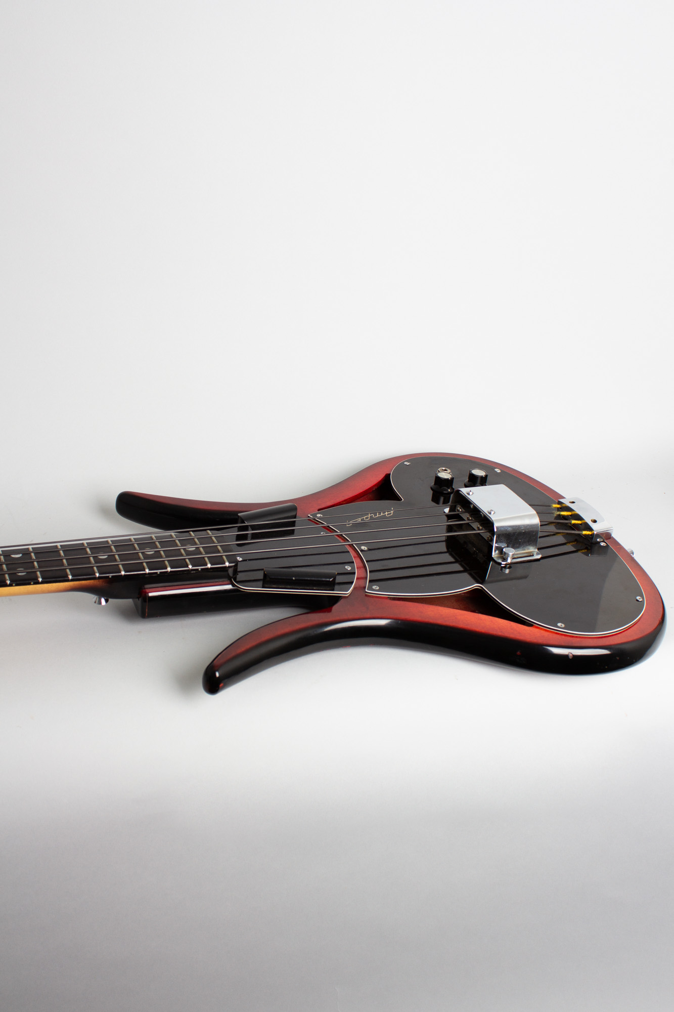 All hardware is also original; even the sliding bridge cover and mounting bolts are still intact and working, which is usually not the case. This ASB-1 is set up with nylon flatwound strings and is easily the best playing Ampeg mystery-pickup bass we have had, with a perfect neck and strong signal from the under-saddle unit. It is eccentric-sounding for sure, but it performs exactly as intended. A superb example of this unique New Jersey creation, one of the most interesting and distinctive of all vintage American basses. The large and somewhat cumbersome original HSC is included, apart from a broken center latch still fully functional. Overall Excellent + Condition.