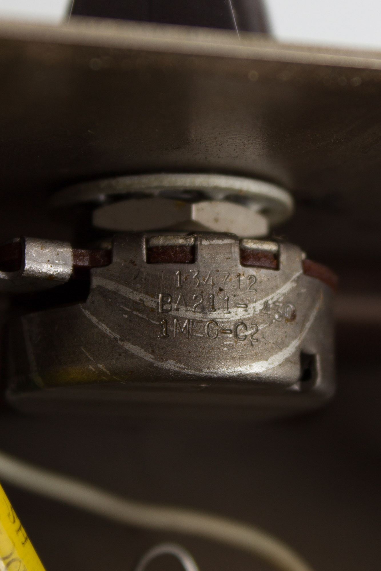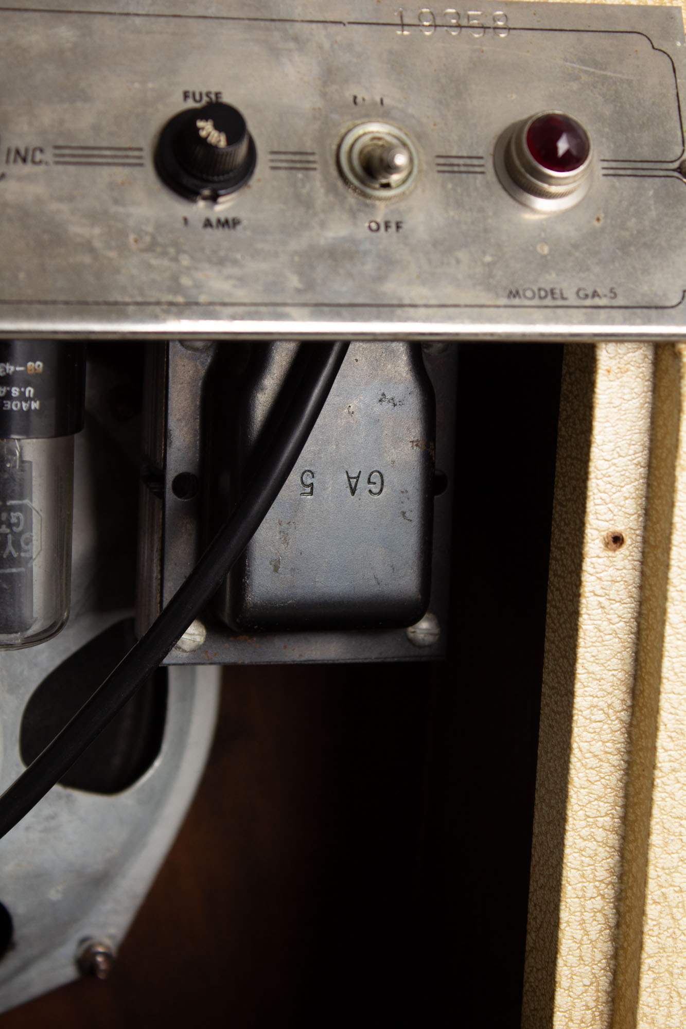 Electrically, the amp is nicely original, retaining both the original power and output transformers, marked GA-5 and 549-849, respectively, dating the latter to the 49th week of 1958. The volume pot is original and dates to the 12th week of 1957. The original Jensen 8" speaker is still intact and bears the code 220-843, dating it to the 43rd week of 1958. The amp has received our standard servicing, including replacement of all electrolytic capacitors, a 3-prong power cord as well as all jacks, sockets and pots cleaned and output tubes biased to spec.