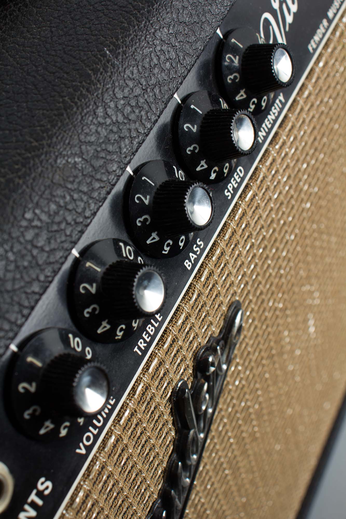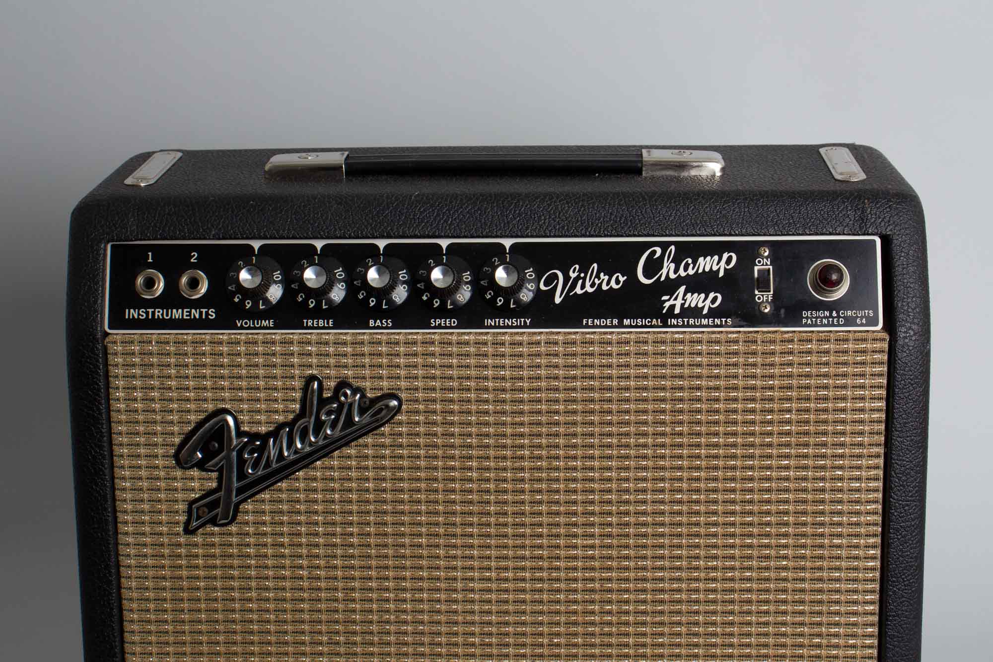 After a run of transitional 5F1 models in the old box but covered in black Tolex, the new "black panel" series brought forth a completely new Champ and Vibro-Champ, sharing the updated exterior appearance and the bass and treble tone stack of the rest of the line-up. The Vibro-Champ also featured vibrato, the first appearance of an onboard effect in Fender's most affordable beginner-level/student amps. Originally listed for $79.50 in the '65 catalog the Vibro-Champ offered excellent value with two instrument inputs, volume, treble and bass controls, and speed and intensity knobs for the tremolo effect. A single 6V6 Class-A power section driving a single 8" Fender-branded Oxford speaker yields around 5-6 watts of power, keeping with Champ tradition.