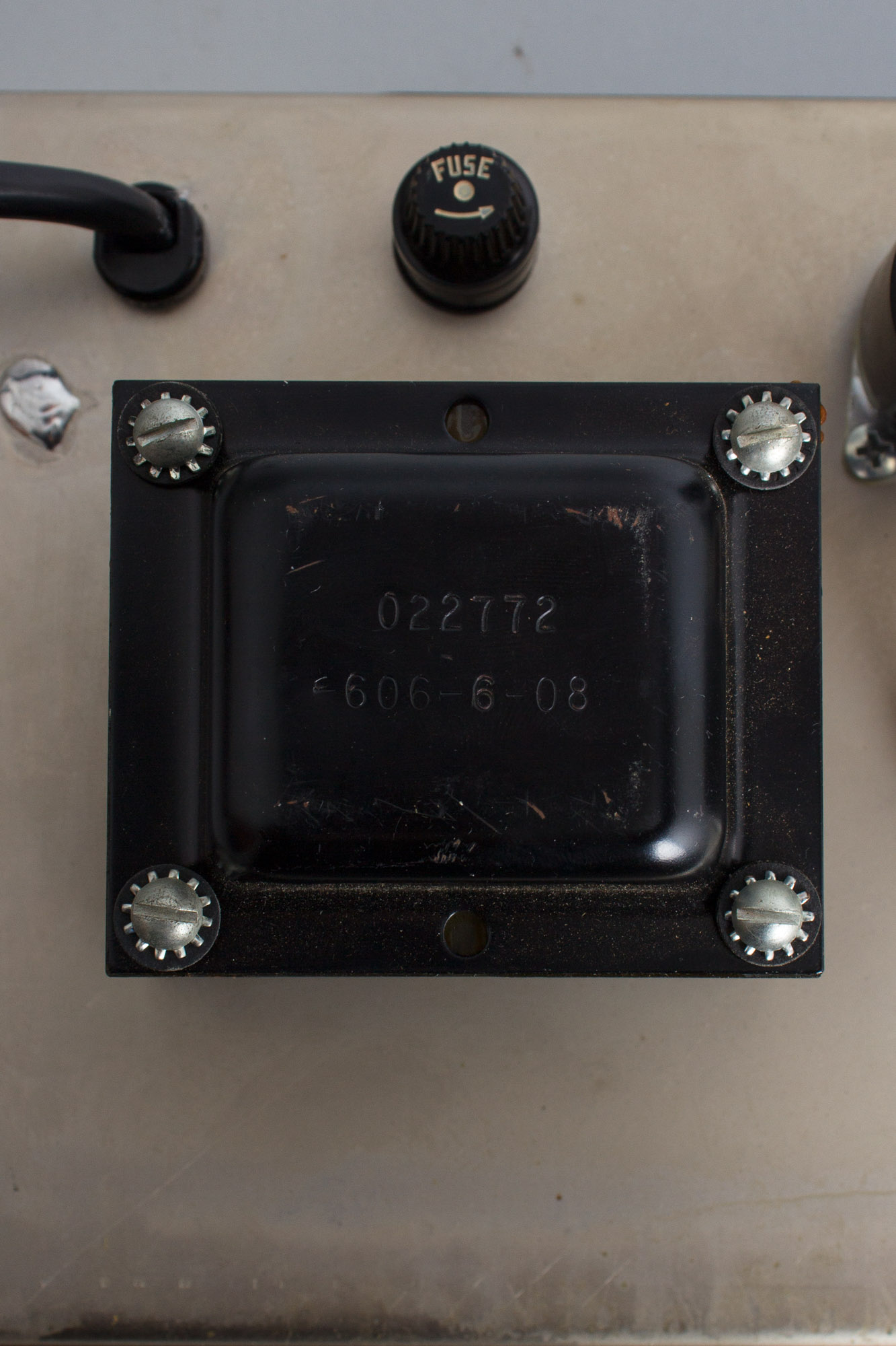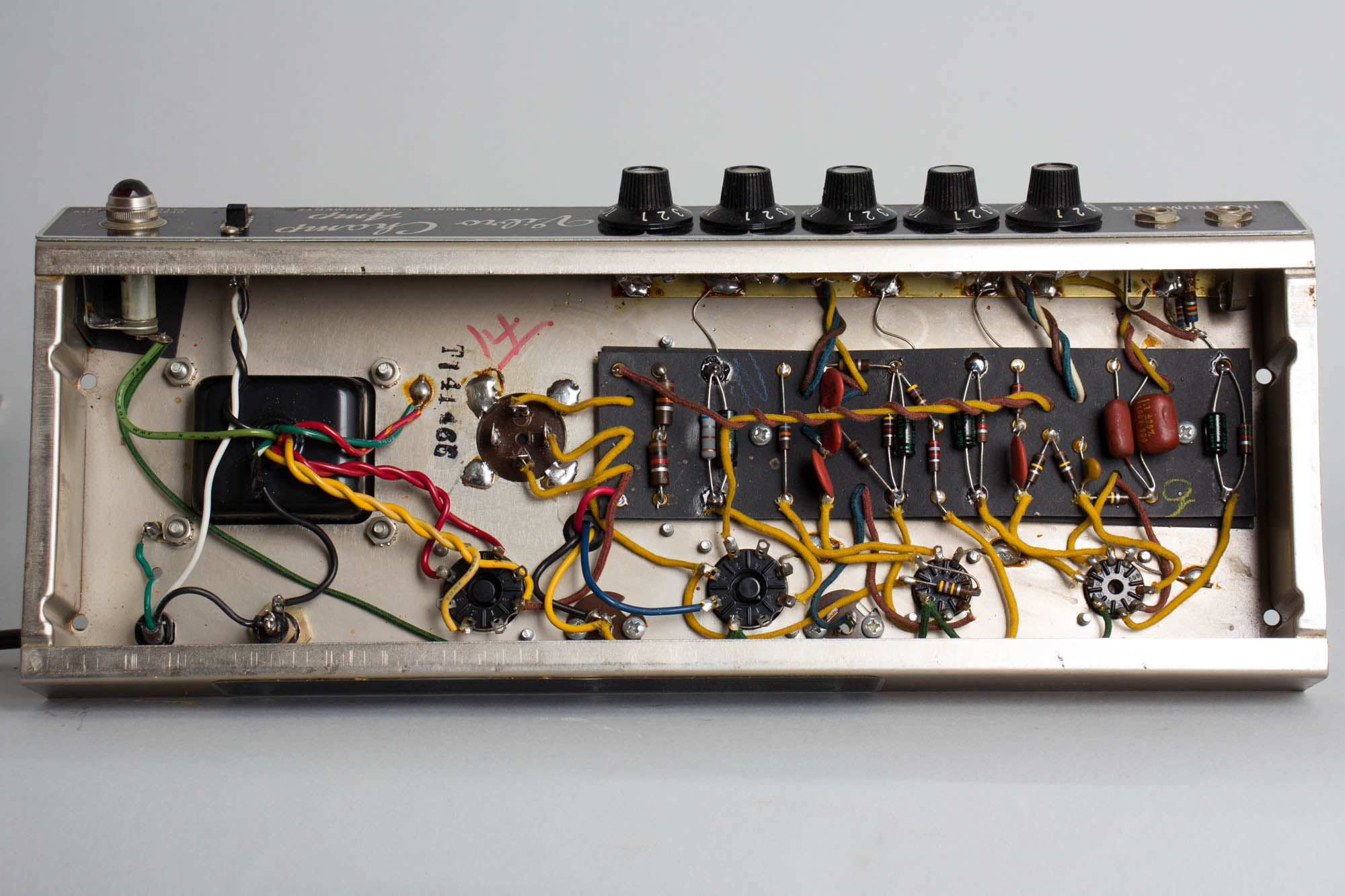 The tube chart is stamped "PD", indicating assembly in April, 1966. The speaker is the original Oxford 8EV-52 is marked 465-545, dating it to the 45th week of 1965. The power and output transformers are both original and are stamped 606-608 and 831-6601, dating them to the 8th and the 1st week of 1966, respectively. All visible pot codes date between 1964 and 1966. The amp has been professionally serviced, including our standard replacement of all electrolytic capacitors, removal of "death" cap and a three-prong power cord installed, as well as cleaning of all sockets, pots and jacks and power section biased to spec.
