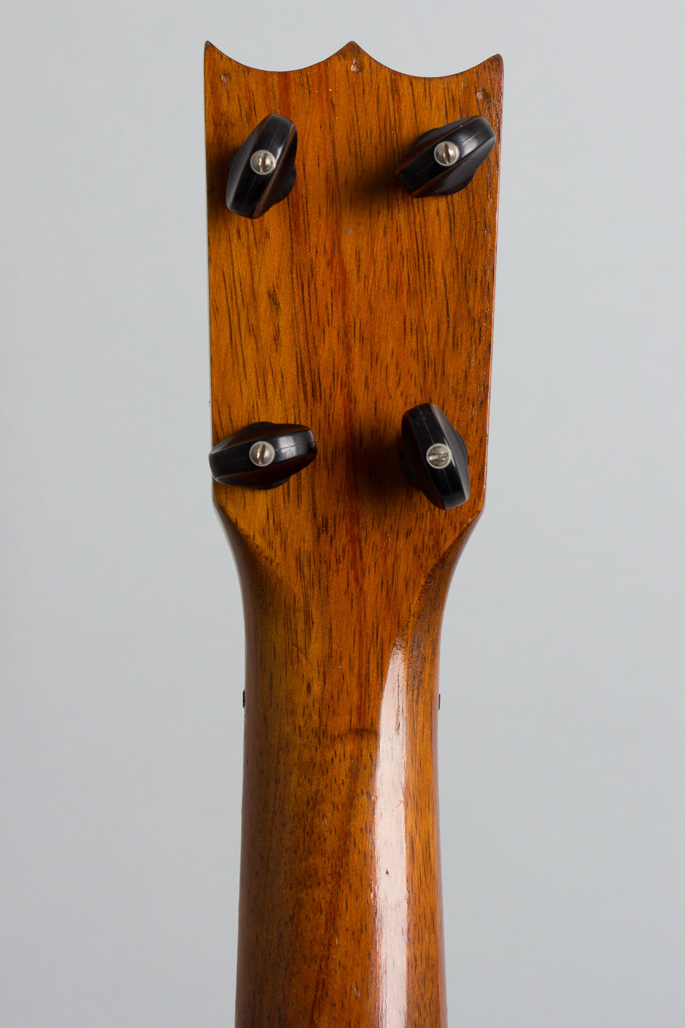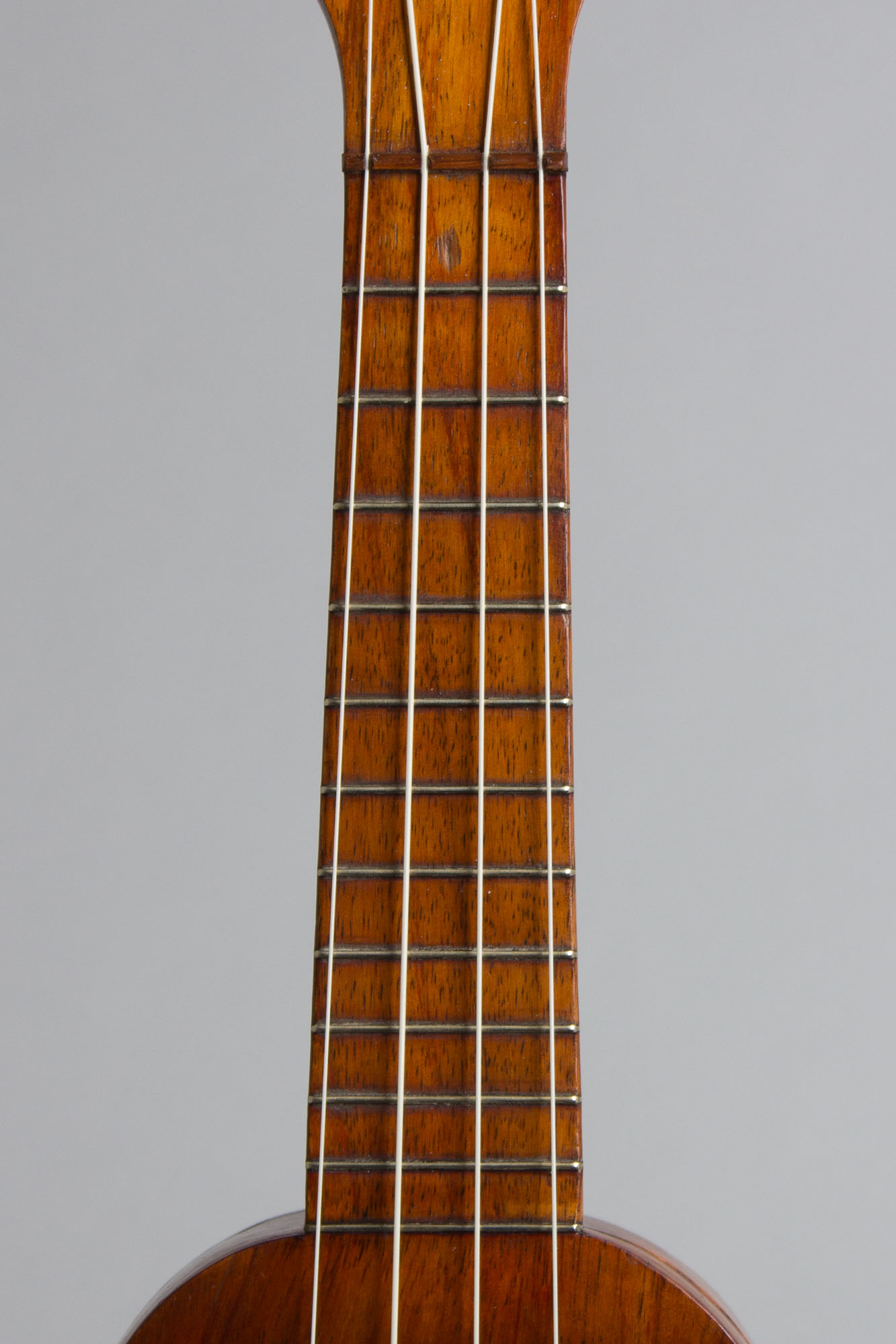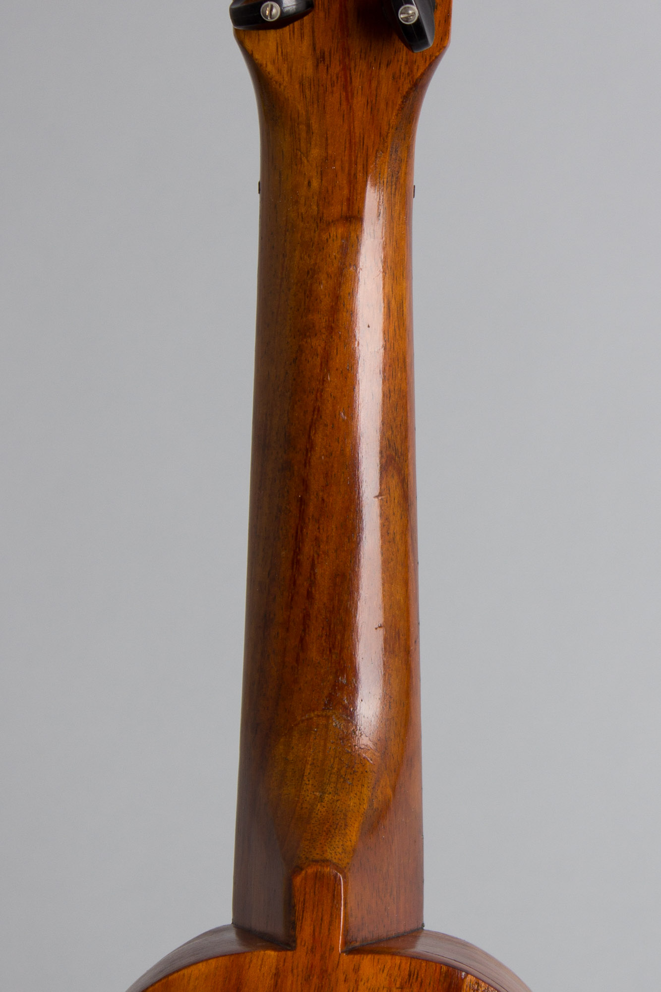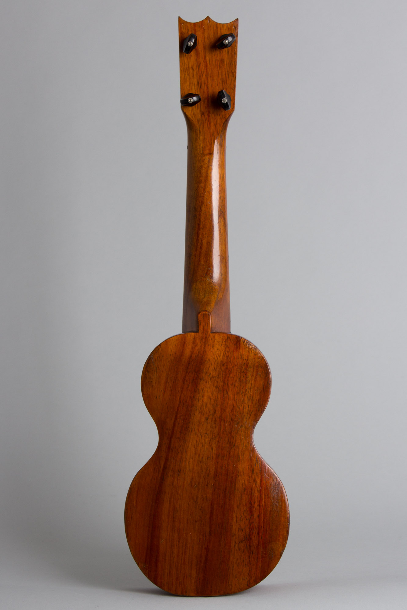 This plain but elegant "Echo-Uke" looks to date to the early/mid-1920s, built with the original narrow-waisted Hawaiian shape. It is made entirely of Koa in the native style and branded with the Hawaiian crest on the headstock with a label under the soundhole reading "Deep Toned ECHO UKE 10 year old koa wood" and "Made in Hawaii" prominently noted. The builder is listed as the Hawaiian Mahogany Company. This uke was likely originally sold out as a souvenir of the islands but is a quality instrument, actually more neatly made than many genuine Hawaiian instruments.