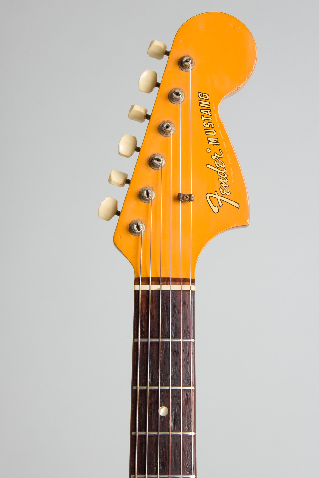 This is a superb early original example of the least common stock version of one of Fender's more whimsical late 1960s creations, the Competition Mustang. This guitar was built at the beginning of the run for the then-new "Competition" version of the model. These were introduced in the May 1969 issue of FENDER FACTS to freshen up the Mustang's appeal, incorporating "added features and all new styling". The Orange "car" finish and "racing" stripe on the body (and a snazzy matching headstock) were meant to evoke the car culture "The kids" were thought to be digging at the time. "Competition Mustangs hit the line" was the headline "three diagonal competition stripes race across the body -- big, bold, bright".