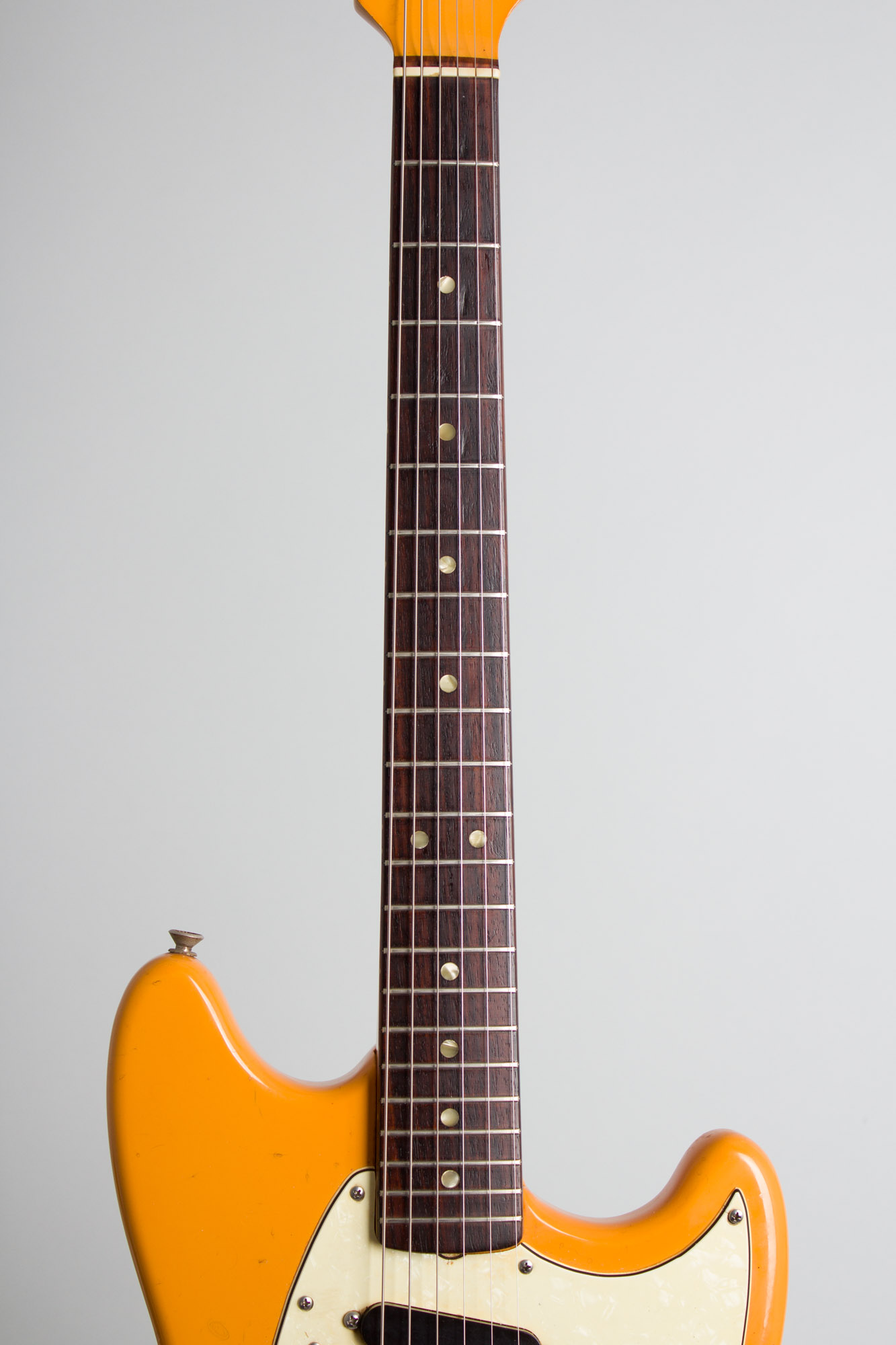 Originally introduced in mid-1964, the Mustang was one of Leo Fender's last major original designs for the company that bore his name. Although intended as a student model, the easy handling short scale guitar with vibrato has been used by many professionals over the decades since and endured as a classic in its own right. The Mustang has proved a timeless favorite of countless garage and pro bands from the 1960s and '70s until today, easily exceeding Leo's original intentions as a simple but effective student instrument. This orange-with-matching-head Competition model is easily the rarest stock variant, just a neat guitar all around and a very cool find.