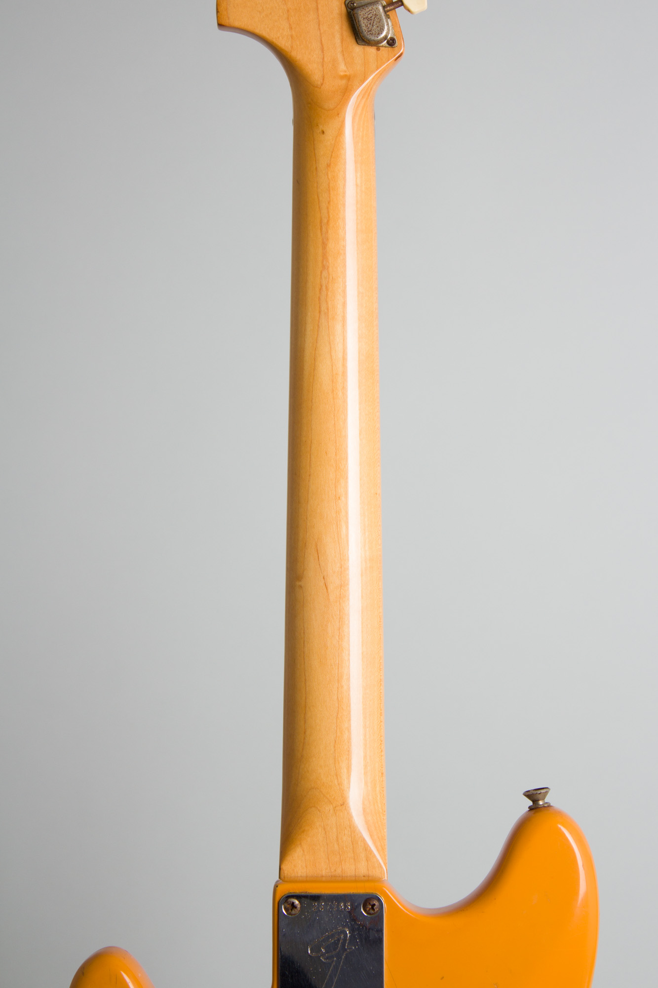 This one has a neck stamped MAR 69B, grey-bobbin pickups with a 1969 code and pots dated to the 42nd week of 1966, marking it as one of the first of the new style. Competition Mustangs were available for a few years from spring 1969 into the early '70s and sold well, but are not as plentiful as the 1965-66 versions. The body had an added arm cut like a Stratocaster, but otherwise the splashier finish was the main attraction. Most other features stayed the same, including the snazzy pearloid pickguard, "Dynamic" trem unit with a 6-barrel floating bridge. The 24" scale neck has a slightly heavier finish, but still not the armor-coat of Polyester of the 1970s.