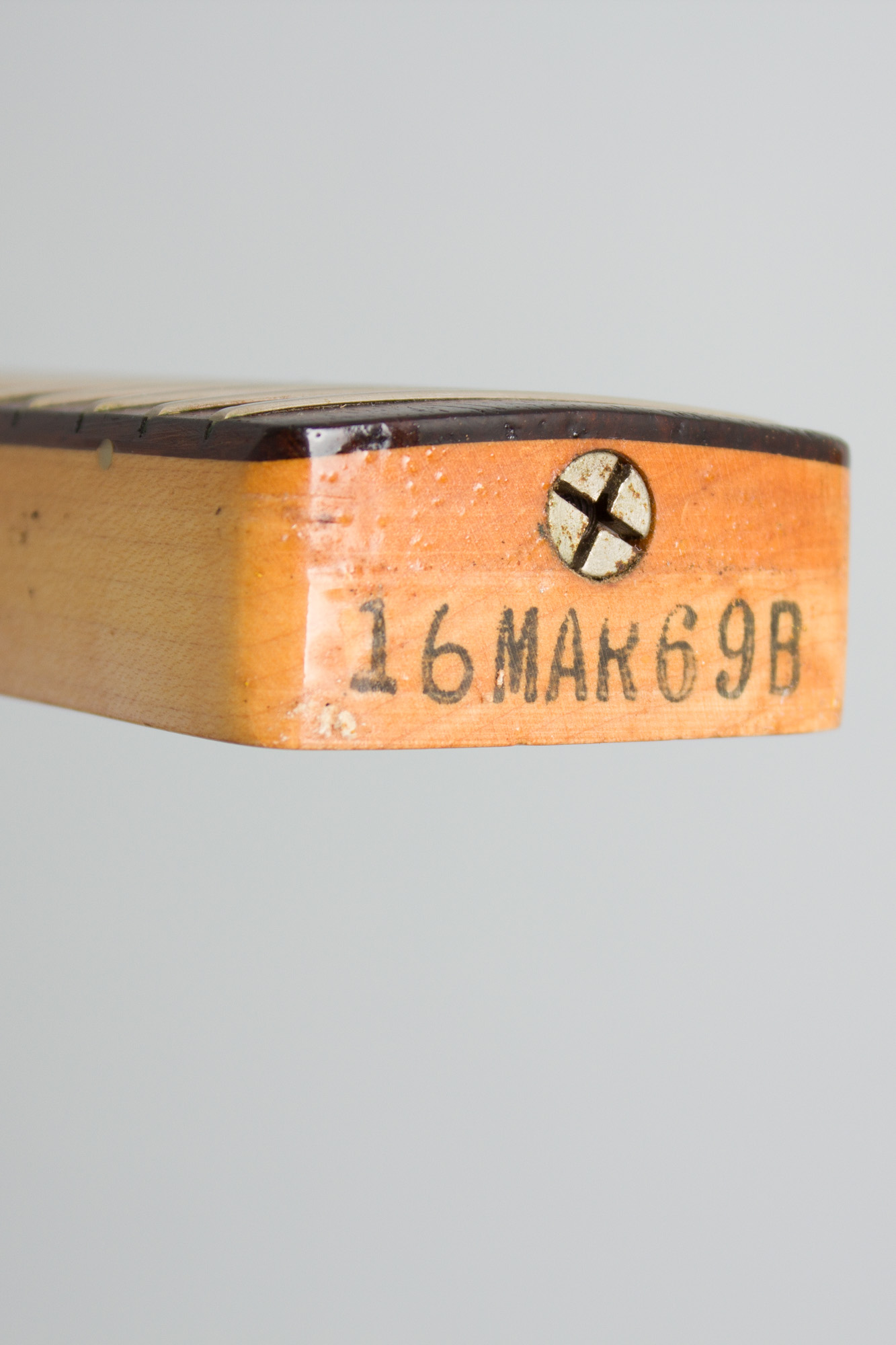 The pickups and electronics remain untouched original. The pearloid pickguard shows less shrinkage than most, and has only a tiny incipient crack on the front tip, no broken corners as many do. The original hardware is relatively clean with some light corrosion, mostly to the bridge base and neck screws. Someone turned the volume knob a lot, and wore into the plating behind it.