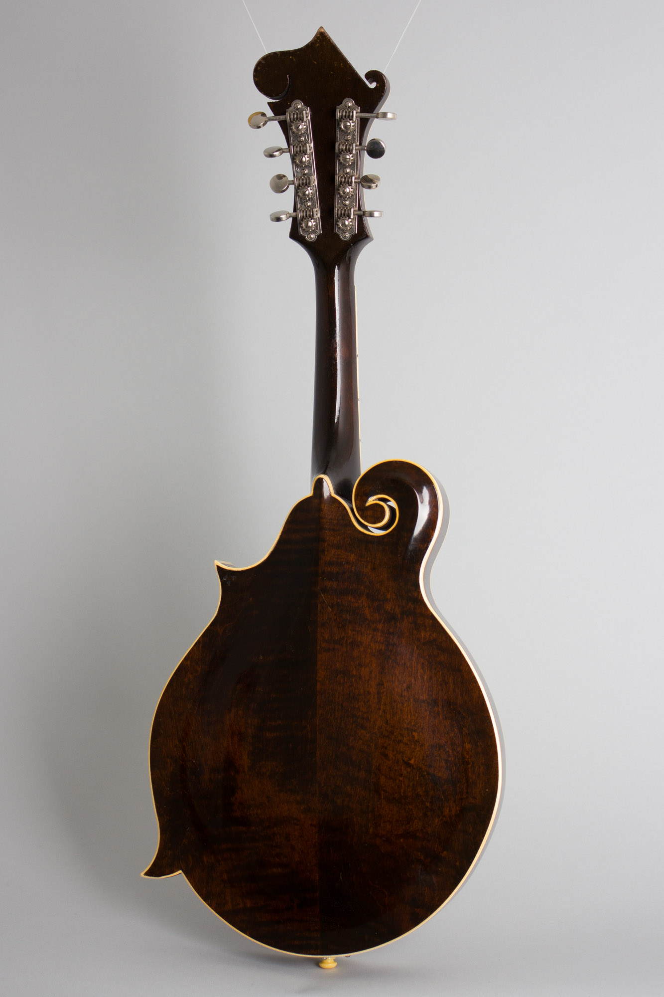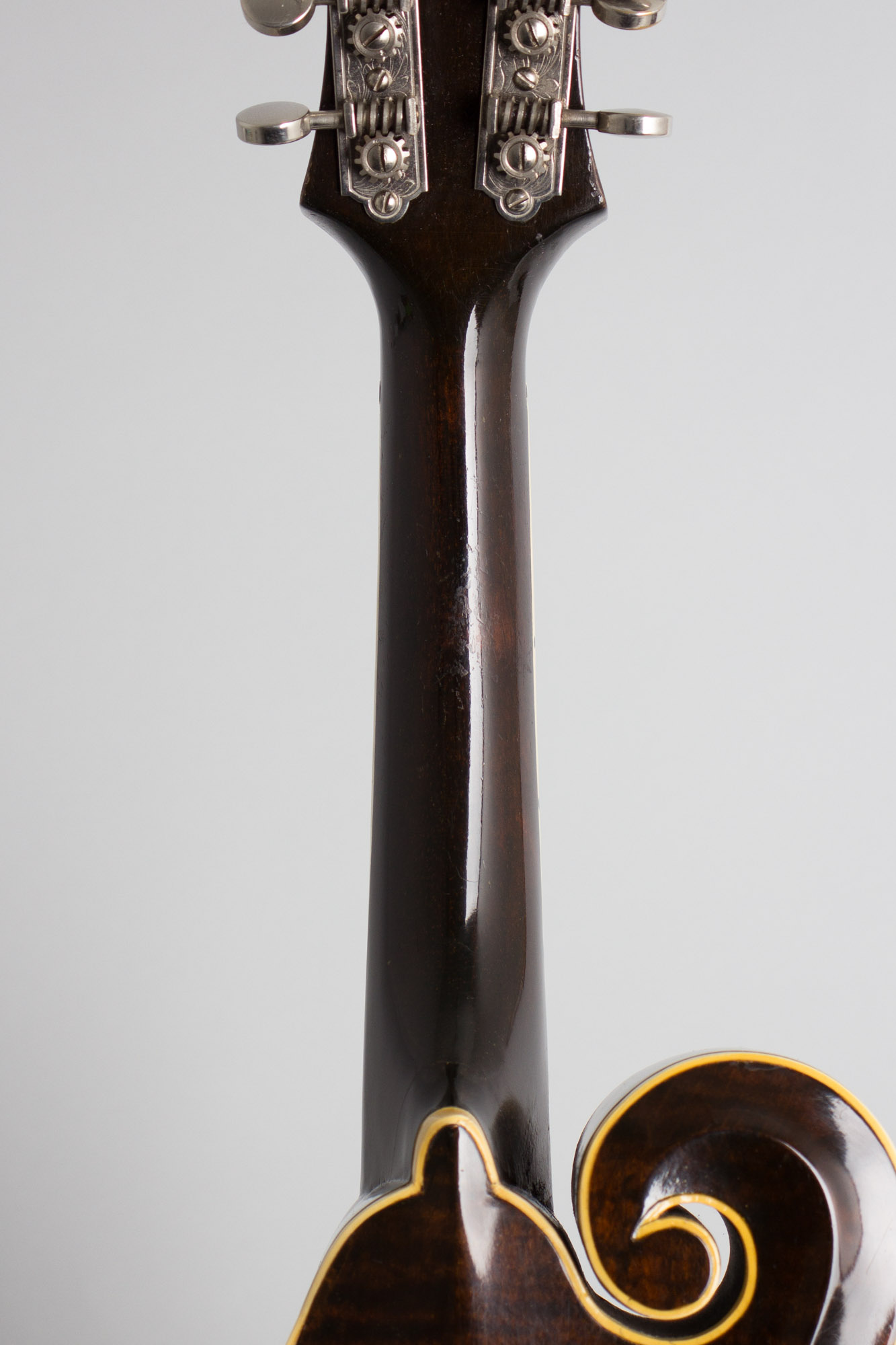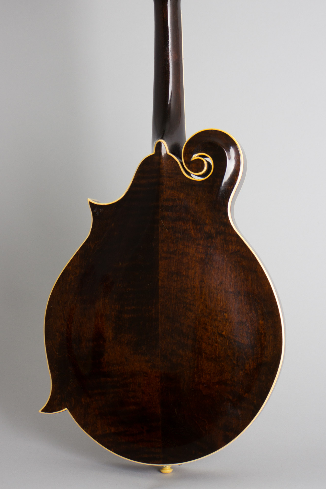The structural design of this trio of instruments is a bit odd to modern eyes as they combine the f-hole, scroll body construction of the F-5 with the shorter neck of the older oval-hole F-4. The scale length is the same, but the neck is sunk further into the body, pushing the bridge further back towards the tailpiece. Despite this apparent oddity, the F-7 sounds great with a distinctive guttural bark, if not quite the full bright projection and note clarity of its longer-necked cousin. This is a fabulous mandolin for the player, and an uncommon find in a pre-war Gibson artist model. All of Bill Monroe's early recordings in the 1930's with his brother Charlie were cut with a 1935 F-7, and this instrument is fully worthy of that sonic heritage.