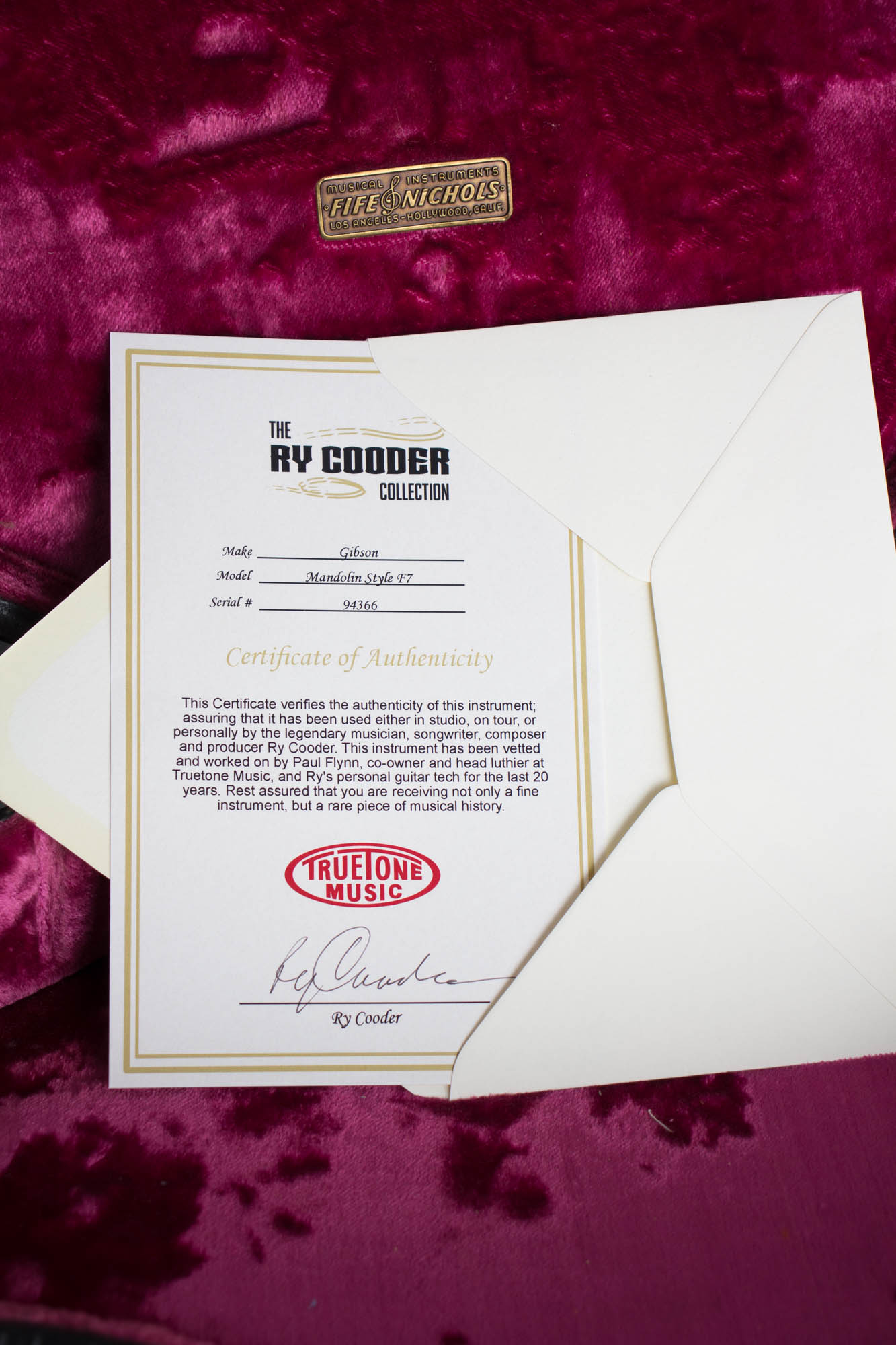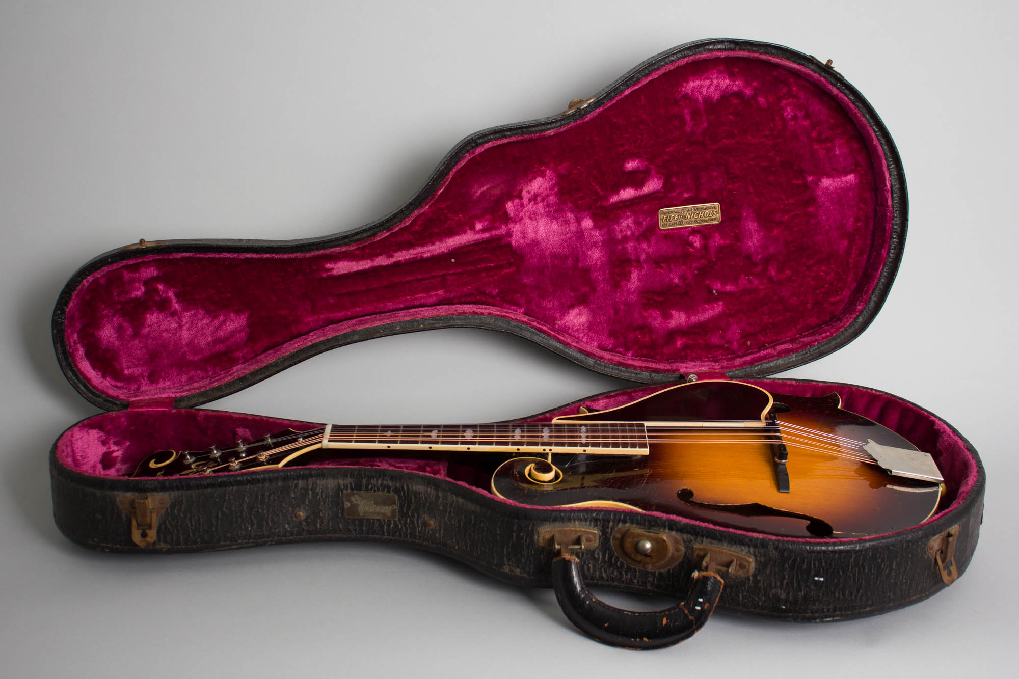 The mandolin is all original except the bridge top, which is a modern reproduction. There is a patch on the top edge od the pickguard where it was likely notched for a pickup. Playability remains excellent, with the original frets still intact just taken down slightly. This mandolin has a fabulous sound; it really does capture the character of the Monroe Brothers records! Especially considering the Ry connection this is one of the coolest Gibson mandolins we have had, which definitely has a unique character. It rests in a very nice pink-lined shaped Gibson hard case that dates to the just post-war era, sized for the longer neck F-5 and F-12. there is a small metal "Fife & Nichols" badge under the lid, showing it was originally sourced from this well-known Hollywood music store. Overall Very Good + Condition.