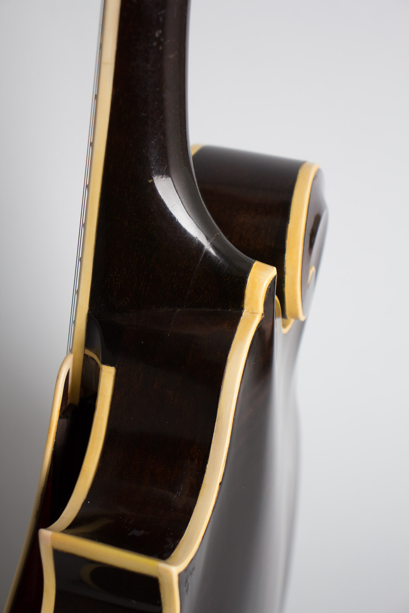 The rest of the finish shows pick marks and scrapes to the top, most notably on the scroll and area just below. There are some small dings showing a bit of fill-in in the below the bridge on the lower treble quarter, probably the marks of a DeArmond pickup control box. The rest of the instrument does not show as much wear as the top, with the back, sides and neck being comparatively clean.
