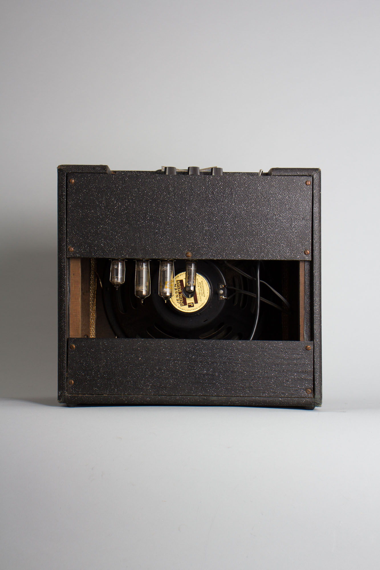 The simple control panel has three identical instrument inputs, volume, tone and tremolo controls. The tremolo is very nice and smooth, fixed depth with the control varying the speed. It otherwise has a tube compliment of one 12AX7 and another 6BM8 for preamp/tremolo/phase-inverter duties and a 6X4 rectifier; overall a similar compliment to another fantastic sounding little amp: the Kalamazoo Model Two, except with a little more power on tap! The U-45B is very lightweight - super for recording or a smaller sessions where you need crisp cleans or a nice overdrive at low volume.