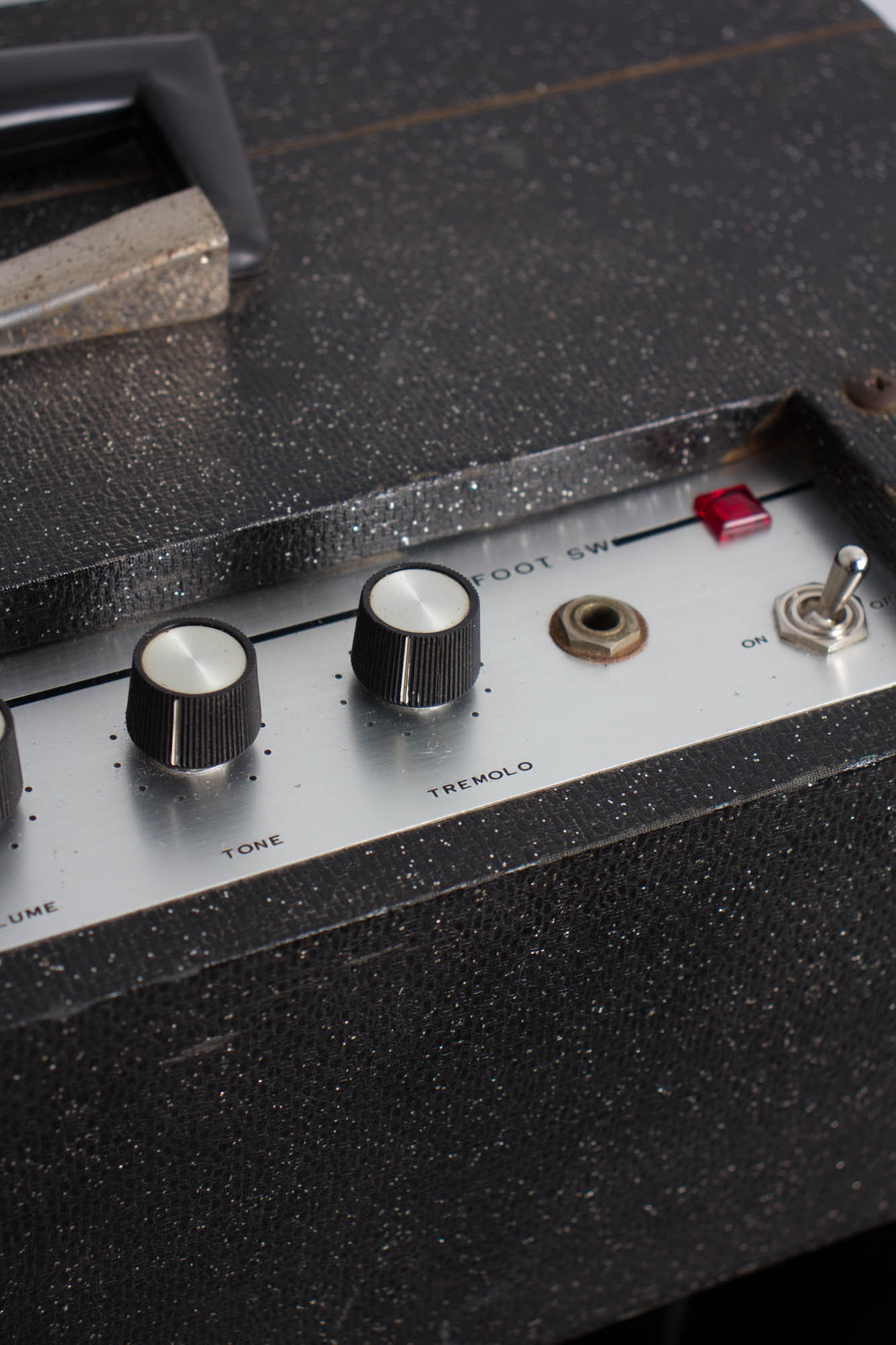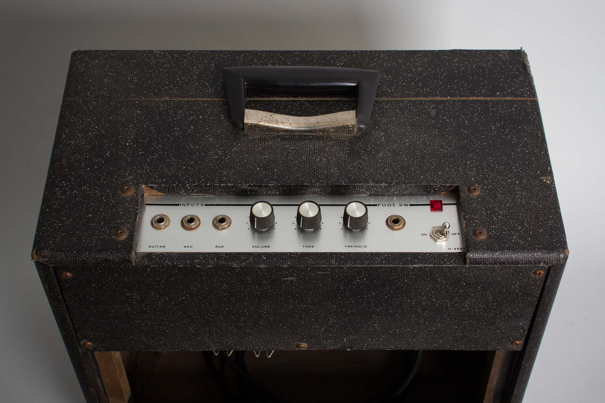 This fabulous little tone monster is the original version of one of Univox's first early-to-mid 60's creations. The U-45 was the "junior" of two similar models; this U-45B is the more deluxe version. Both were built with chassis sourced from Japan using Japanese caps, pots and transformers, but assembled here in the US with RCA tubes and Jensen speakers. The slightly higher-powered U-45B was optimistically cataloged to as a bass model, though the only difference is the use of multifunction 6BM8 tubes allowing for a typical push-pull arrangement yielding around 10 watts of power.