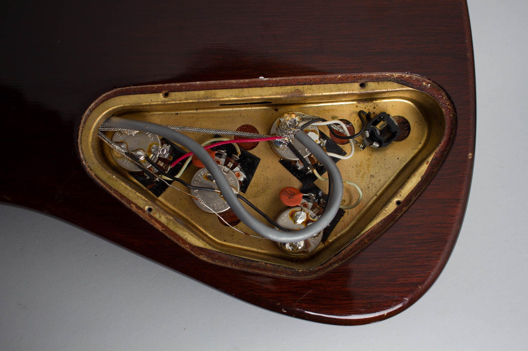 The visible pot codes date to the 3-something week of 1965 (all are at least partially soldered over) the serial number 513XXX is a series used repeatedly by Gibson in the 1960s but the features on the instrument suggest shipment in late 1965 or early 1966. The knobs are the older capped early '60s style pieces, usually replaced by "Witch Hat" style in 1966-7. The nut width is the 1965 and later 1 1/2" shared by all second generation Firebirds, narrower than earlier "reverse" Firebird necks but overall not as insubstantial-feeling as many super-skinny period SG necks.