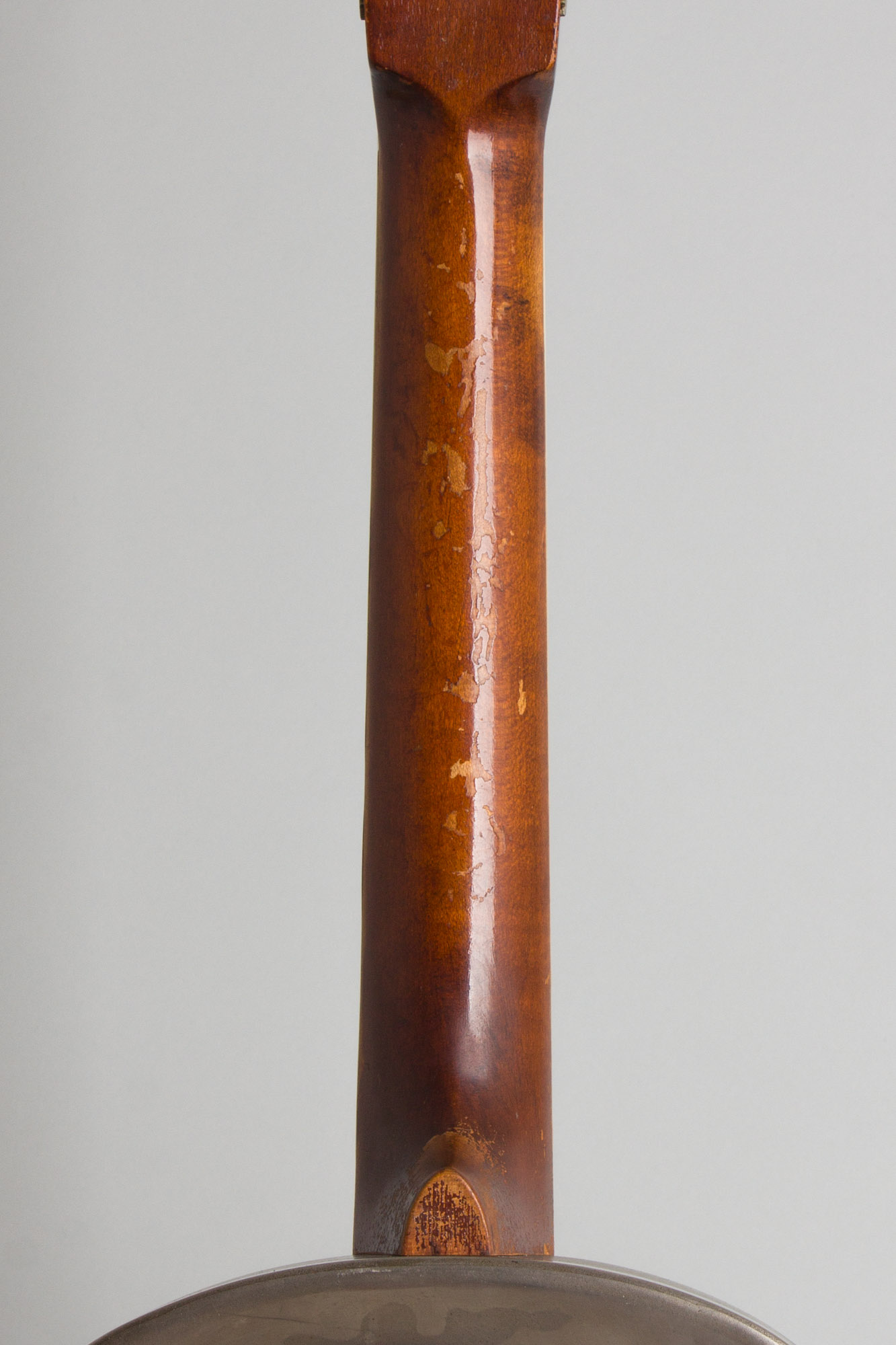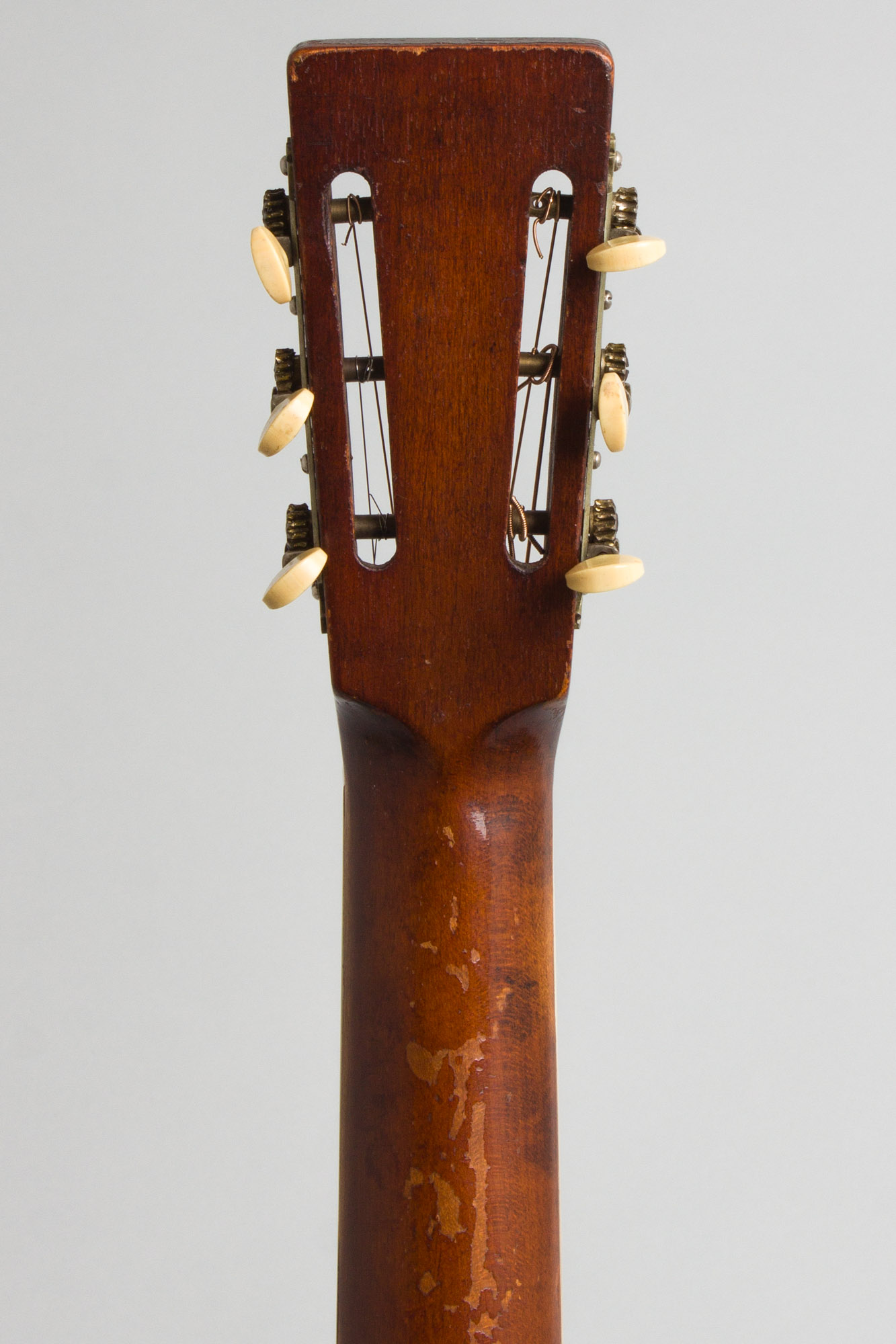 The "ebonized' fingerboard has wear down to the underlying maple at both ends; the frets appear original with less wear than one would expect. The neck has been neatly reset and the angle is good. The cone and biscuit are original, the maple saddle is newer. The tuners are period but not original; they are fairly fancy strip machines but we don't know what they came off of! This is a fine playing and sounding Style 0, set up to be compatible for either standard or Delta style with the action fairly low at 4/32" at the 12th fret. Despite (or maybe because of) the wear this is one of the cooler Style 0's we have seen in a while, a very early depression era survivor with a lot of vibe in a modern HSC. Overall Very Good + Condition.